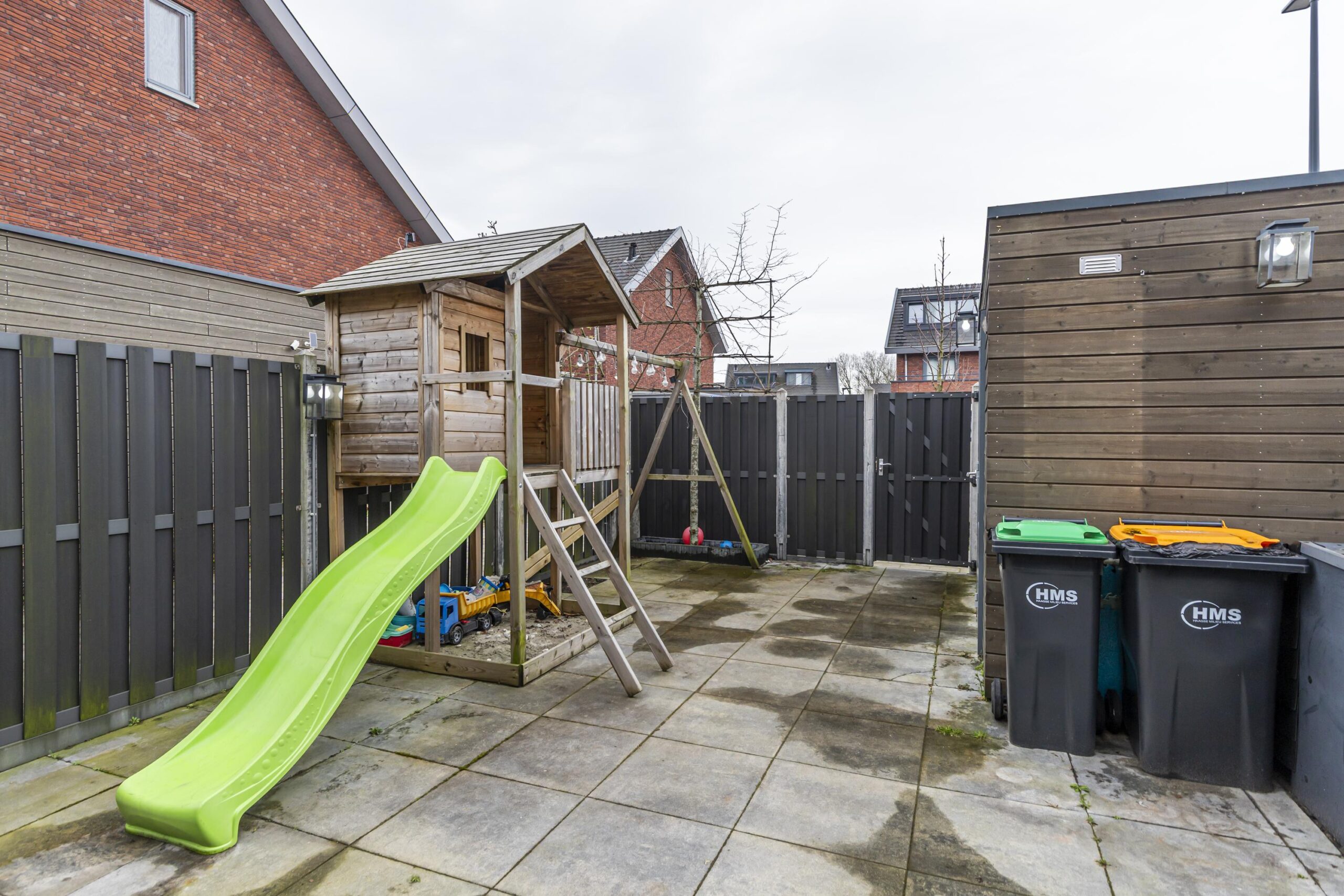 De achtertuin is bereikbaar via de schuifpui in de woonkamer en via het parkeerterrein aan de achterzijde. De tuin is aan beide zijden netjes omheind met een schutting. Achterin staat een houten berging met elektra en wateraansluiting, ideaal voor het stallen van fietsen en tuingereedschap.