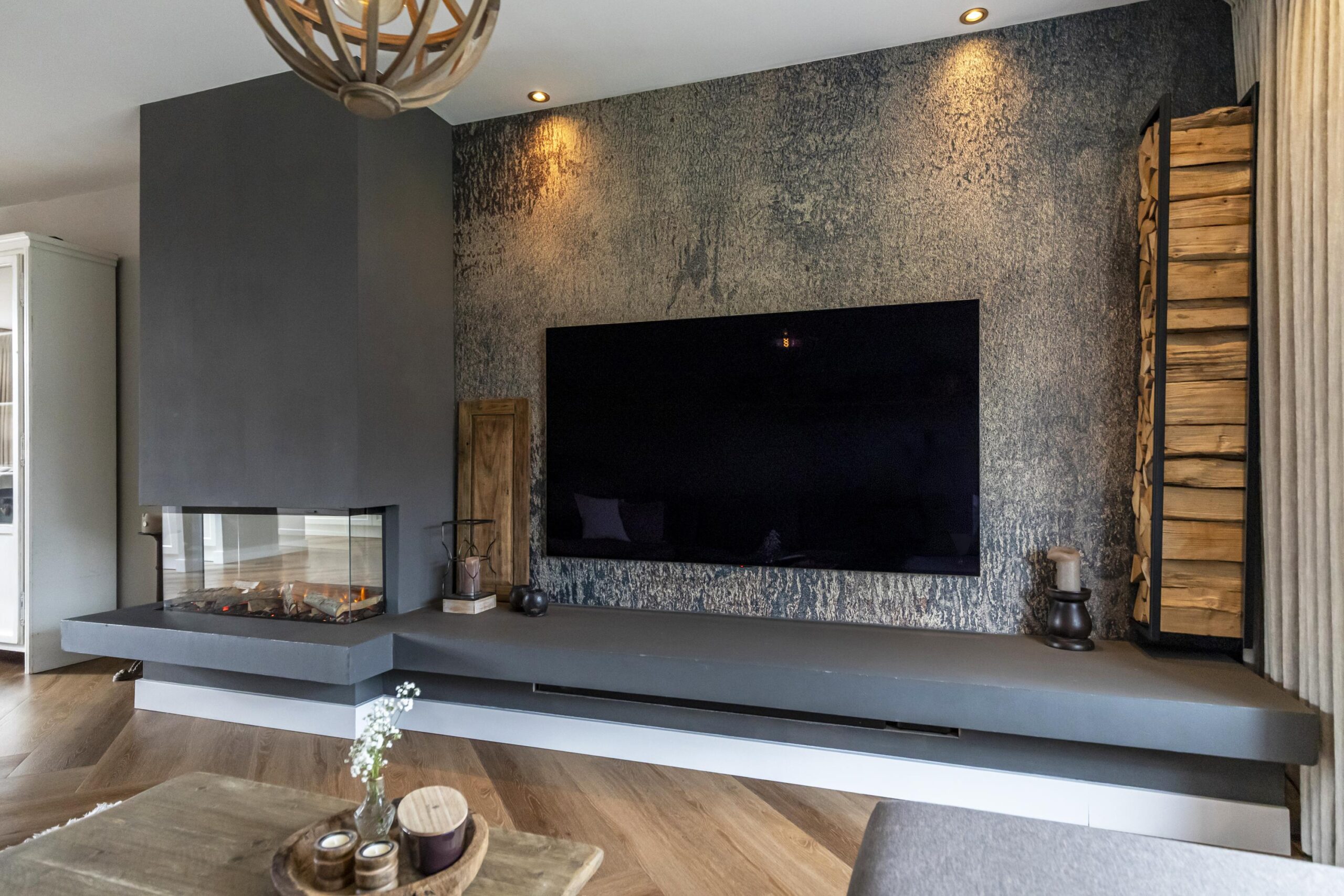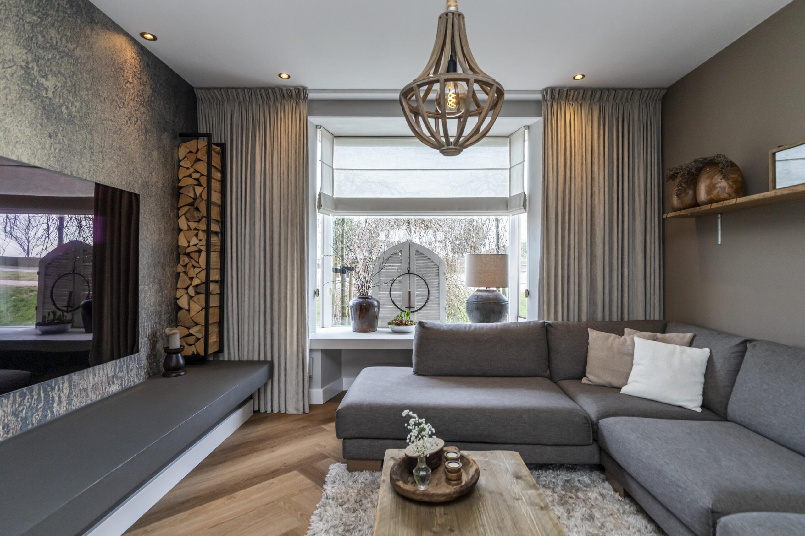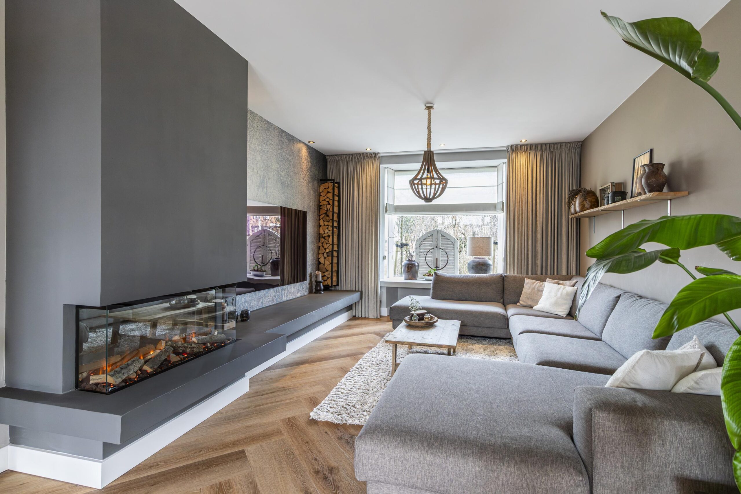De woonkamer bevindt zich aan de voorzijde en heeft een warme uitstraling dankzij de erker en de elektrische haard, die niet alleen sfeer geeft maar ook kan verwarmen.