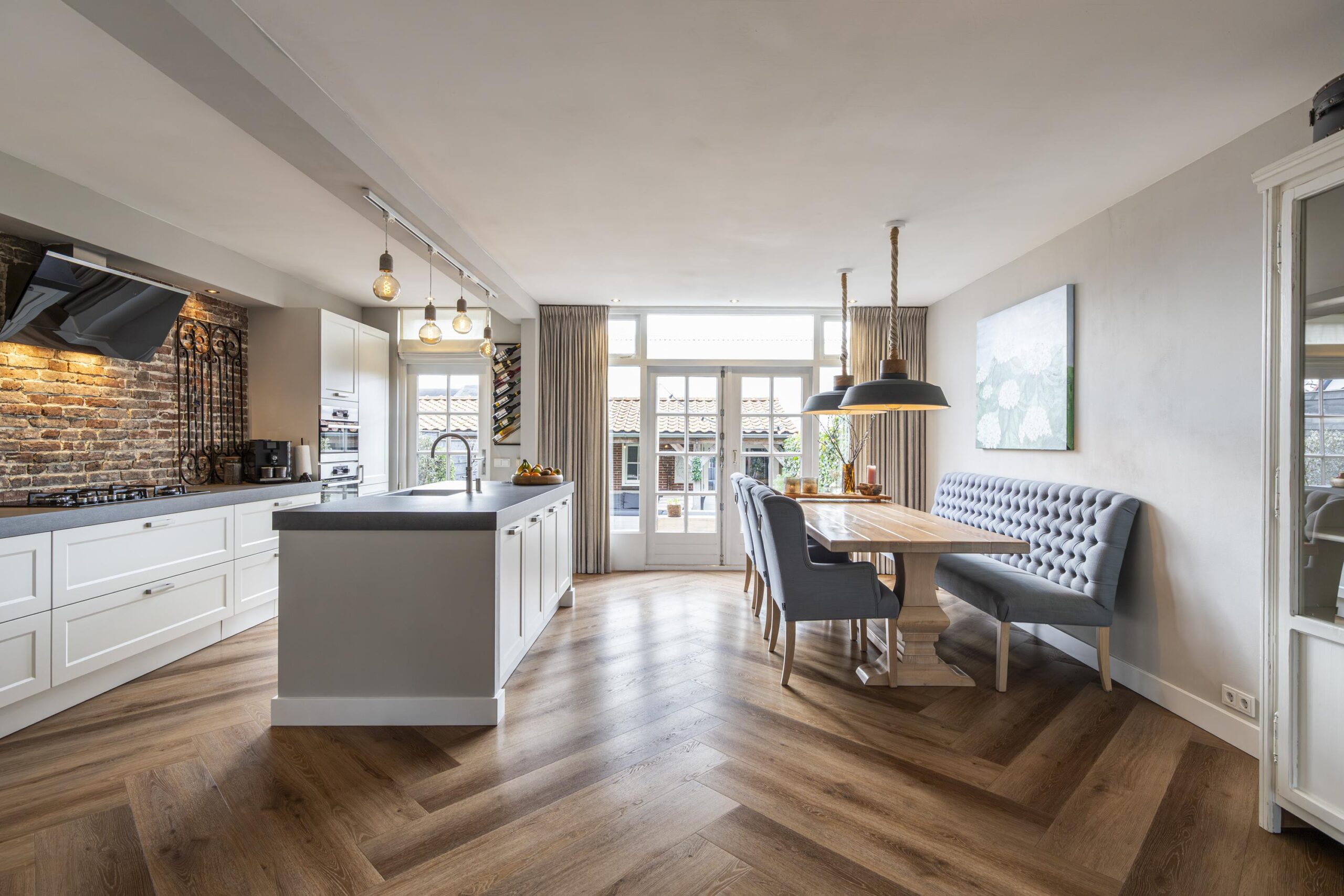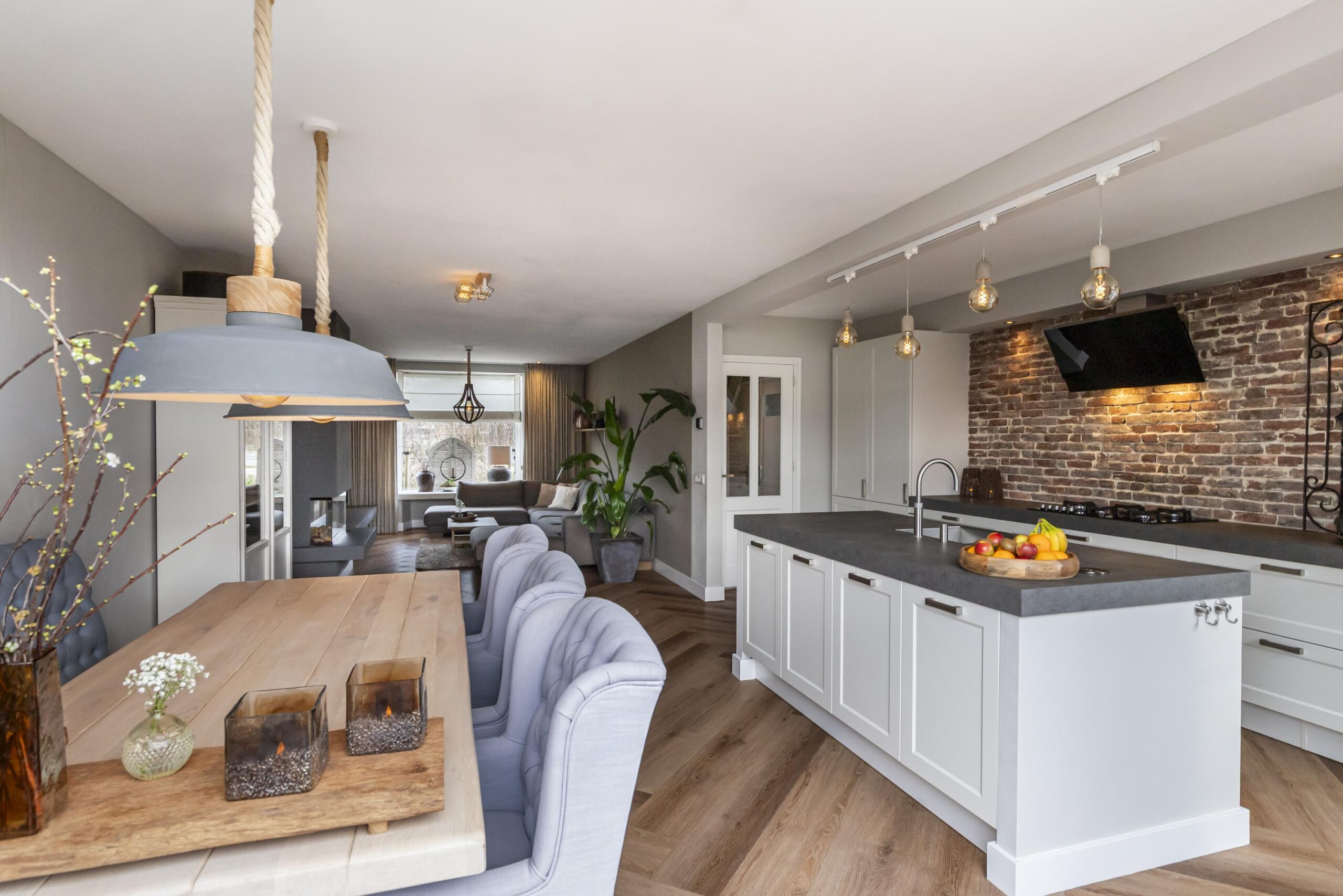 Aansluitend bevindt zich de eetkamer, een fijne plek om uitgebreid te tafelen. De wanden en plafonds op de begane grond zijn strak gestuct en dragen bij aan de verzorgde en luxe uitstraling. Het geheel oogt stijlvol en klopt tot in detail.