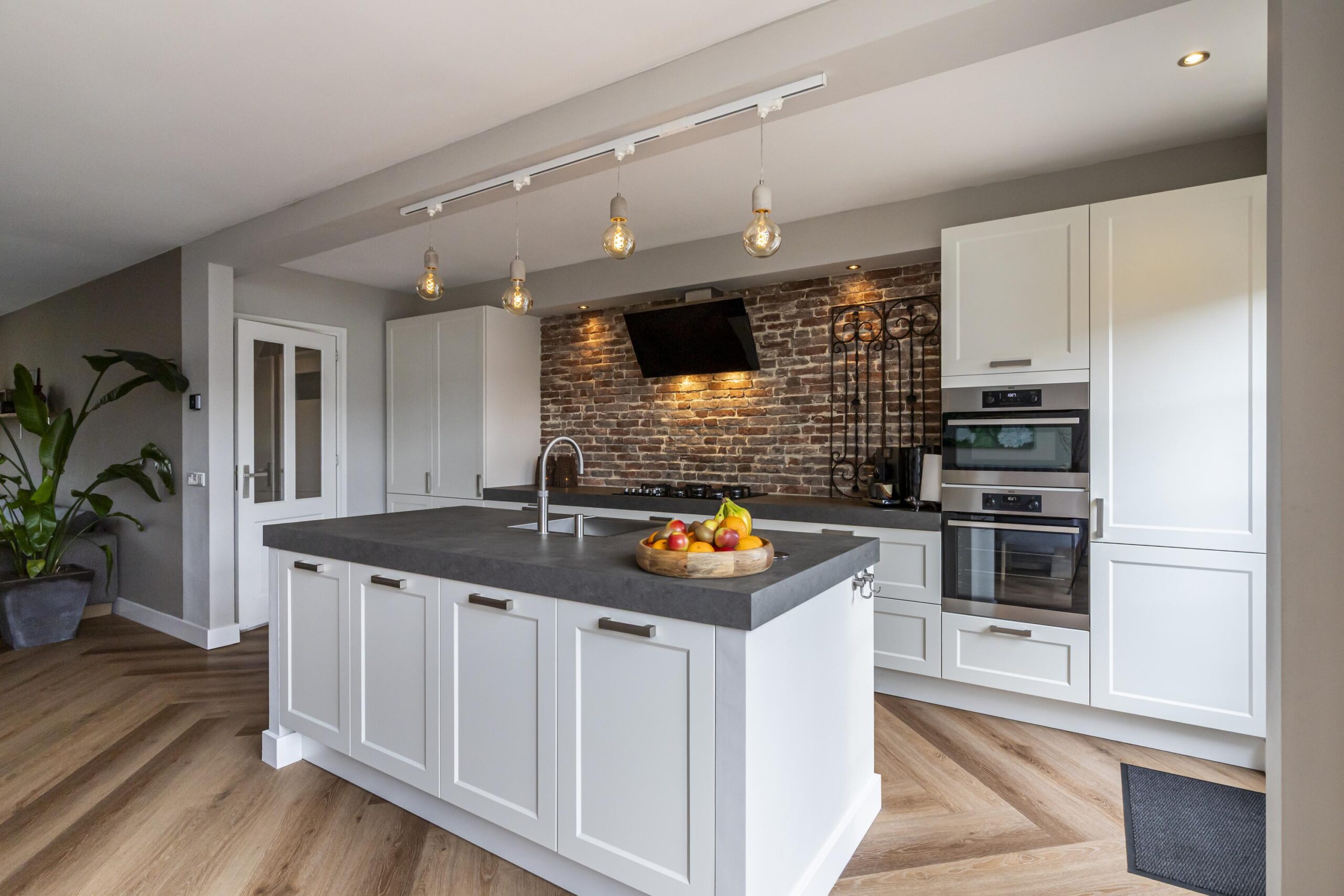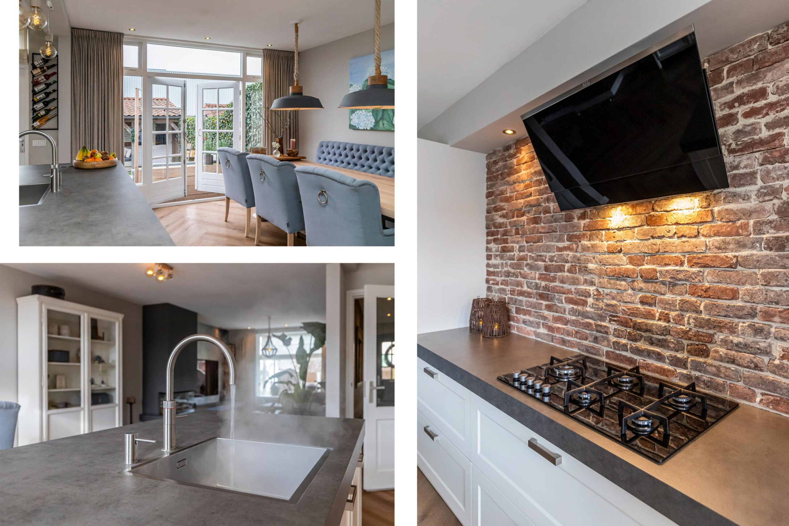 Aan de achterzijde ligt de open keuken met spoeleiland en diverse inbouwapparatuur, waaronder een Quooker, vaatwasmachine, combimagnetron, combi oven, grote koelkast, vriezer met zeven lades en een 5 pits gaskookplaat op glas.