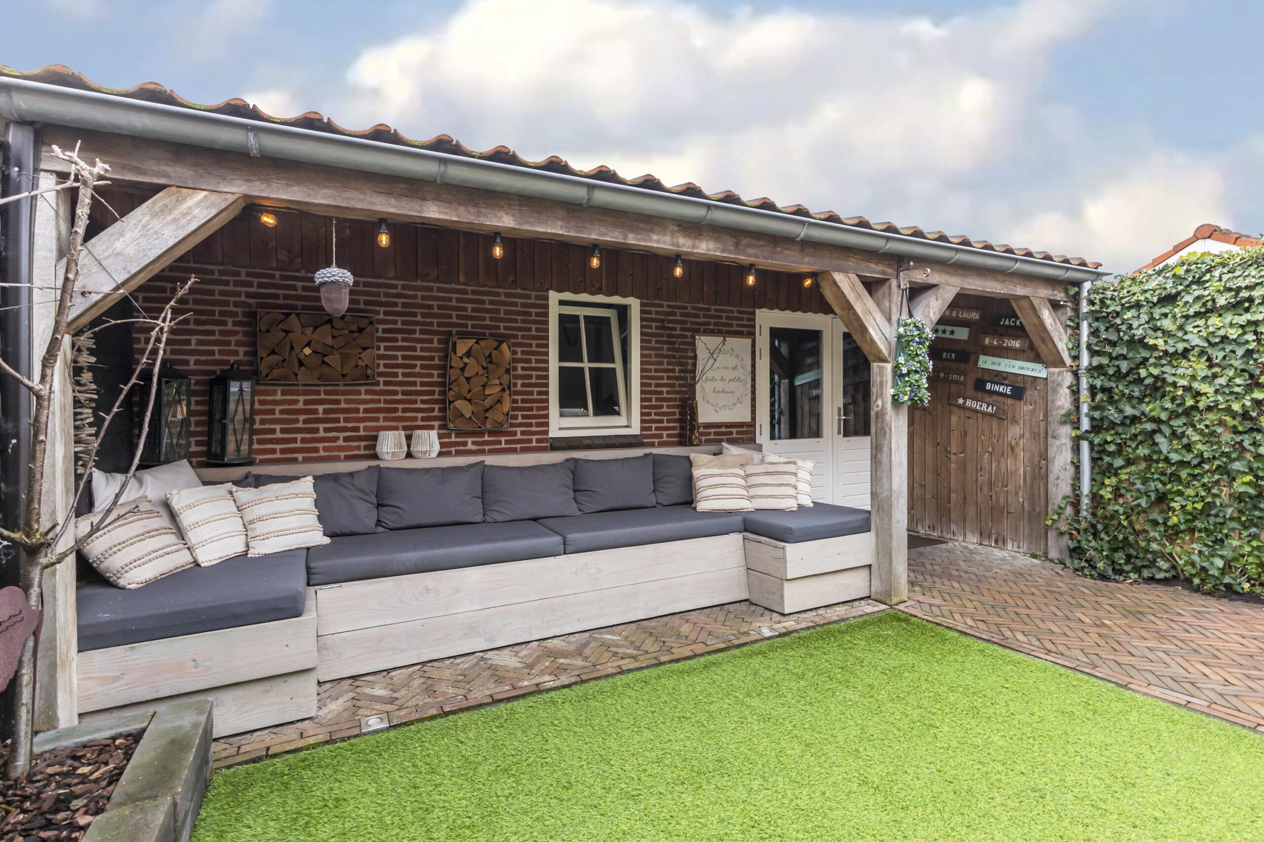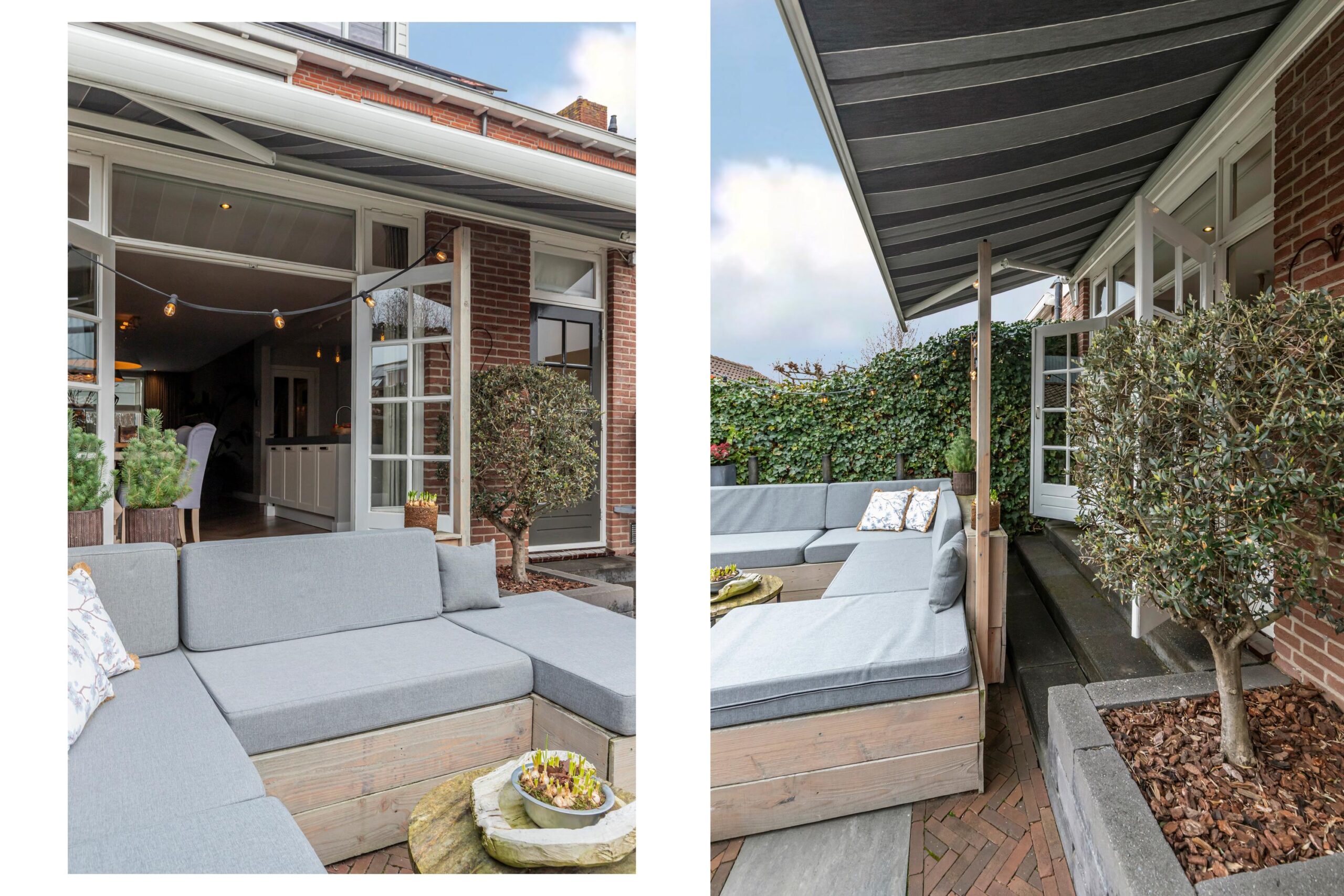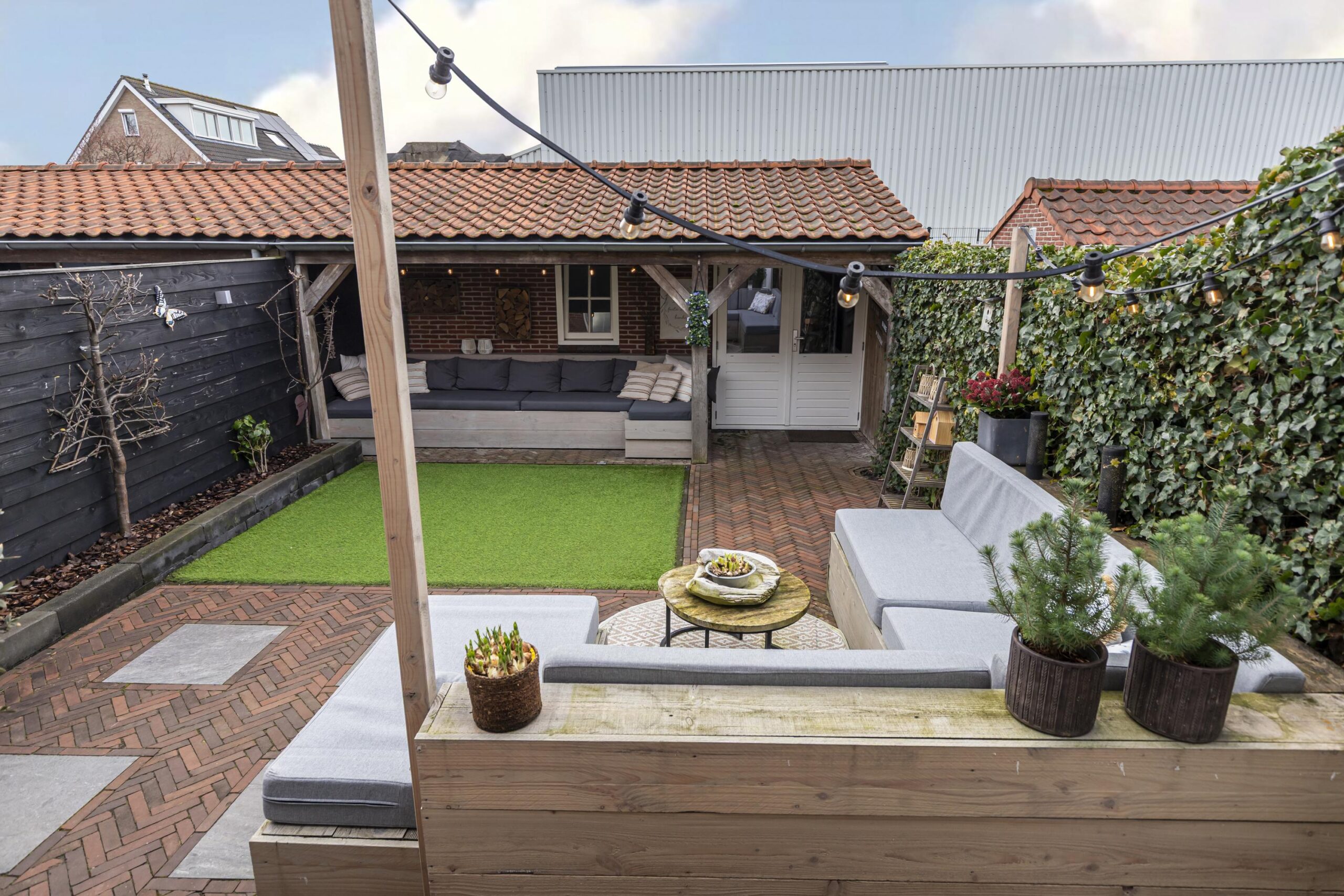 Achterin bevinden zich de berging en de overkapping, een fijne plek om tot in de avond buiten te zitten. Via de achterom is de tuin praktisch bereikbaar.