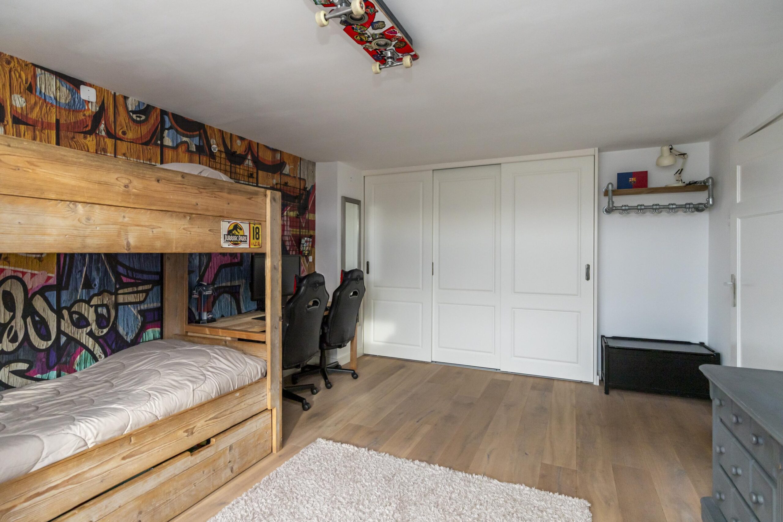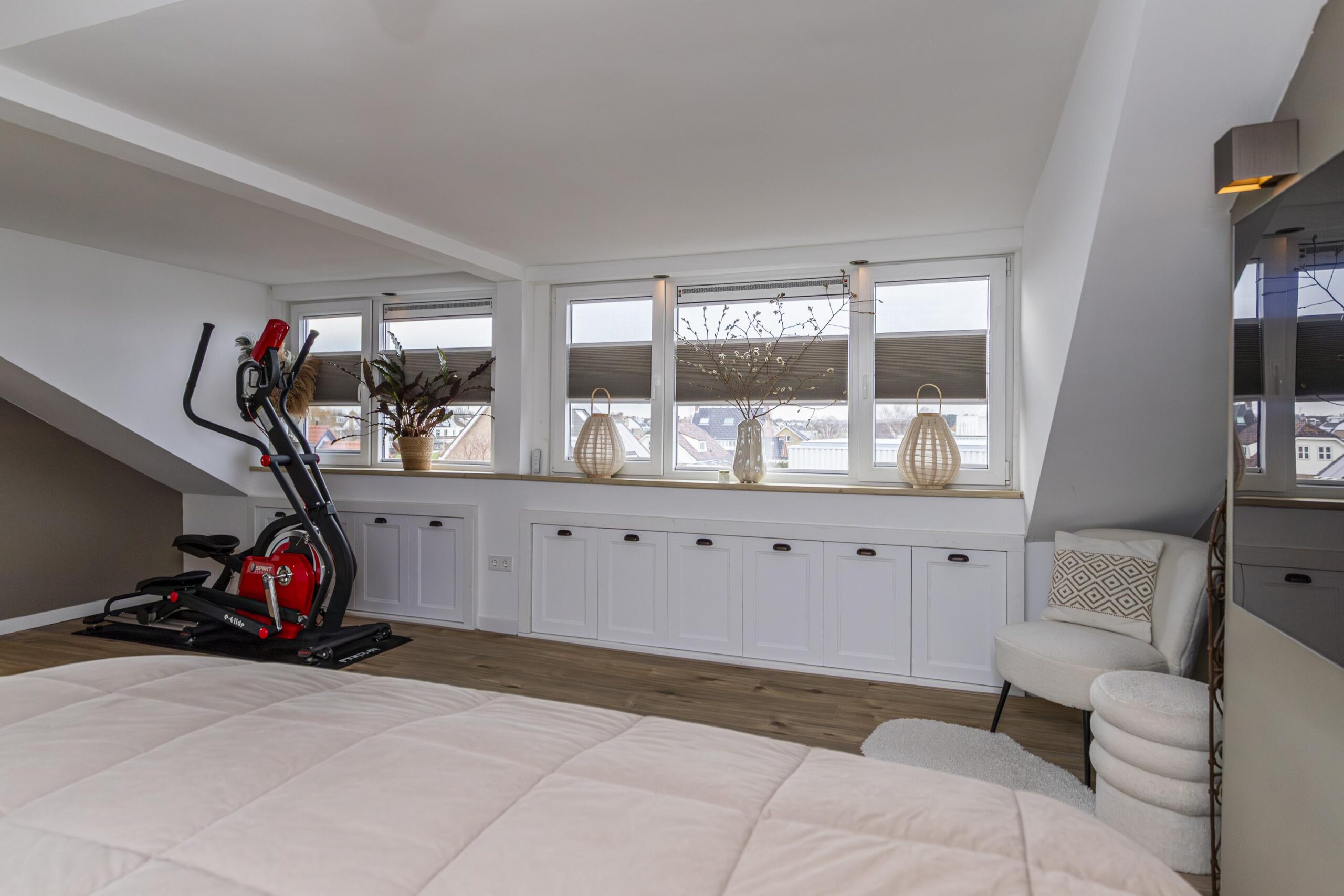 Hier bevindt zich een ruime slaapkamer met rolluiken, een inbouwkast en voorbereiding voor airco. De knieschotten zijn netjes afgewerkt en bieden praktische bergruimte.