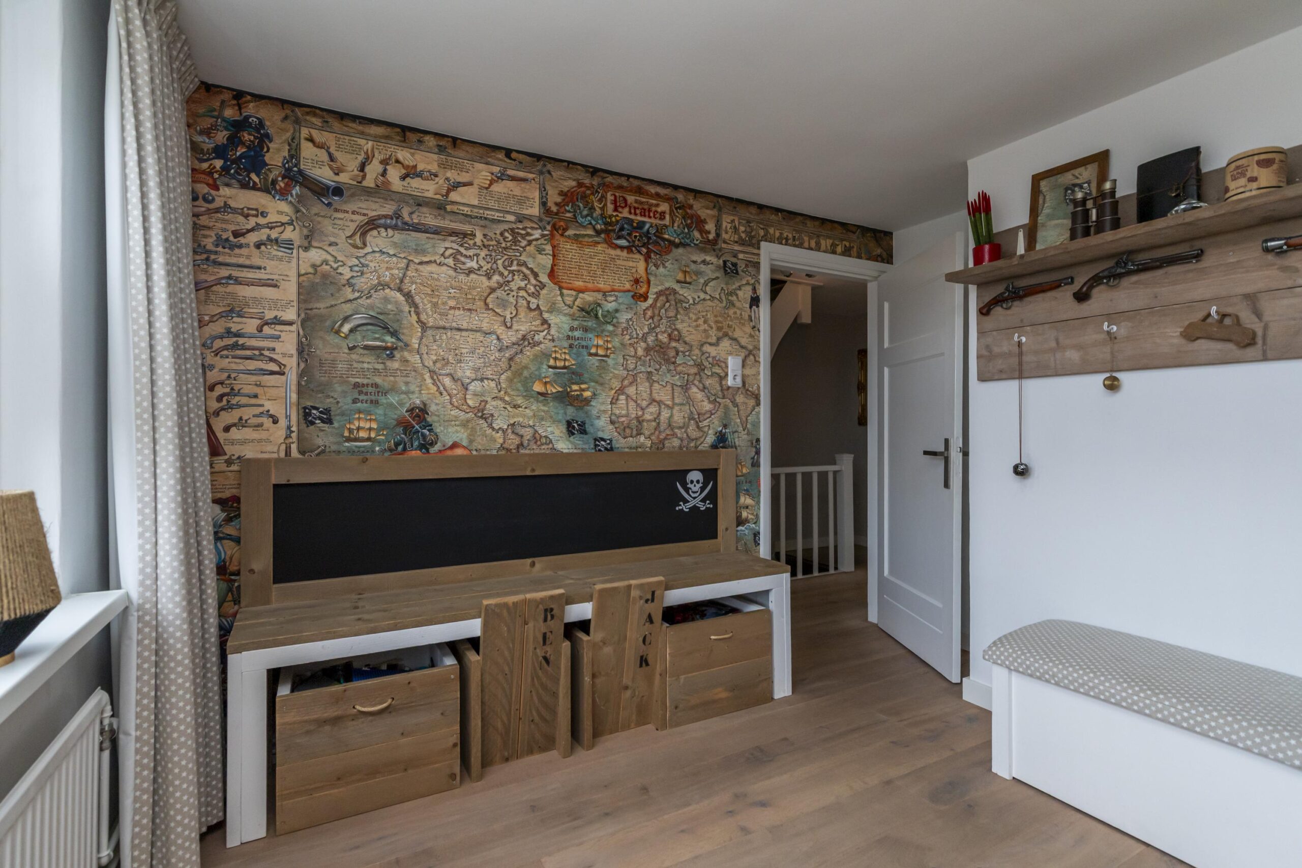 De overloop biedt toegang tot alle vertrekken. Aan de voorzijde ligt de eerste slaapkamer, voorzien van inzethorren en op maat gemaakte plisségordijnen.