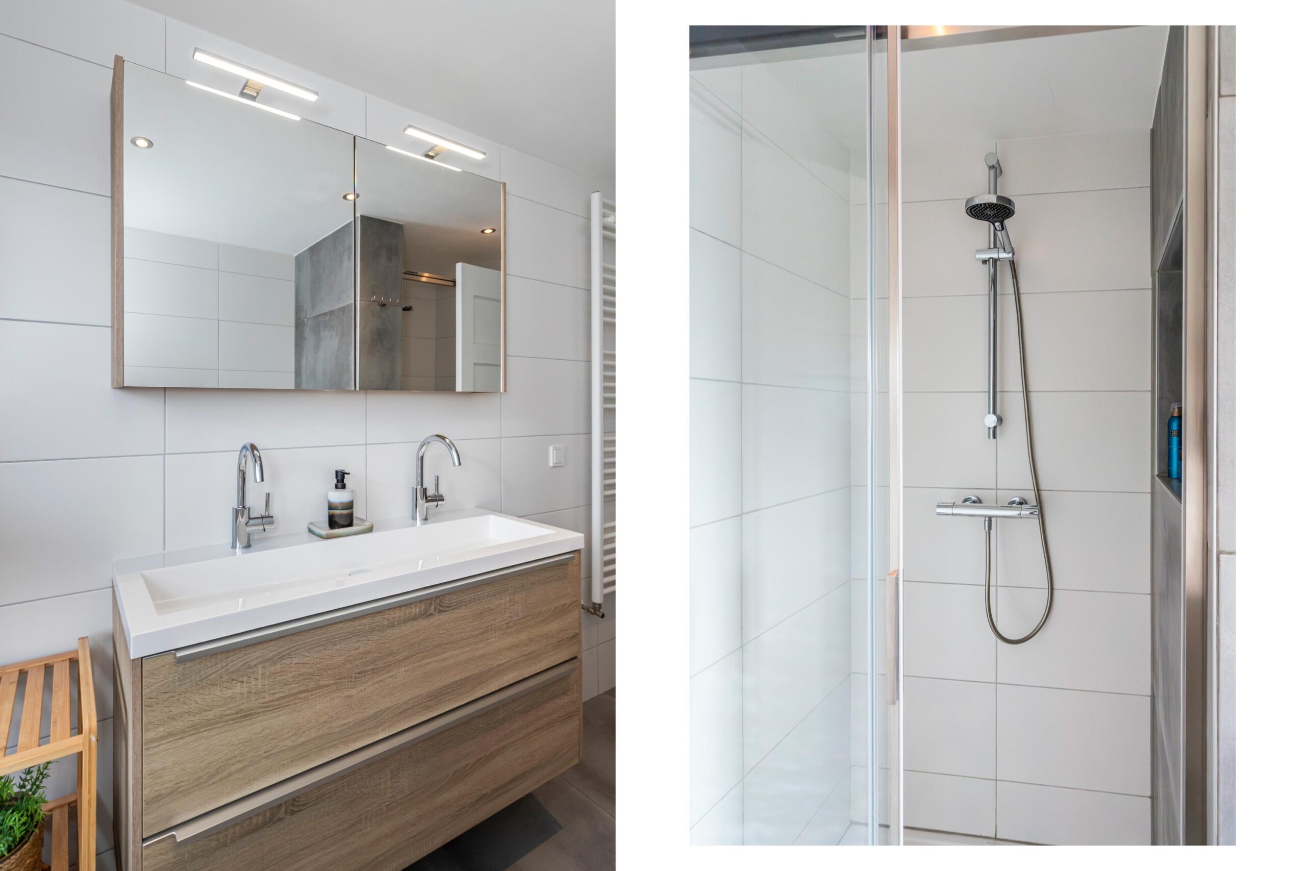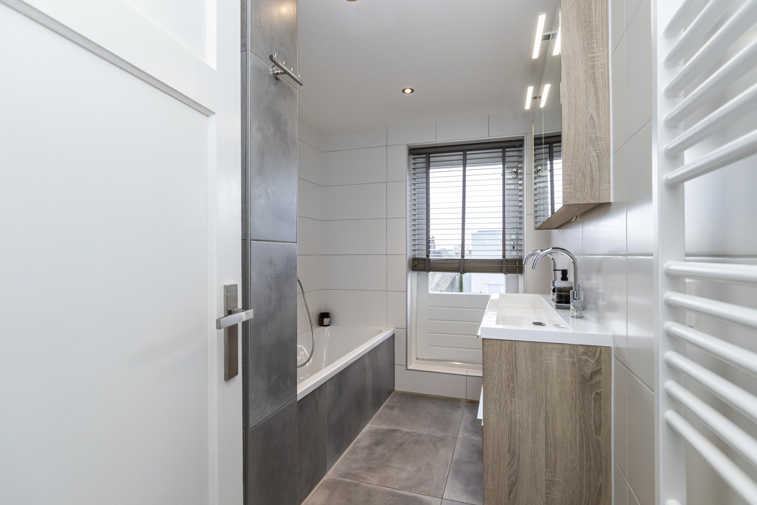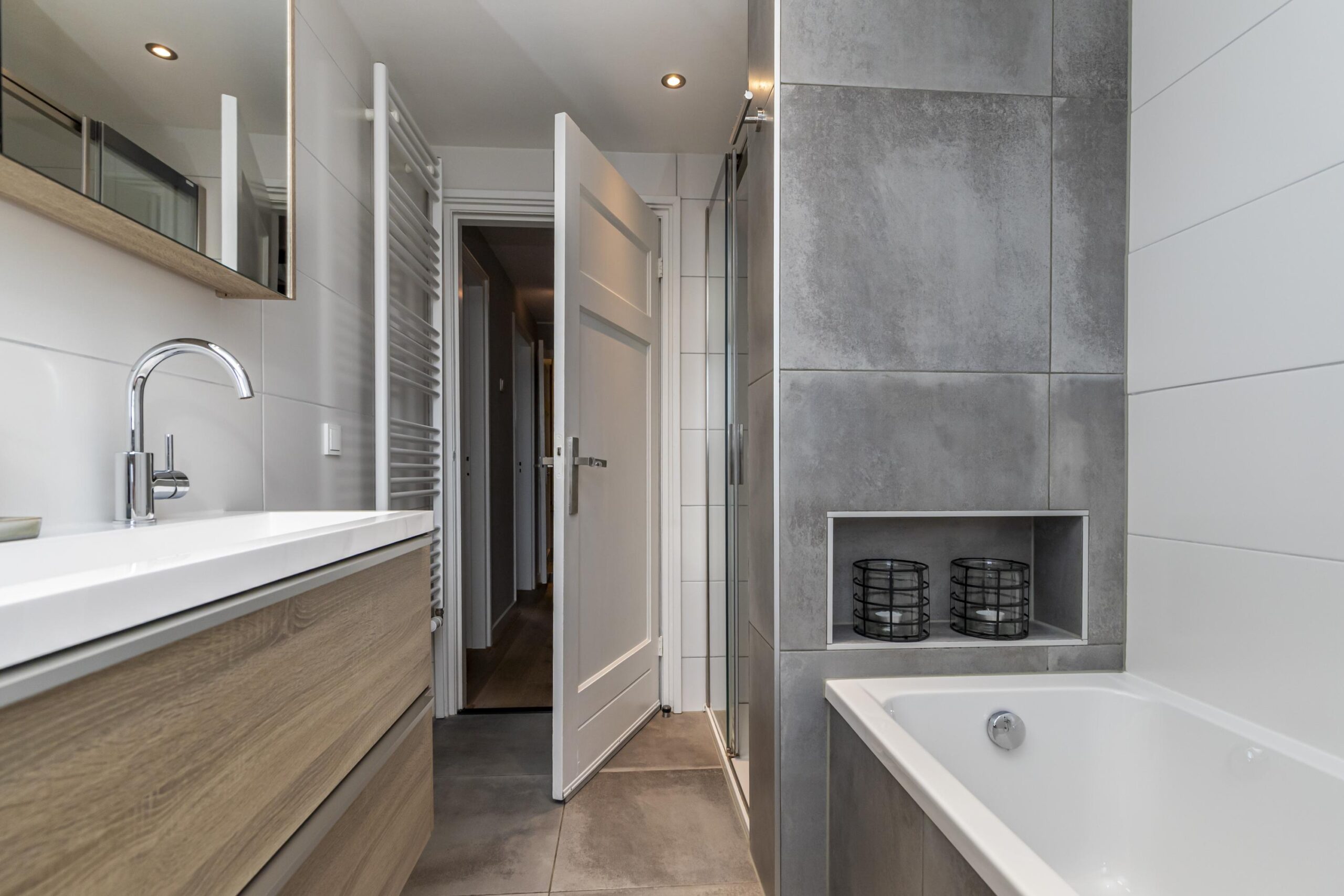 De badkamer is luxe uitgevoerd met grote tegels en een groot raam dat zorgt voor prettig daglicht. De ruimte is voorzien van een ligbad, inloopdouche, dubbele wastafel met meubel en een handdoekenradiator.