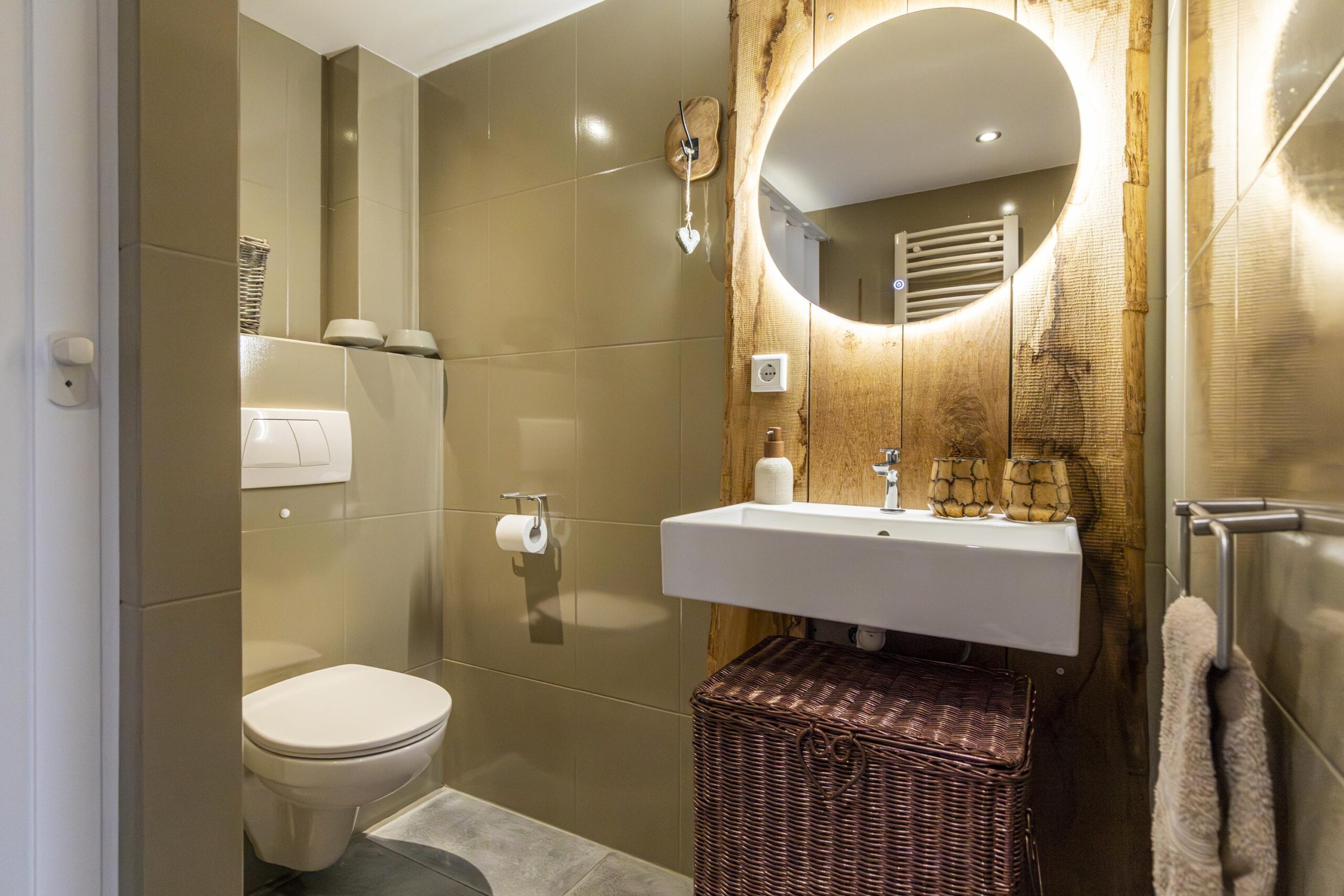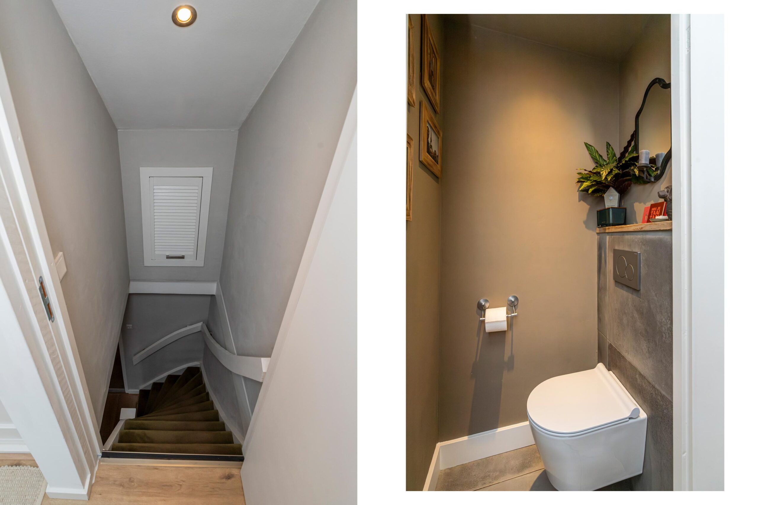 Aan de voorzijde bevindt zich de separate wasruimte met aansluitingen voor wasmachine en droger, een tweede toilet, een wastafel en een handdoekenradiator. Ook hier is de afwerking verzorgd en eigentijds.