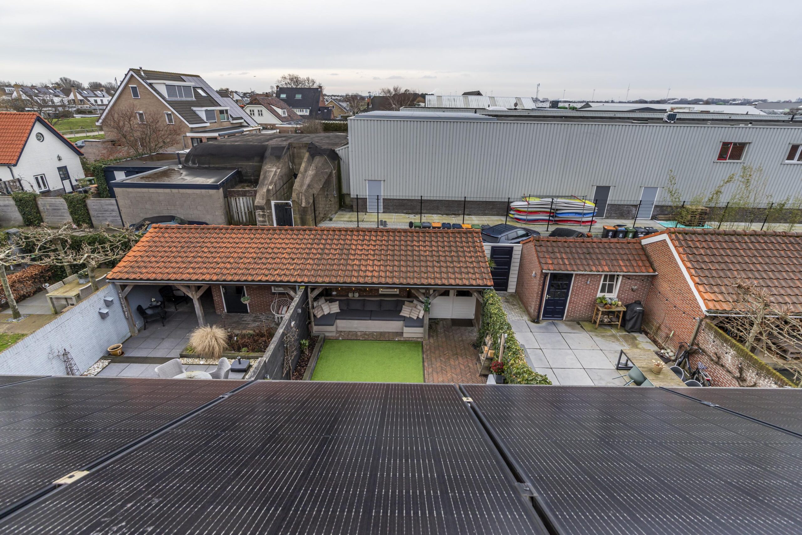 Via de openslaande deuren stap je de achtertuin in. Aan de achtergevel is een elektrisch bedienbaar zonnescherm geplaatst. De vrijstaande berging met overkapping is over de volle breedte van het perceel gebouwd en beschikt aan zowel de tuinzijde als de achterzijde over openslaande deuren. In de berging is de elektrische voorbereiding voor de aansluiting van een tweede laadpaal of een thuisbatterij aanwezig.