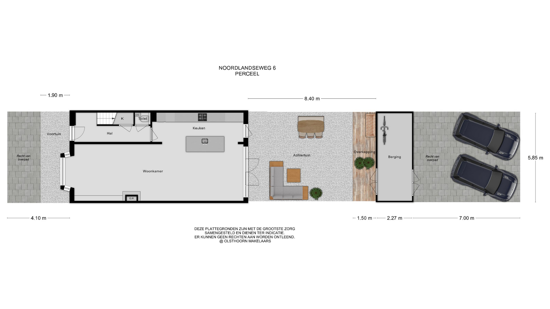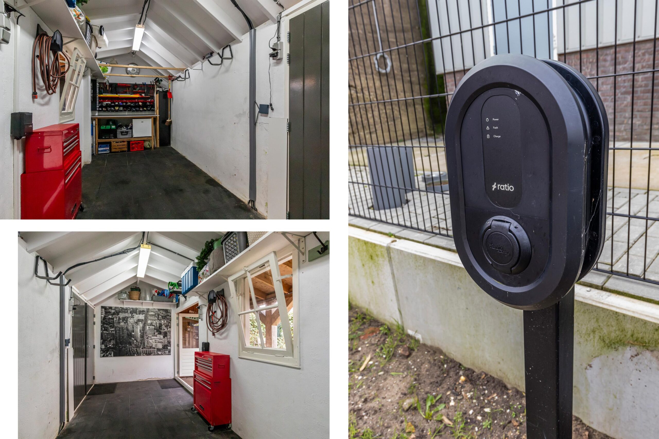 Via de achterom in de berging bereik je het terrein achter de woning, met de mogelijkheid om twee auto’s te parkeren. Hier bevindt zich tevens een privé laadpaal.