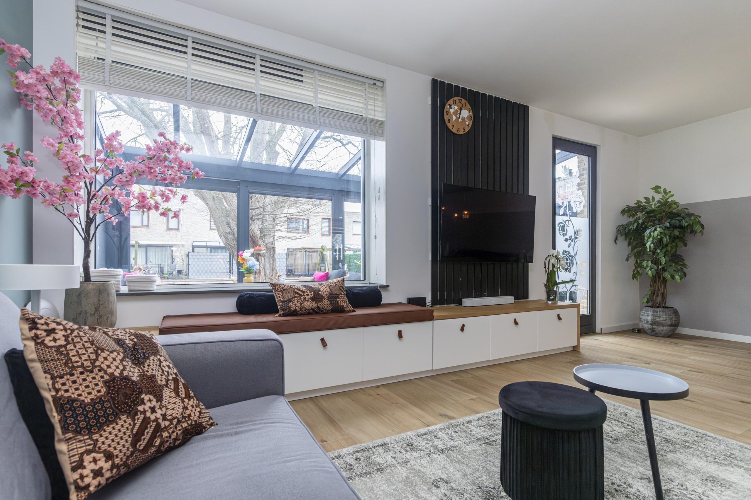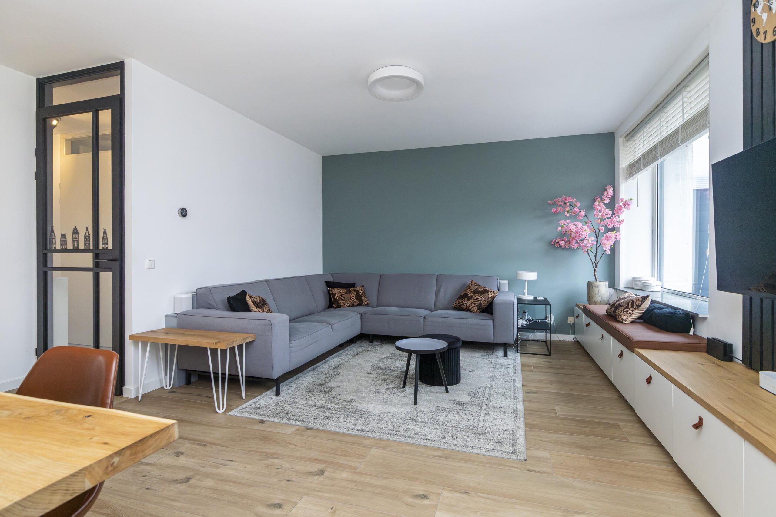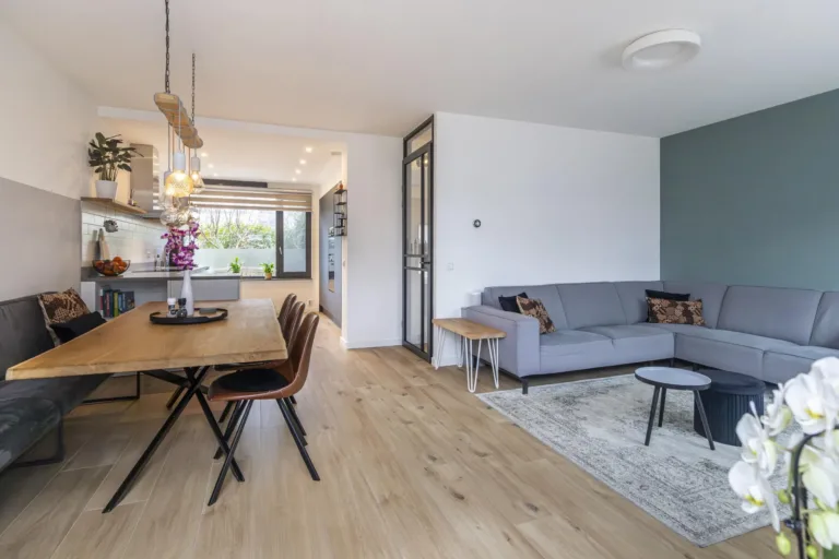 De woonkamer bevindt zich aan de achterzijde en is ruim opgezet met een prettige lichtinval. Vanuit hier is er toegang tot de serre, die fungeert als een fijne verlenging van de leefruimte. De serre vormt een prettige verbinding met de gemeenschappelijke tuin aan de achterzijde.