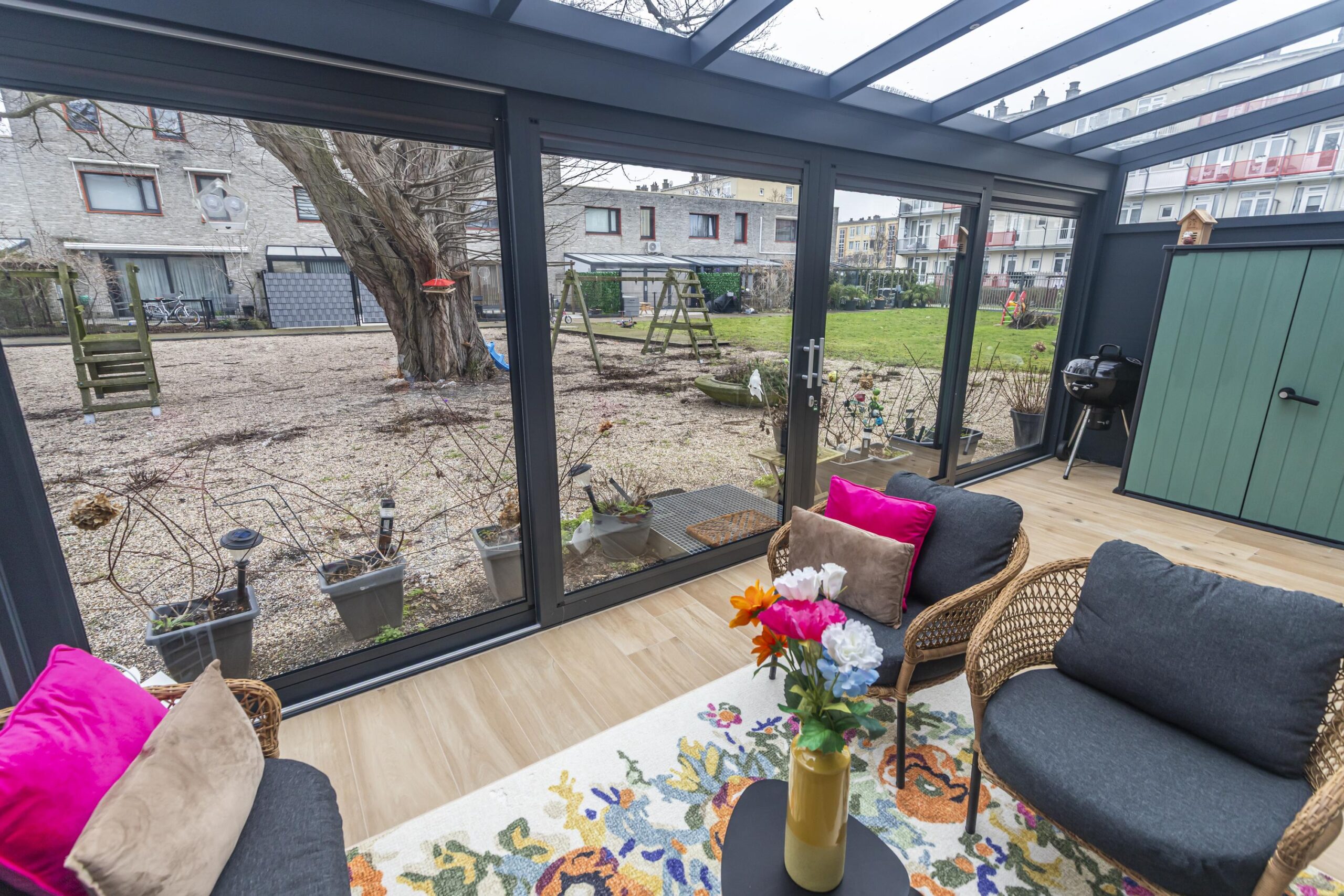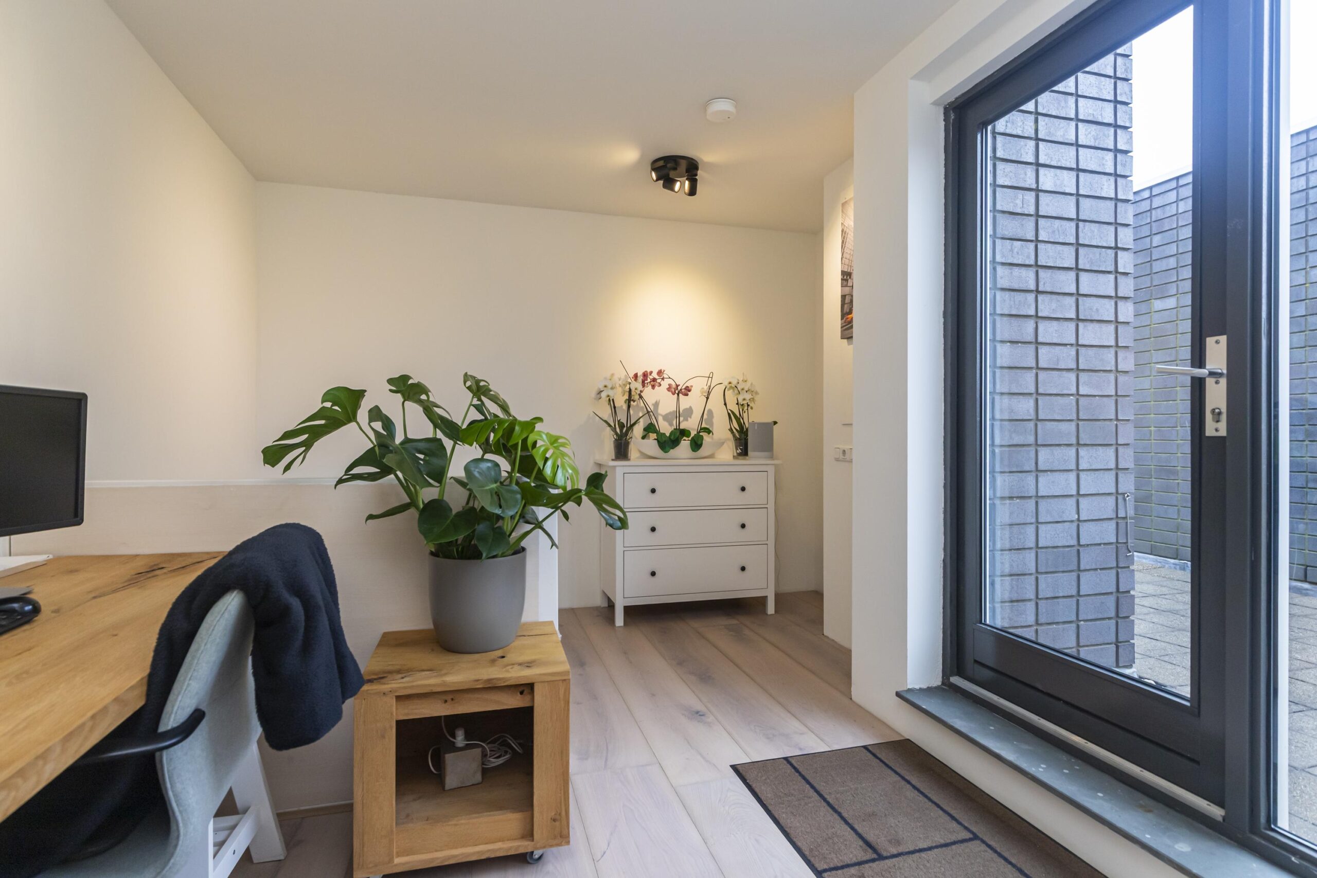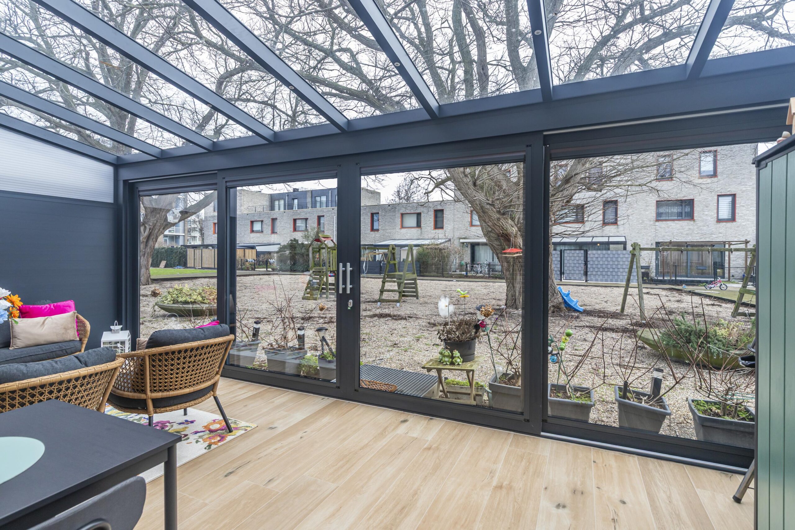 De woonkamer bevindt zich aan de achterzijde en is ruim opgezet met een prettige lichtinval. Vanuit hier is er toegang tot de serre, die fungeert als een fijne verlenging van de leefruimte. De serre vormt een prettige verbinding met de gemeenschappelijke tuin aan de achterzijde.
