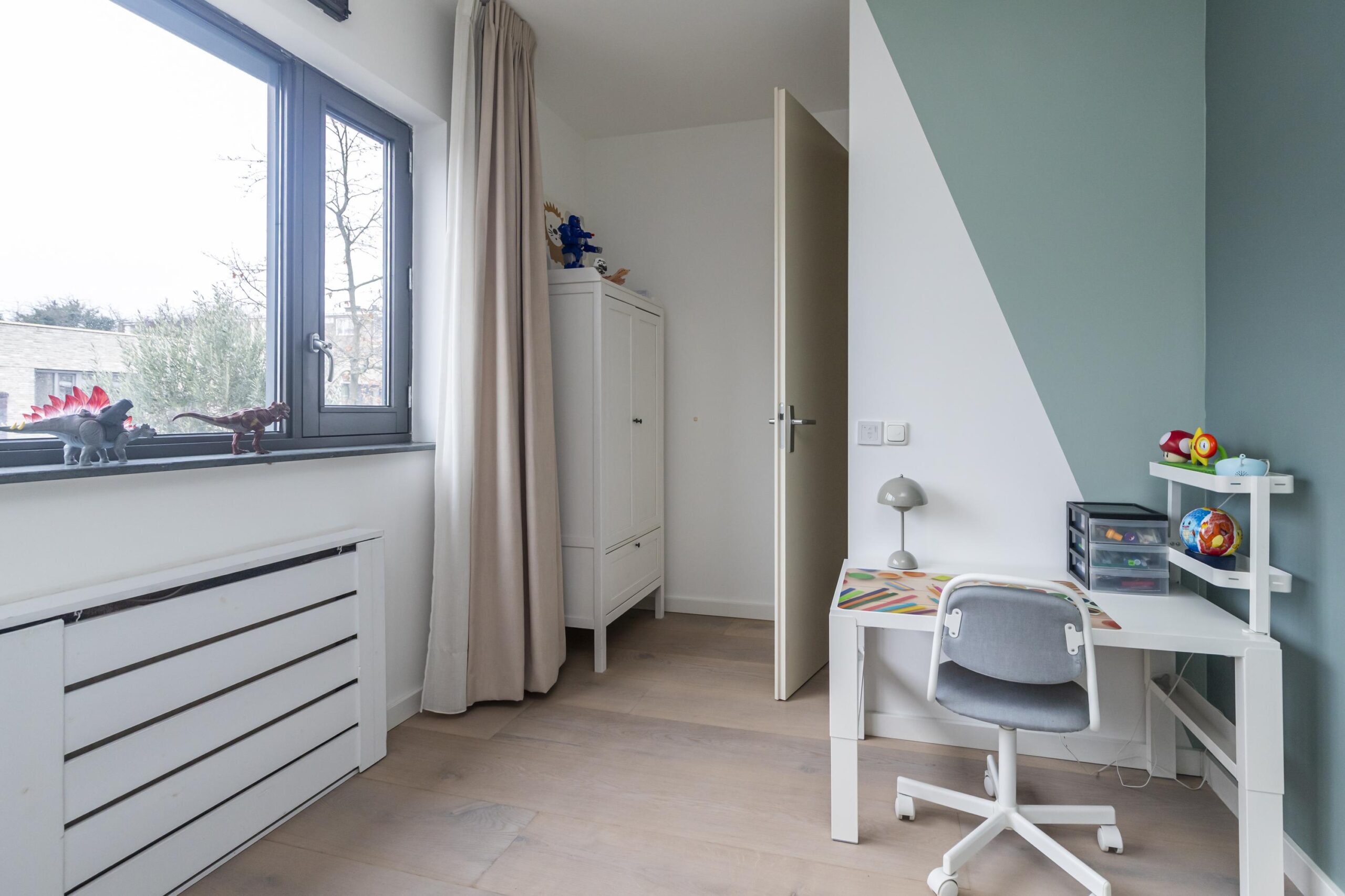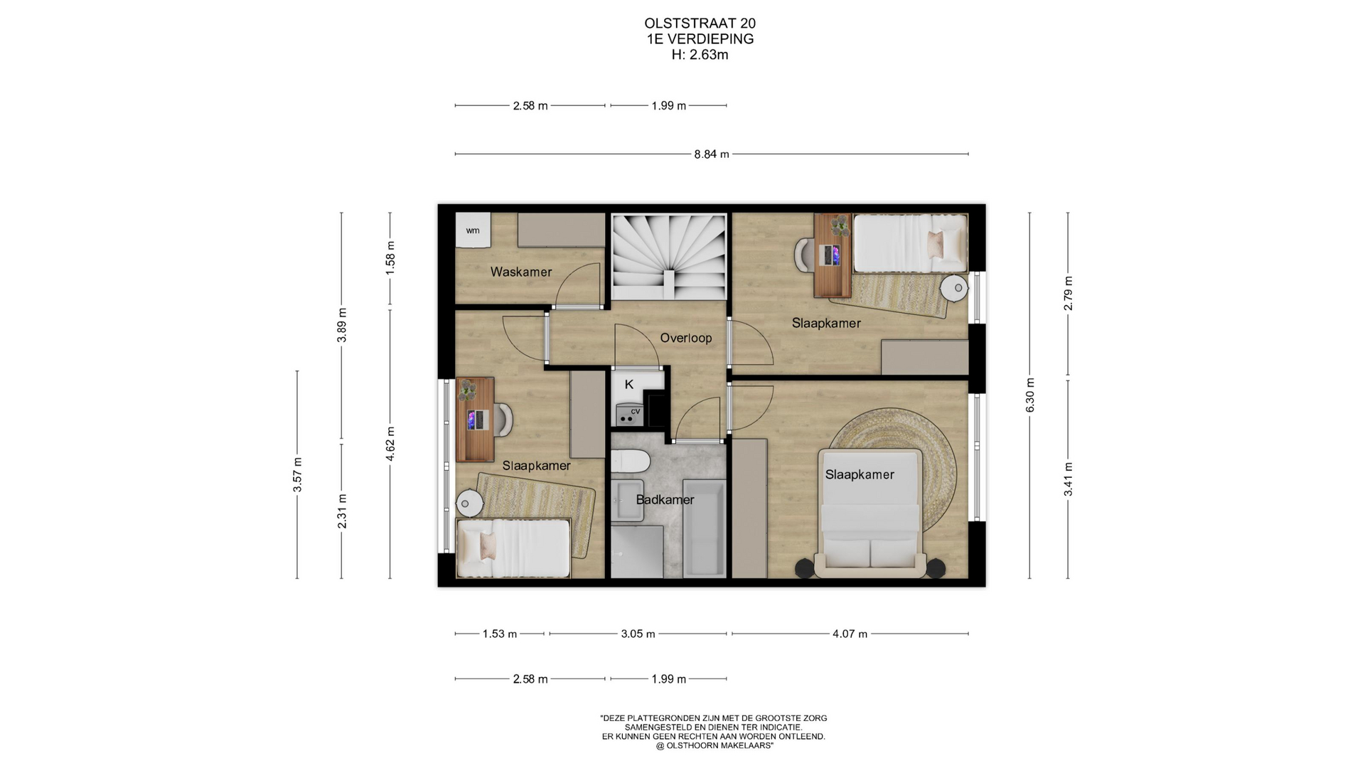 Op de eerste verdieping geeft de overloop toegang tot drie slaapkamers, een badkamer en een aparte waskamer. De slaapkamers zijn goed van formaat en geschikt voor diverse doeleinden, zoals slapen, werken of hobby’s. De badkamer is centraal gelegen en praktisch ingedeeld. De wasruimte is fijn afgescheiden, waardoor de overige ruimtes rustig en verzorgd aanvoelen.