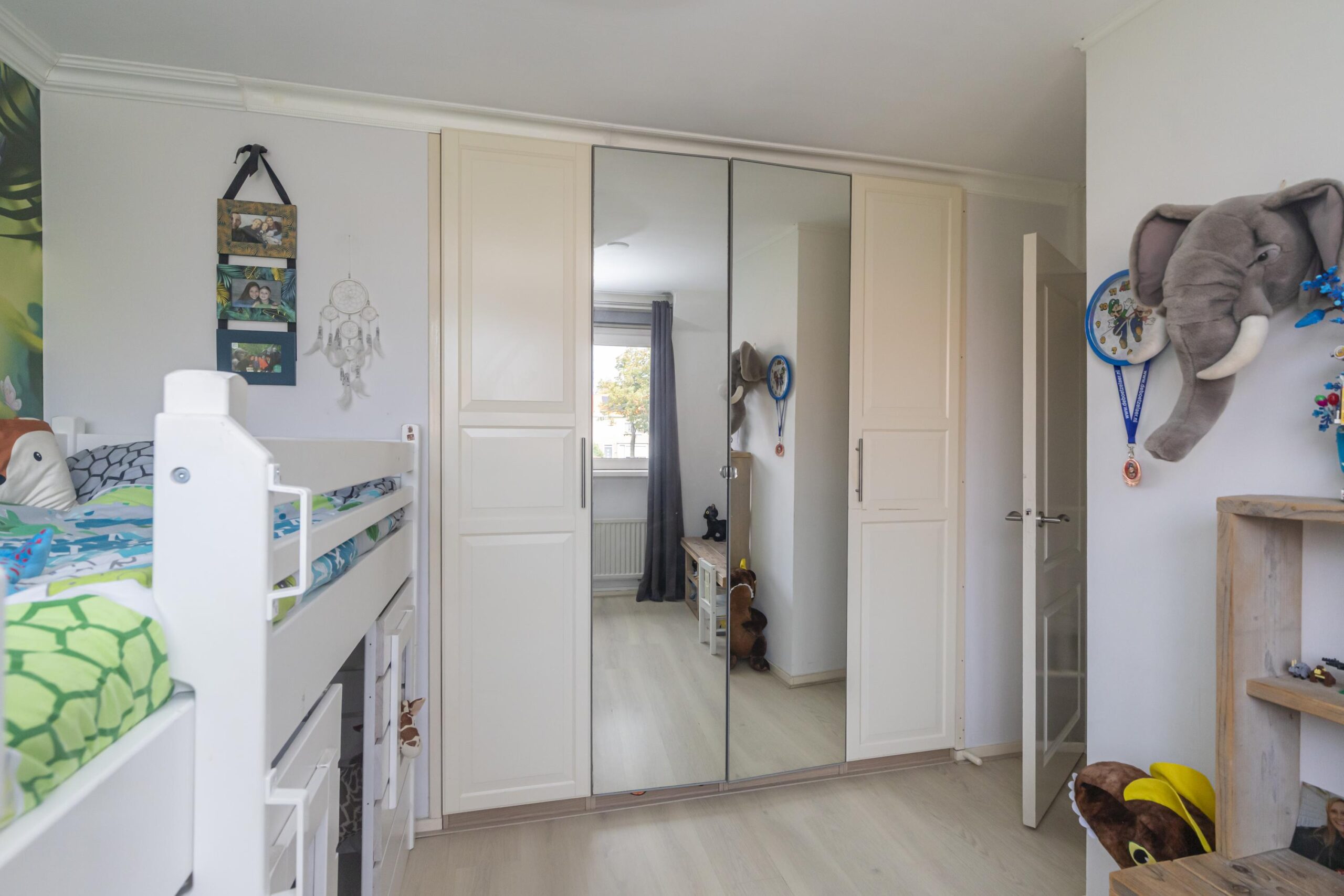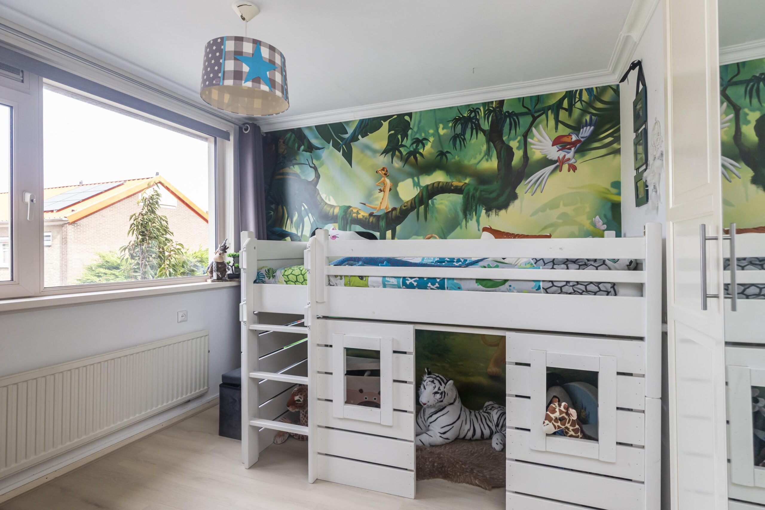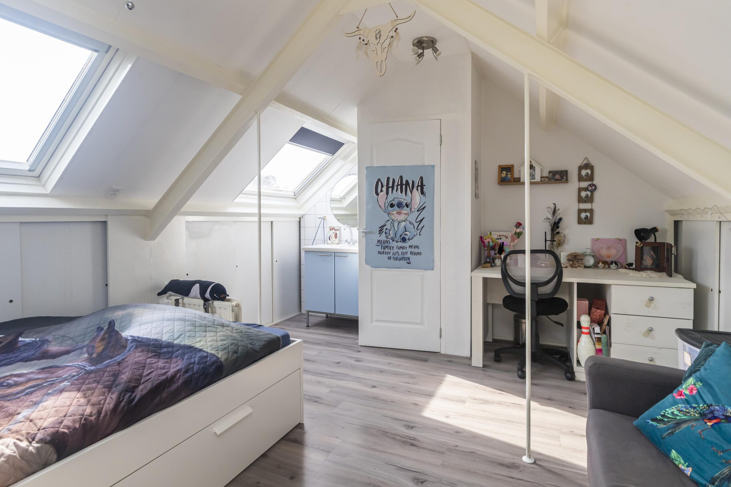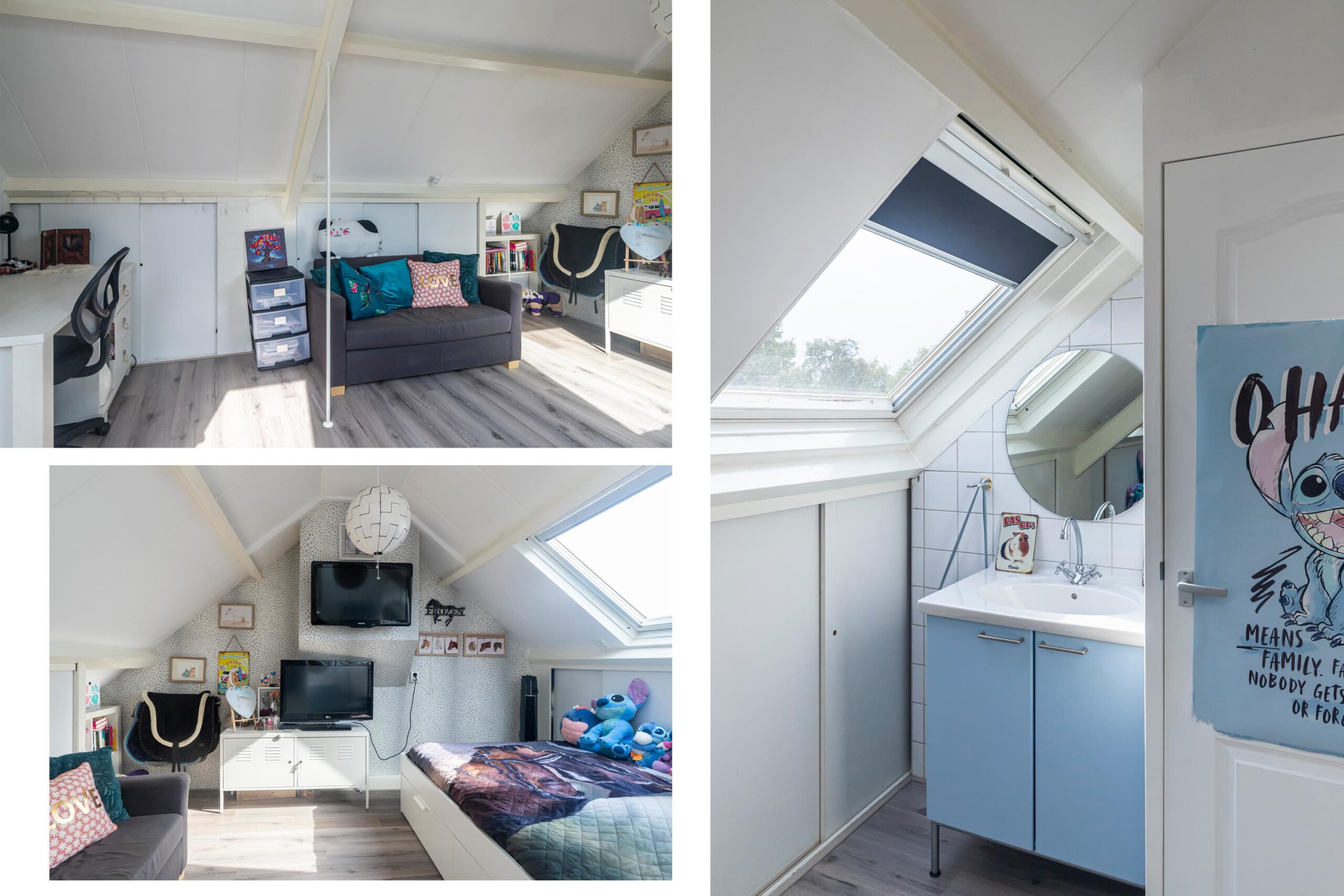 De zolderverdieping is bereikbaar via een vaste trap. Hier vind je een ruime vierde slaapkamer met twee dakramen, extra bergruimte en een wastafelmeubel. In een aparte kast is de cv-installatie geplaatst.