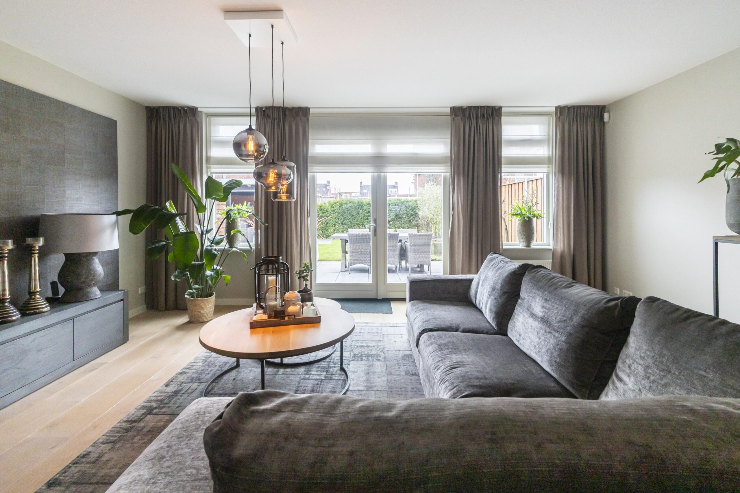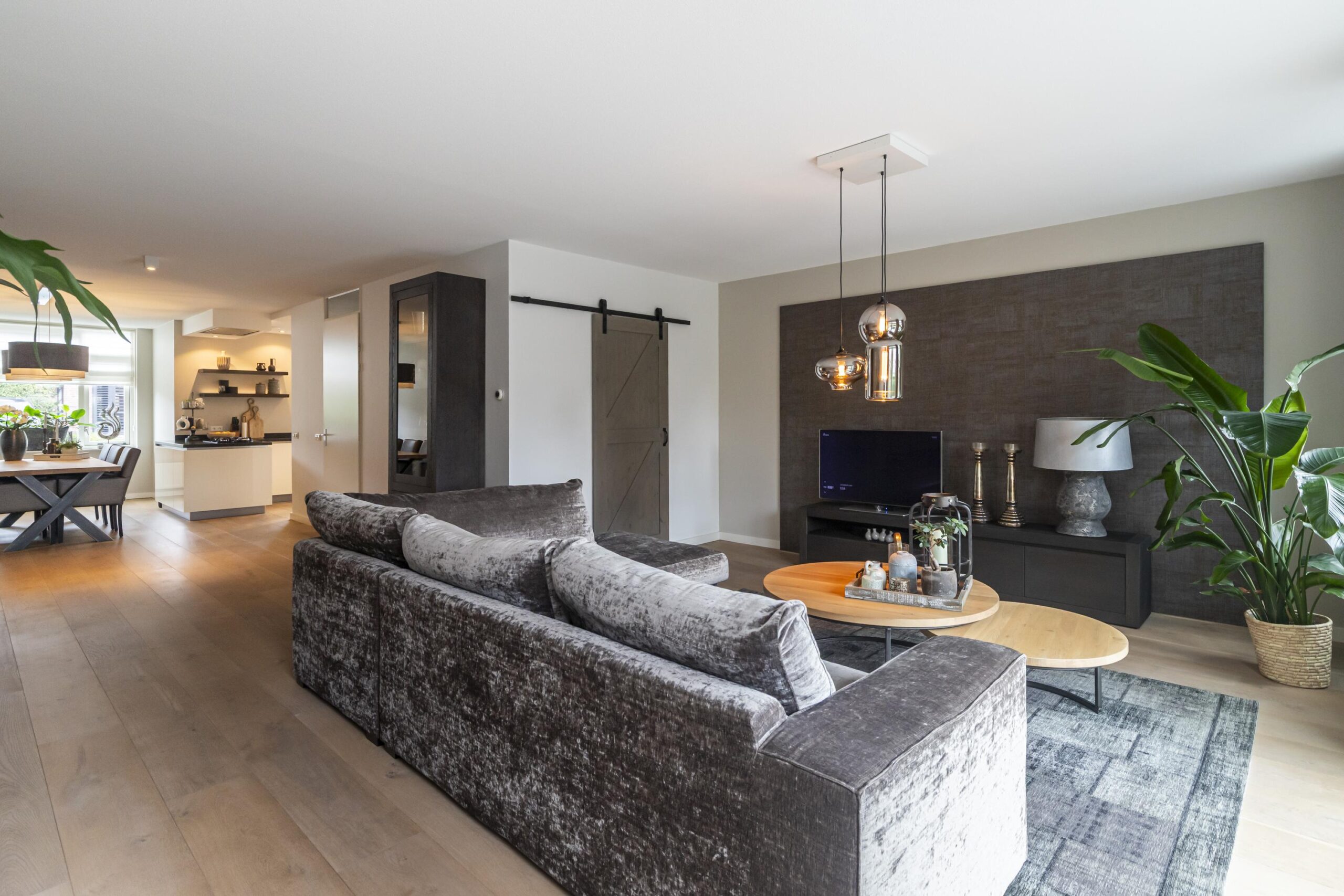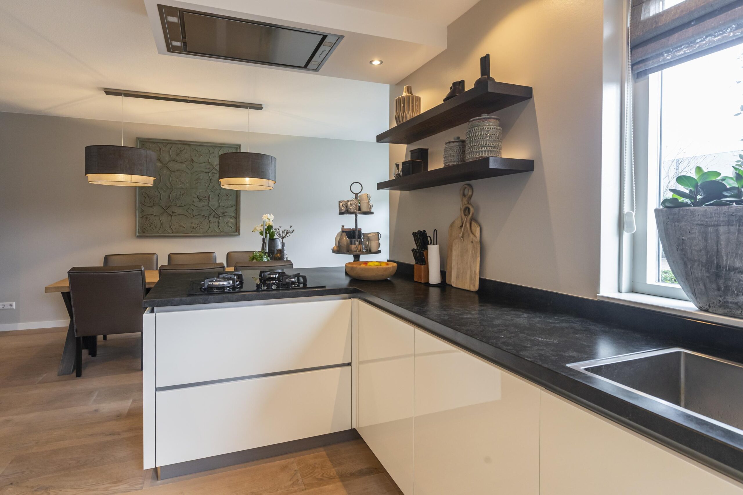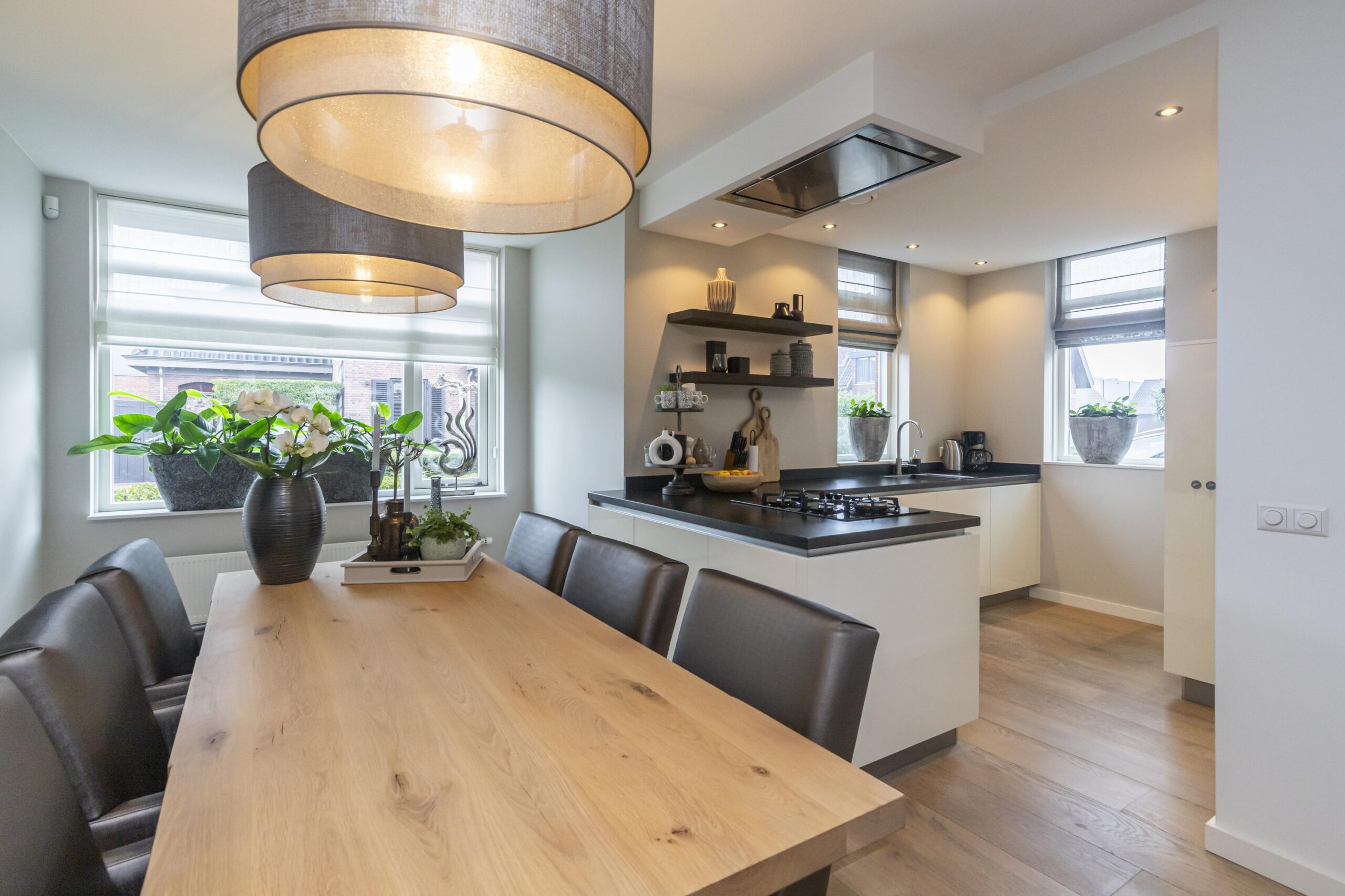 Via de overdekte entree betreed je de hal met toilet, meterkast en trapopgang. Aan de voorzijde bevindt zich de luxe keuken, uitgevoerd met hoogwaardige inbouwapparatuur zoals een gaskookplaat, oven, vaatwasser en koel-vriescombinatie. De ruime woonkamer is voorzien van een strakke vloerafwerking met vloerverwarming, veel daglicht en openslaande deuren naar de tuin, waardoor binnen en buiten mooi met elkaar verbonden zijn.