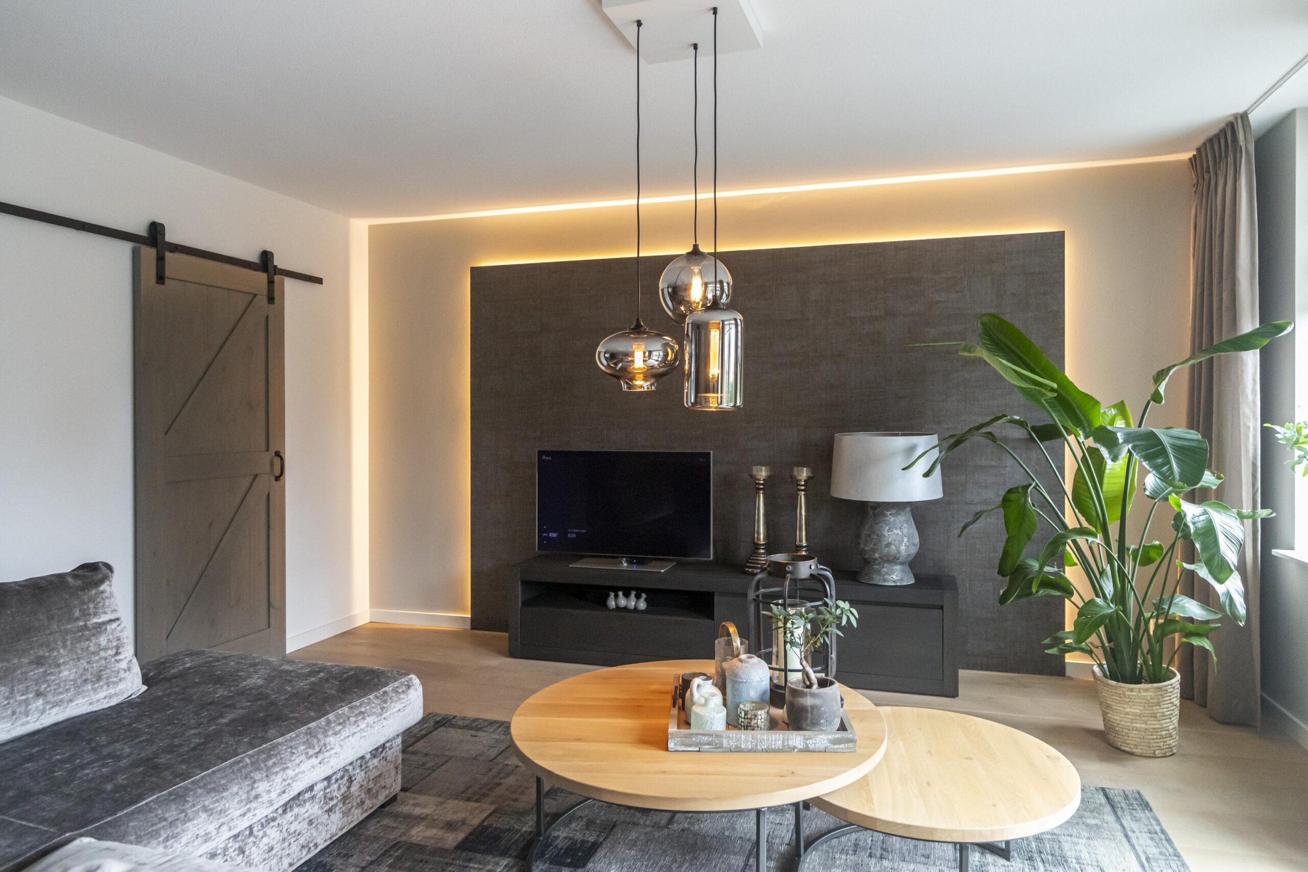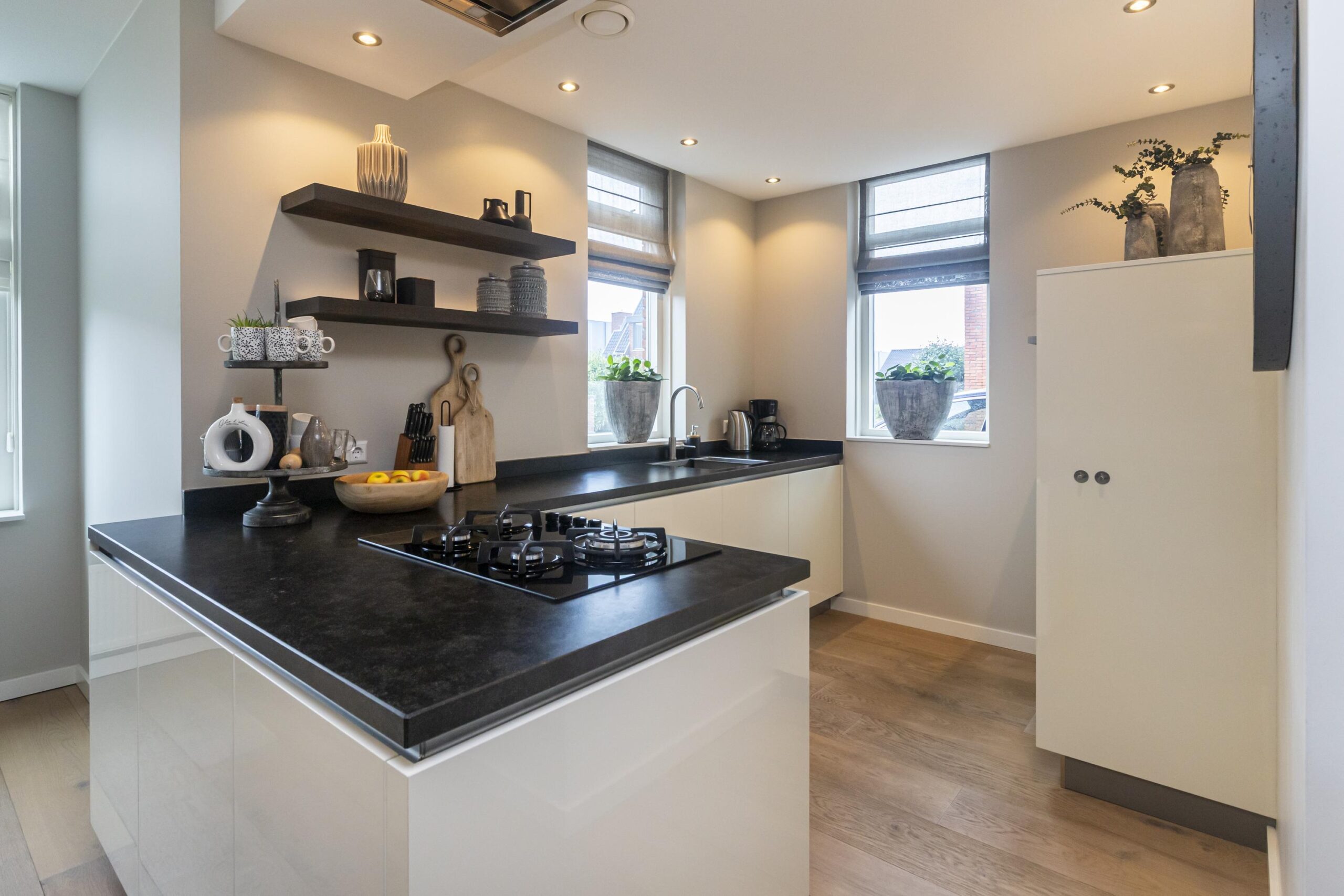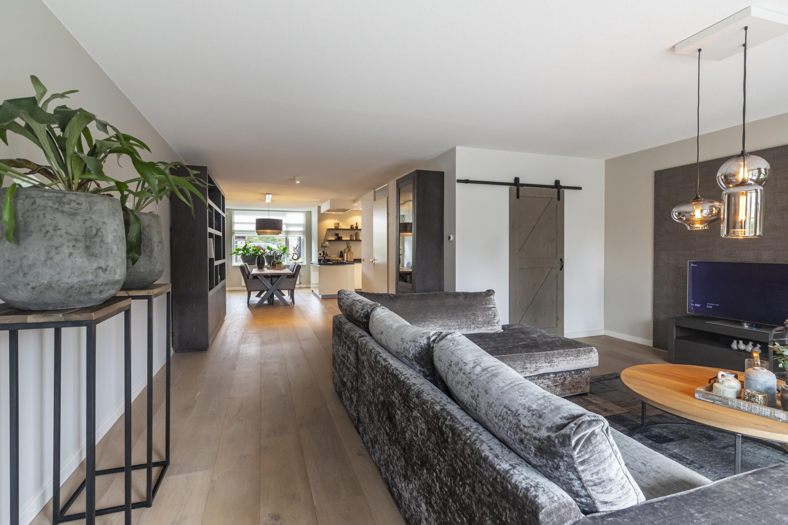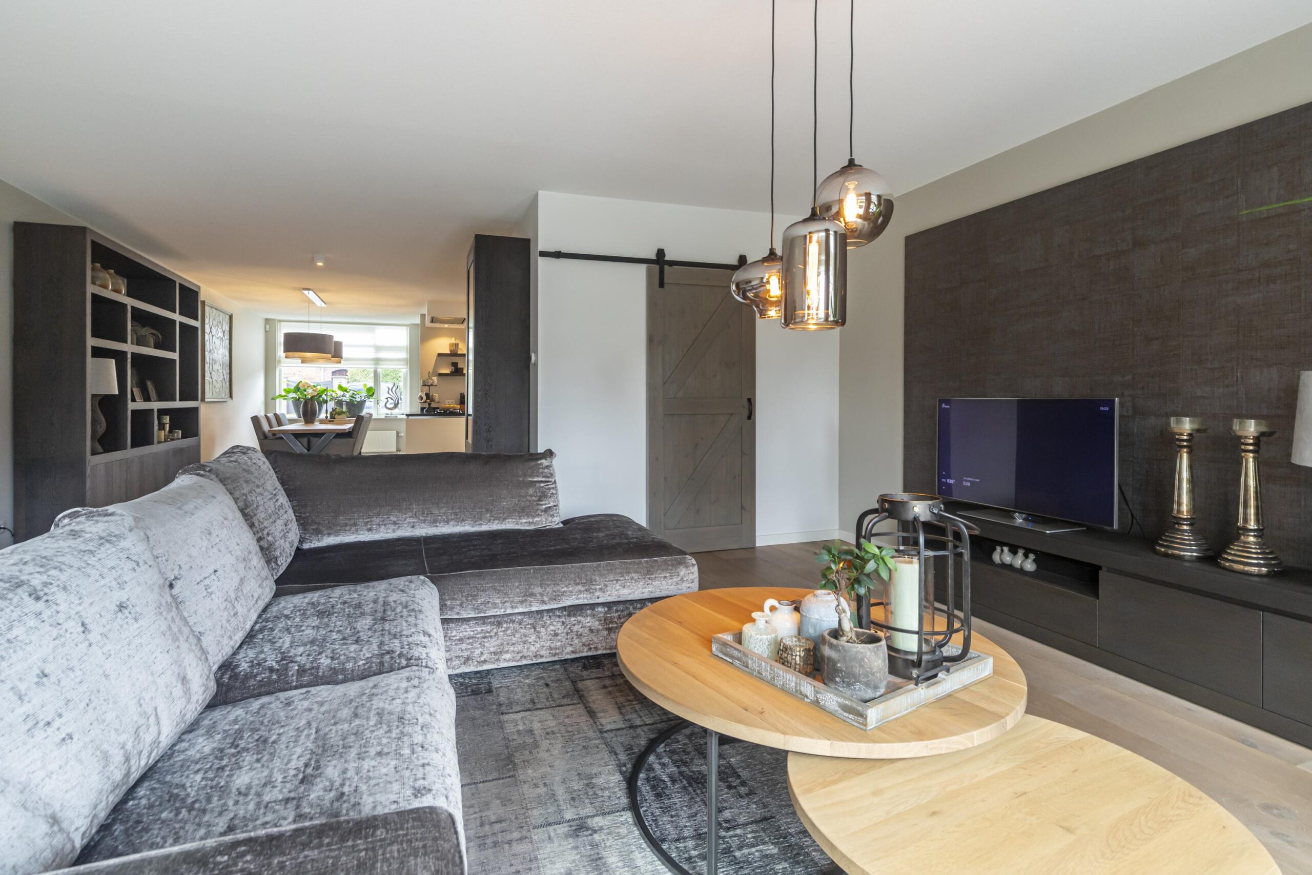 Via de overdekte entree betreed je de hal met toilet, meterkast en trapopgang. Aan de voorzijde bevindt zich de luxe keuken, uitgevoerd met hoogwaardige inbouwapparatuur zoals een gaskookplaat, oven, vaatwasser en koel-vriescombinatie. De ruime woonkamer is voorzien van een strakke vloerafwerking met vloerverwarming, veel daglicht en openslaande deuren naar de tuin, waardoor binnen en buiten mooi met elkaar verbonden zijn.