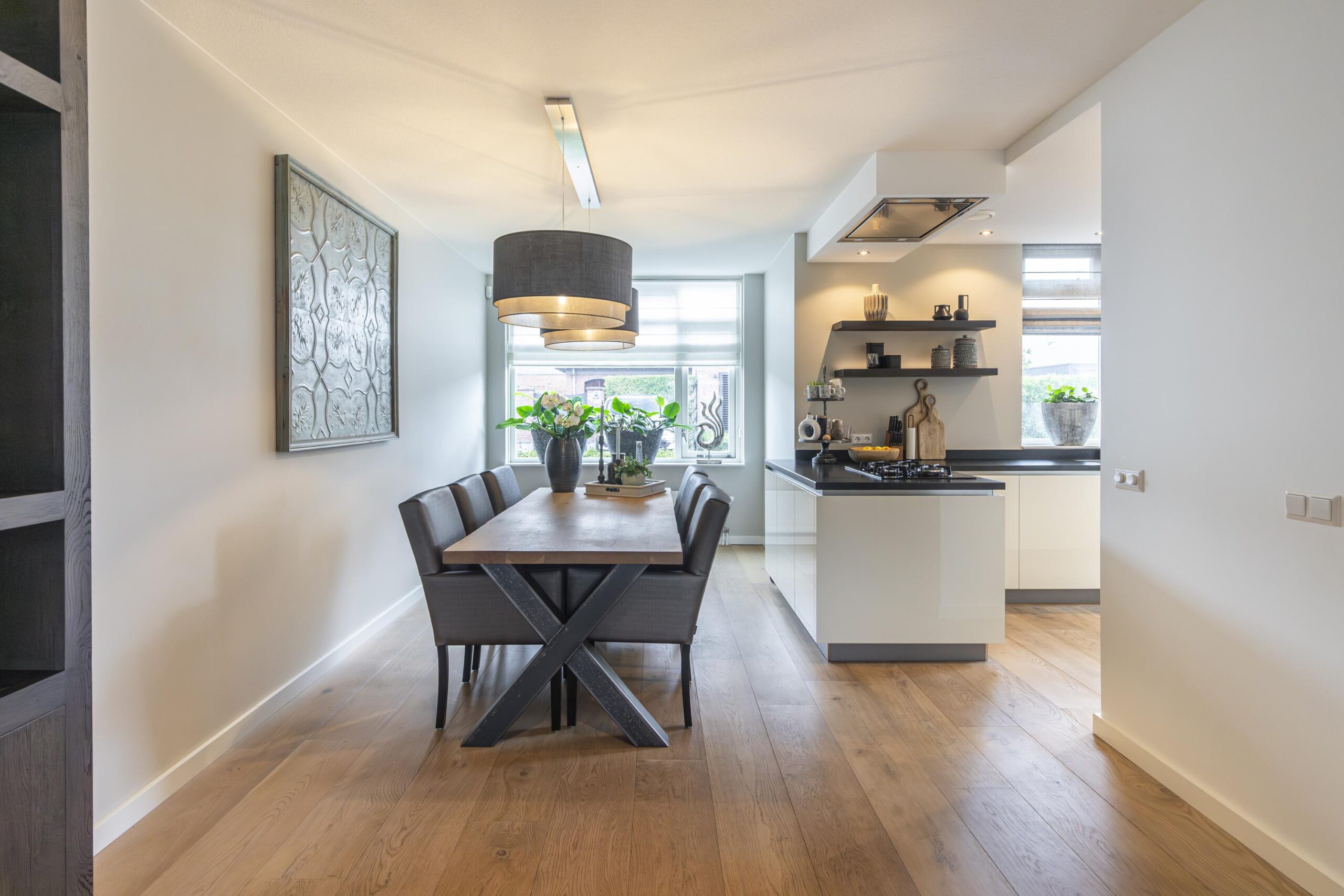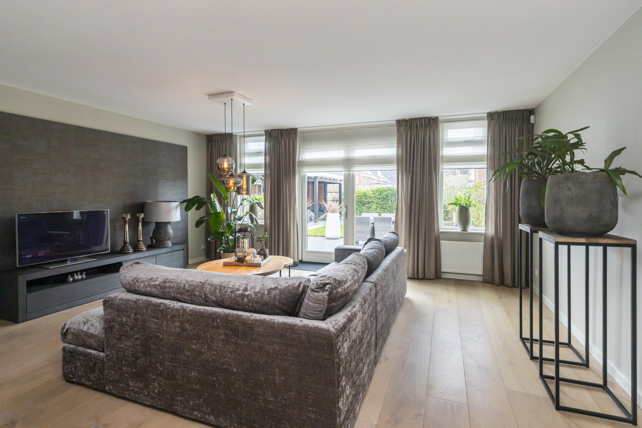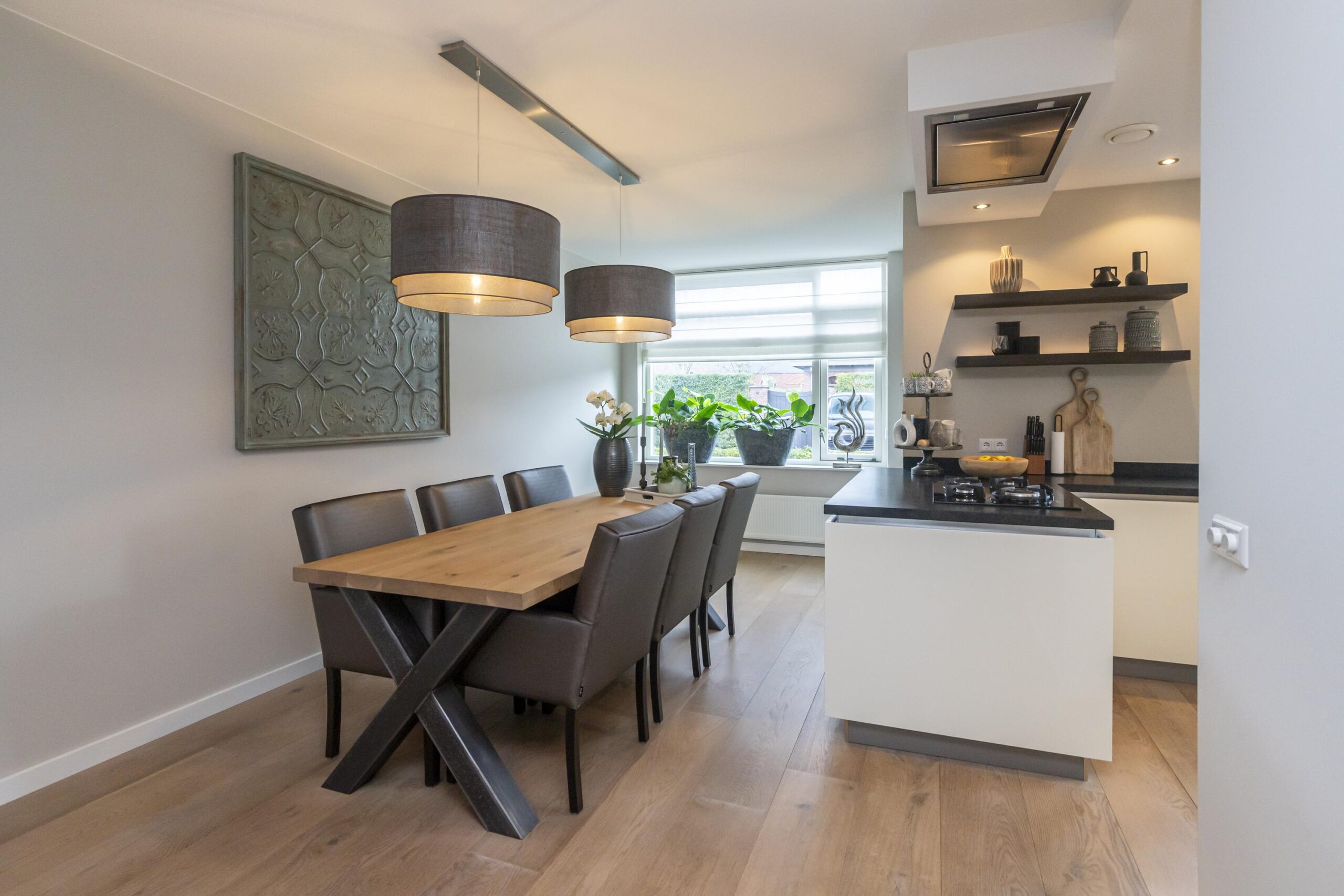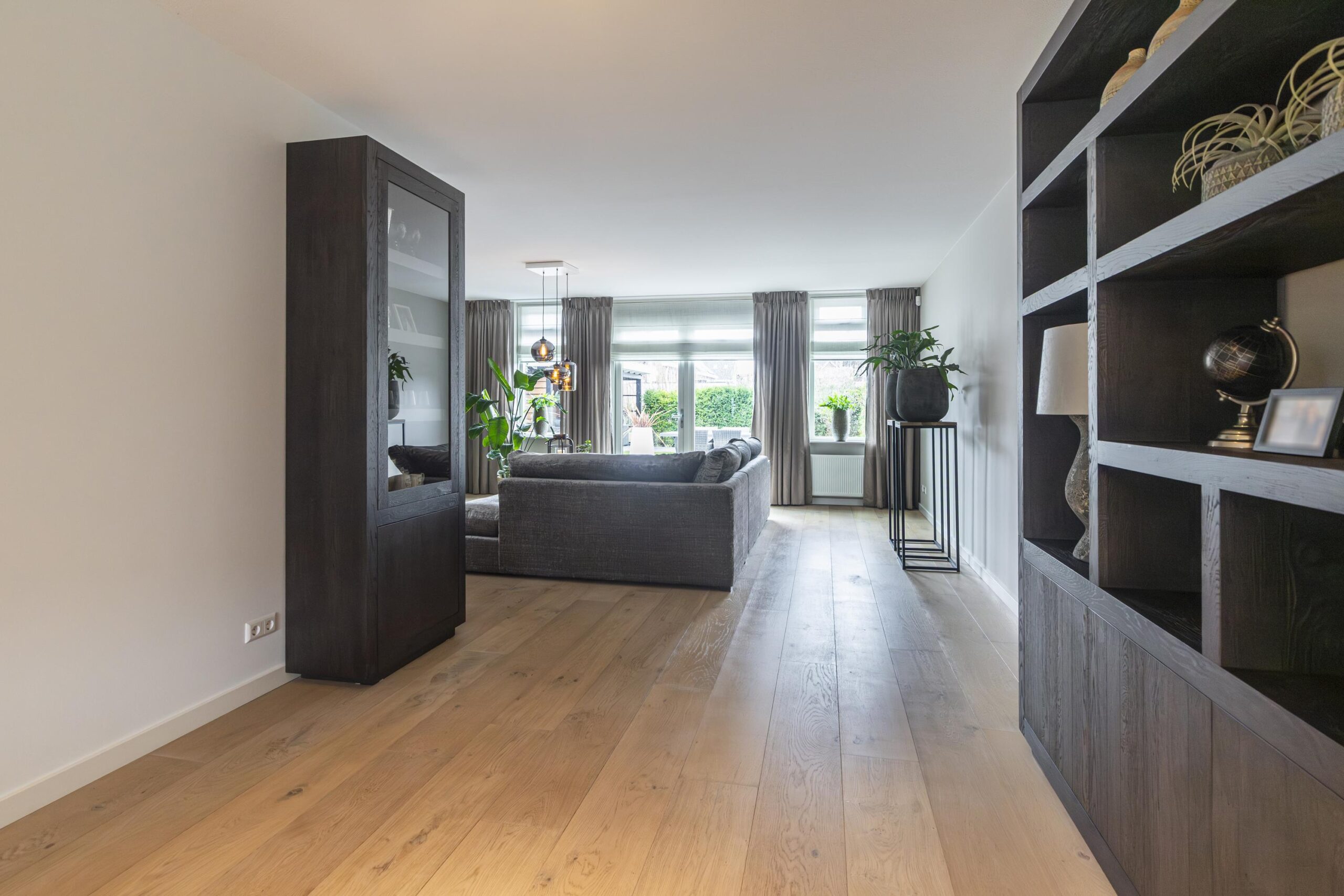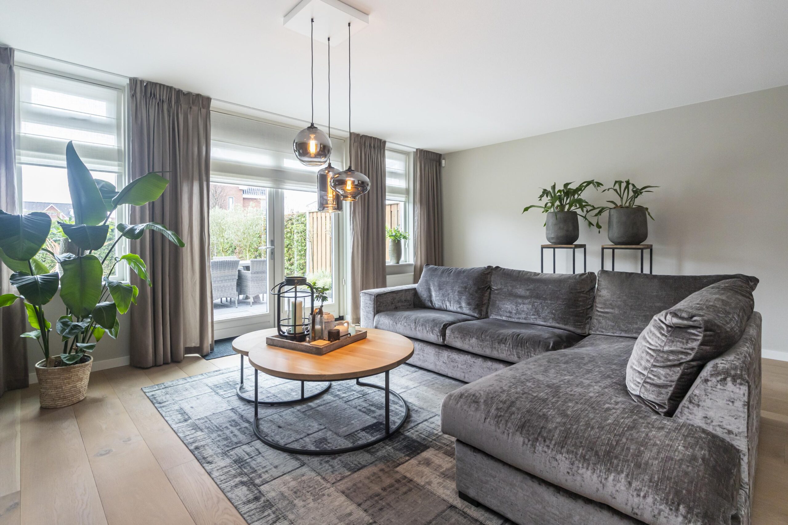 Via de overdekte entree betreed je de hal met toilet, meterkast en trapopgang. Aan de voorzijde bevindt zich de luxe keuken, uitgevoerd met hoogwaardige inbouwapparatuur zoals een gaskookplaat, oven, vaatwasser en koel-vriescombinatie. De ruime woonkamer is voorzien van een strakke vloerafwerking met vloerverwarming, veel daglicht en openslaande deuren naar de tuin, waardoor binnen en buiten mooi met elkaar verbonden zijn.