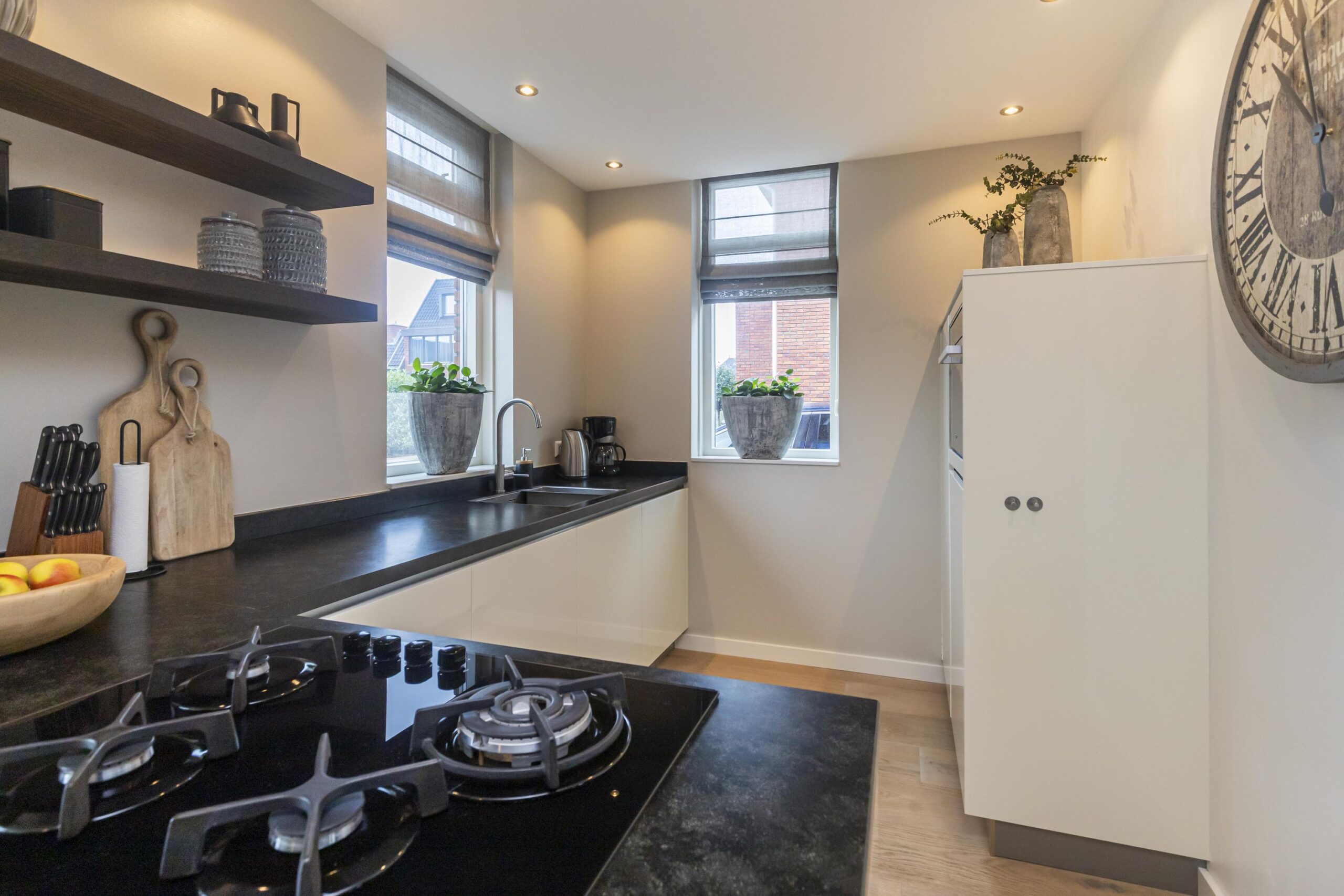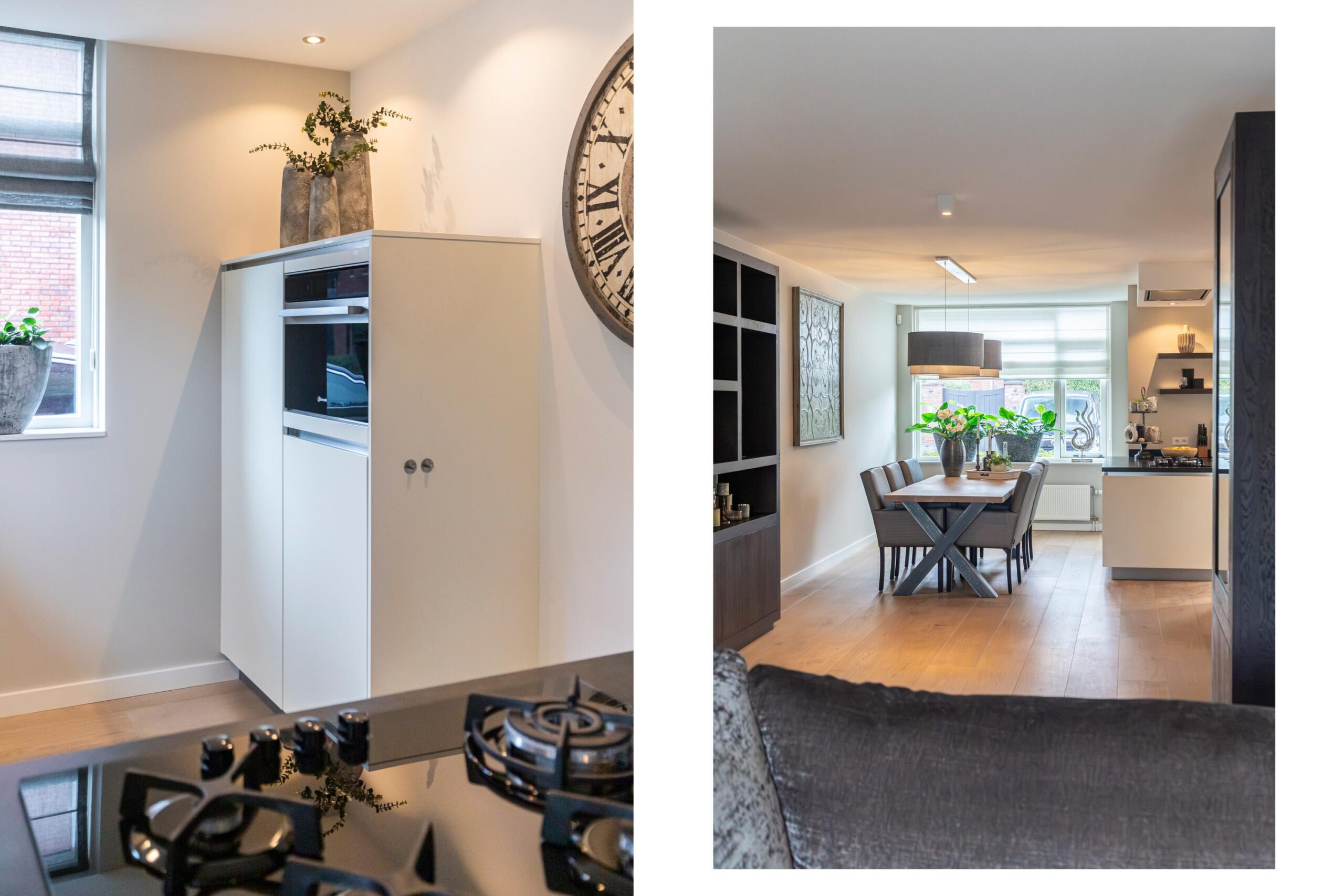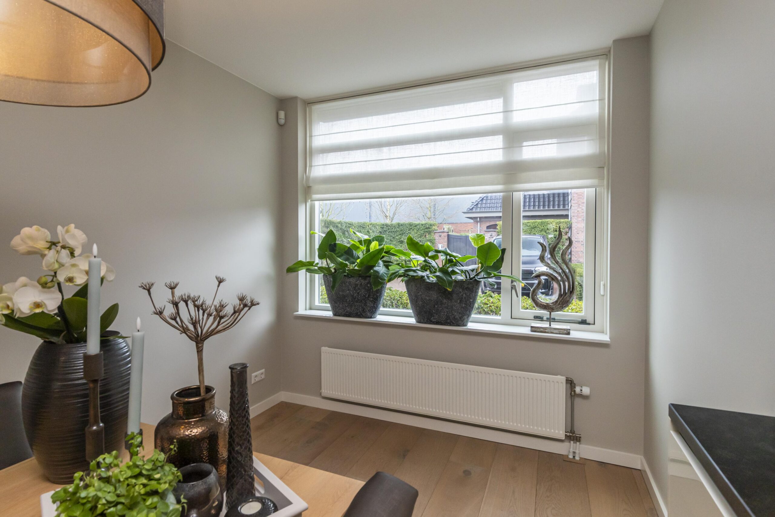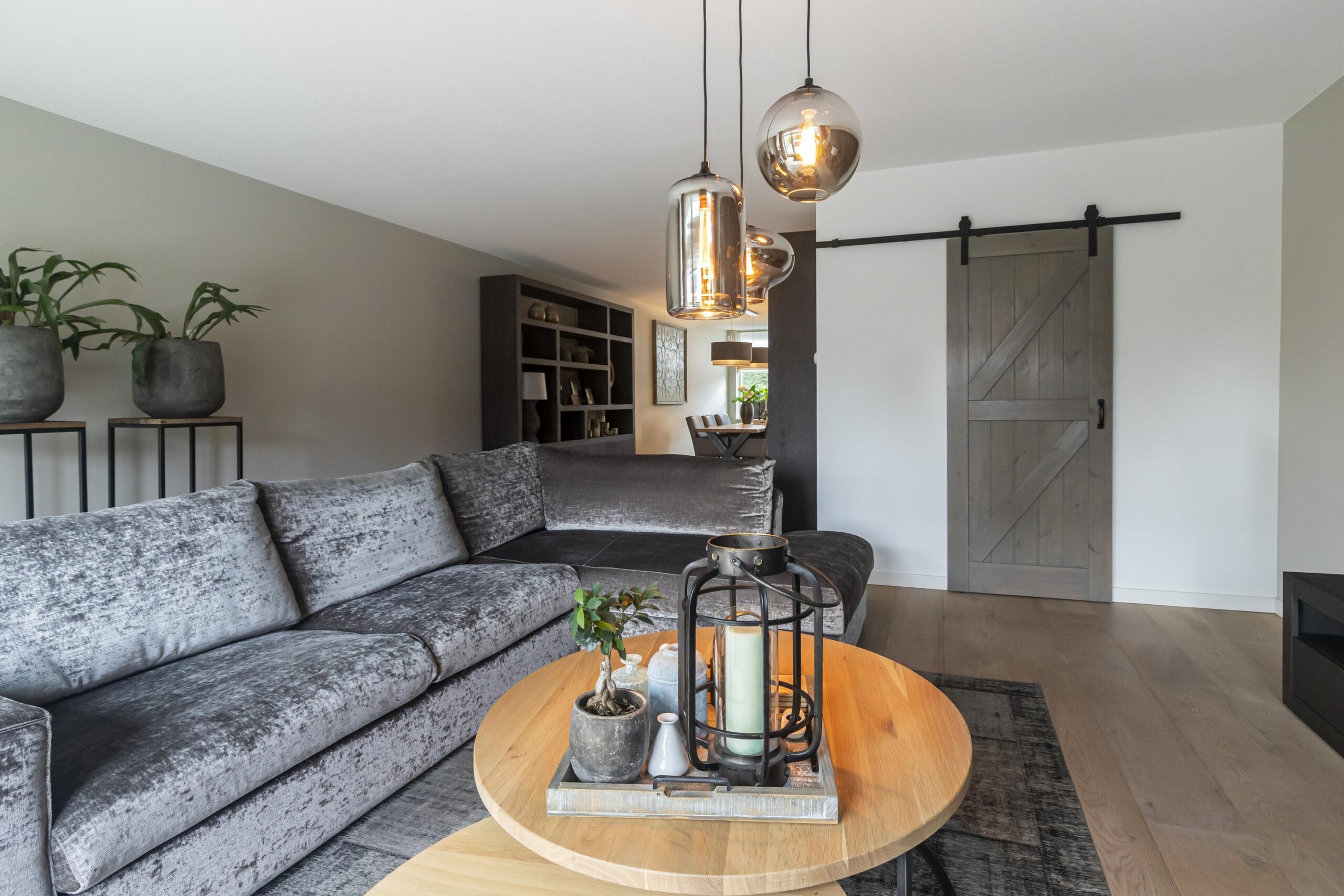 Via de overdekte entree betreed je de hal met toilet, meterkast en trapopgang. Aan de voorzijde bevindt zich de luxe keuken, uitgevoerd met hoogwaardige inbouwapparatuur zoals een gaskookplaat, oven, vaatwasser en koel-vriescombinatie. De ruime woonkamer is voorzien van een strakke vloerafwerking met vloerverwarming, veel daglicht en openslaande deuren naar de tuin, waardoor binnen en buiten mooi met elkaar verbonden zijn.
