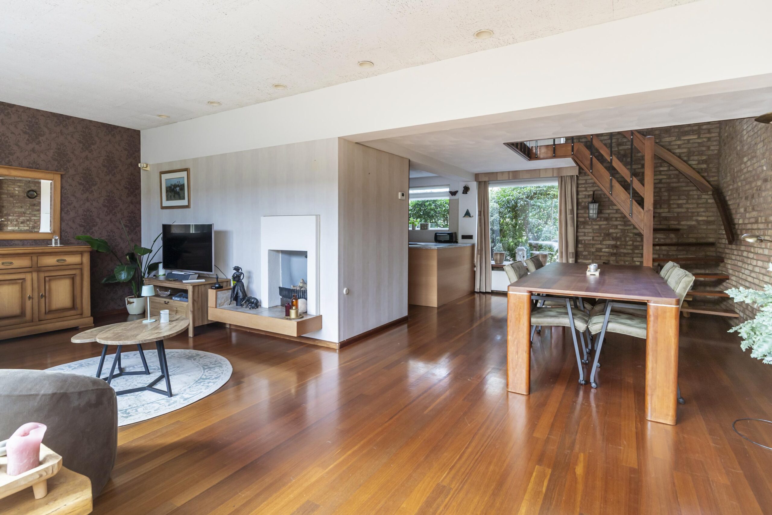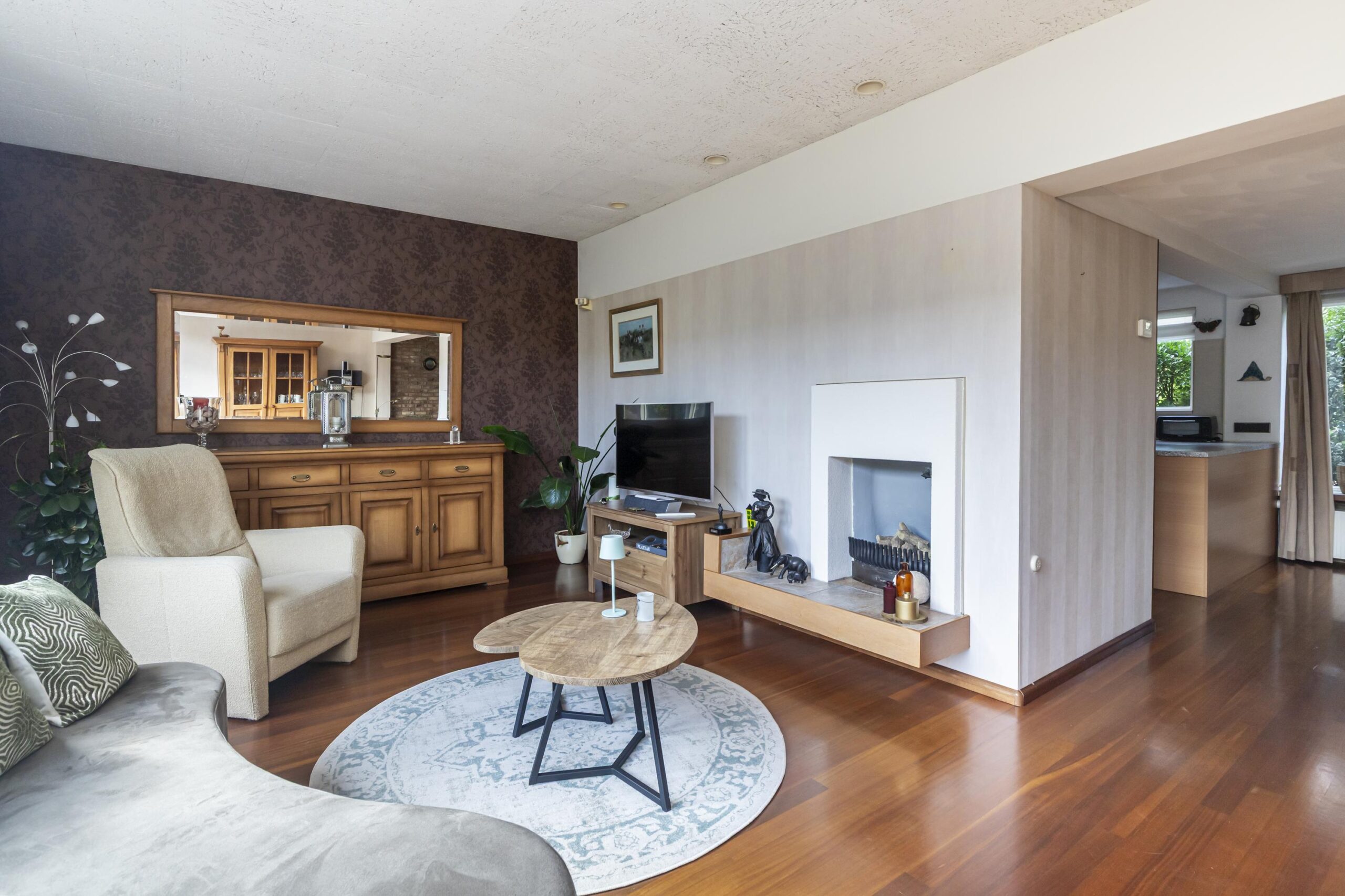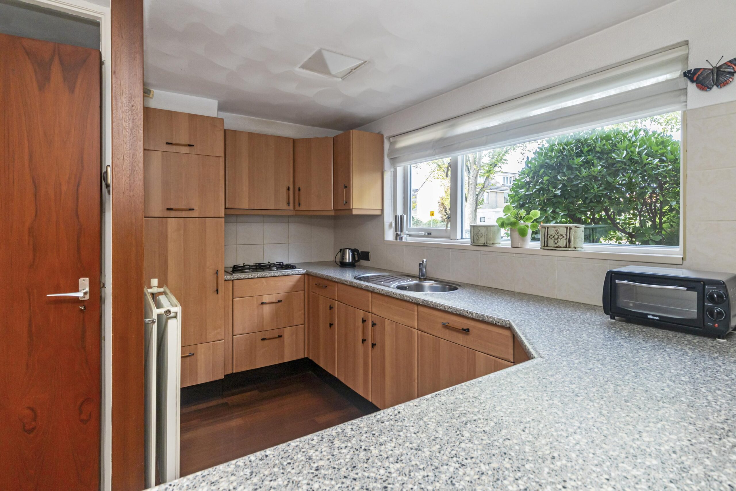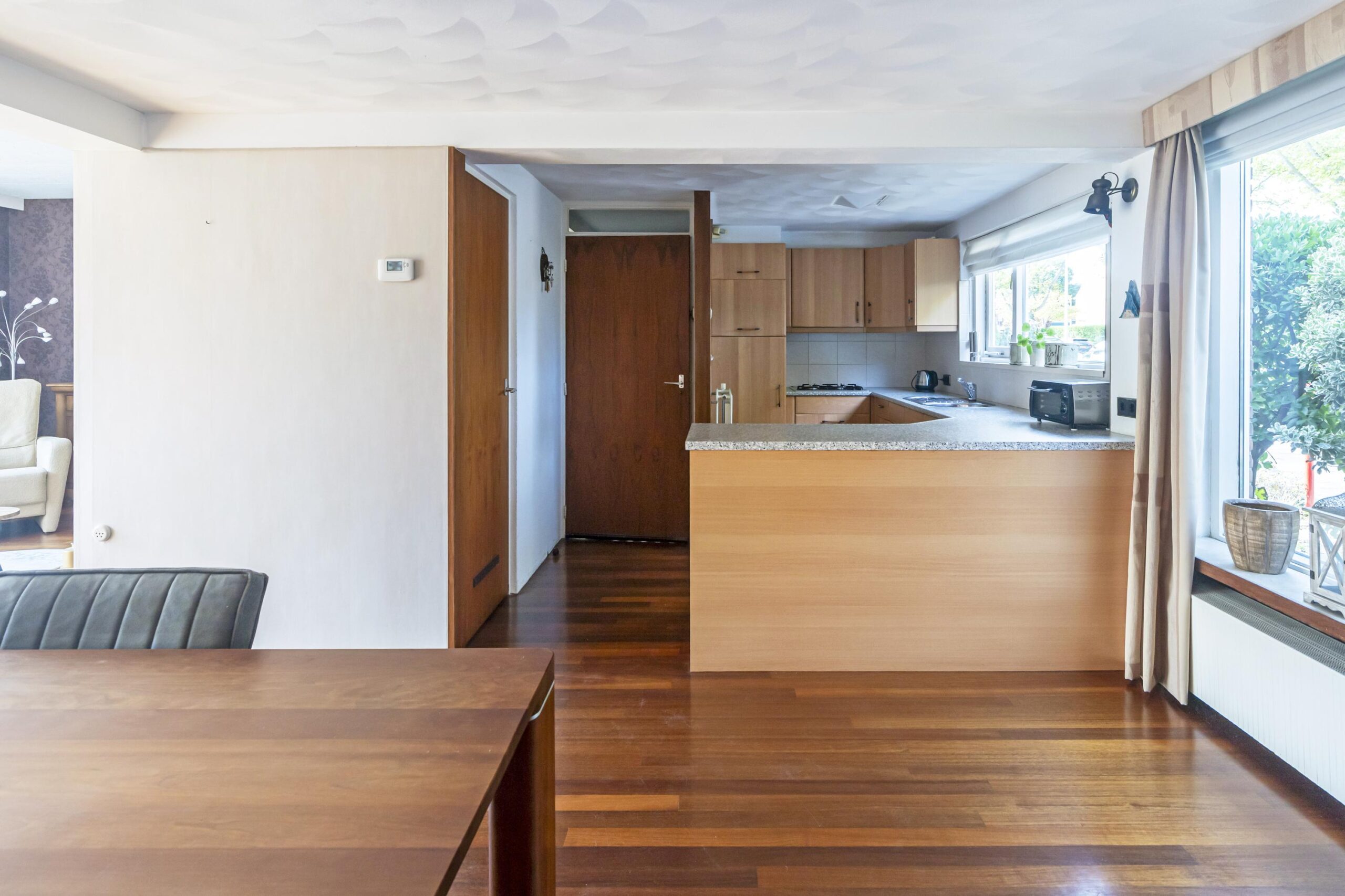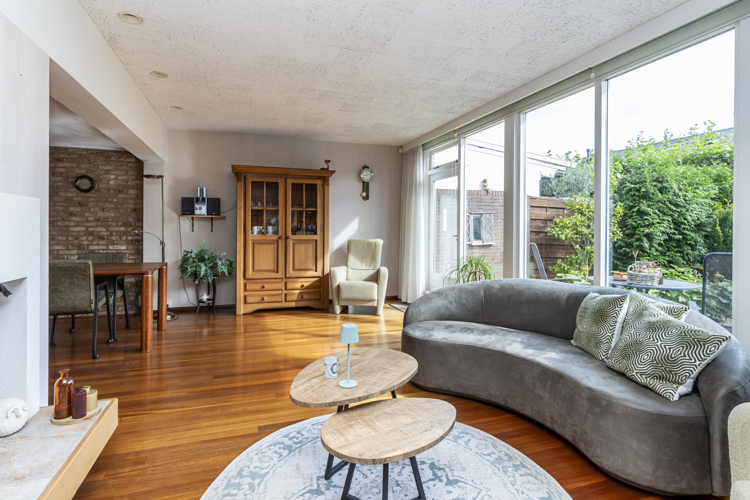 Bij binnenkomst kom je in de hal, die voorzien is van een garderobe, de meterkast en een toilet met fonteintje. De ruime woonkamer is een van de opvallende kenmerken van deze woning. Dankzij de grote raampartijen komt er veel natuurlijk licht naar binnen, wat zorgt voor een open en lichte sfeer. De ruime keuken is functioneel ingericht en beschikt over diverse inbouwapparatuur, zoals een vaatwasser, een 4-pits kookplaat, een koelkast en een afzuigkap. Hier kun je zorgeloos aan de slag en tegelijkertijd genieten van de gezelligheid van je gasten.