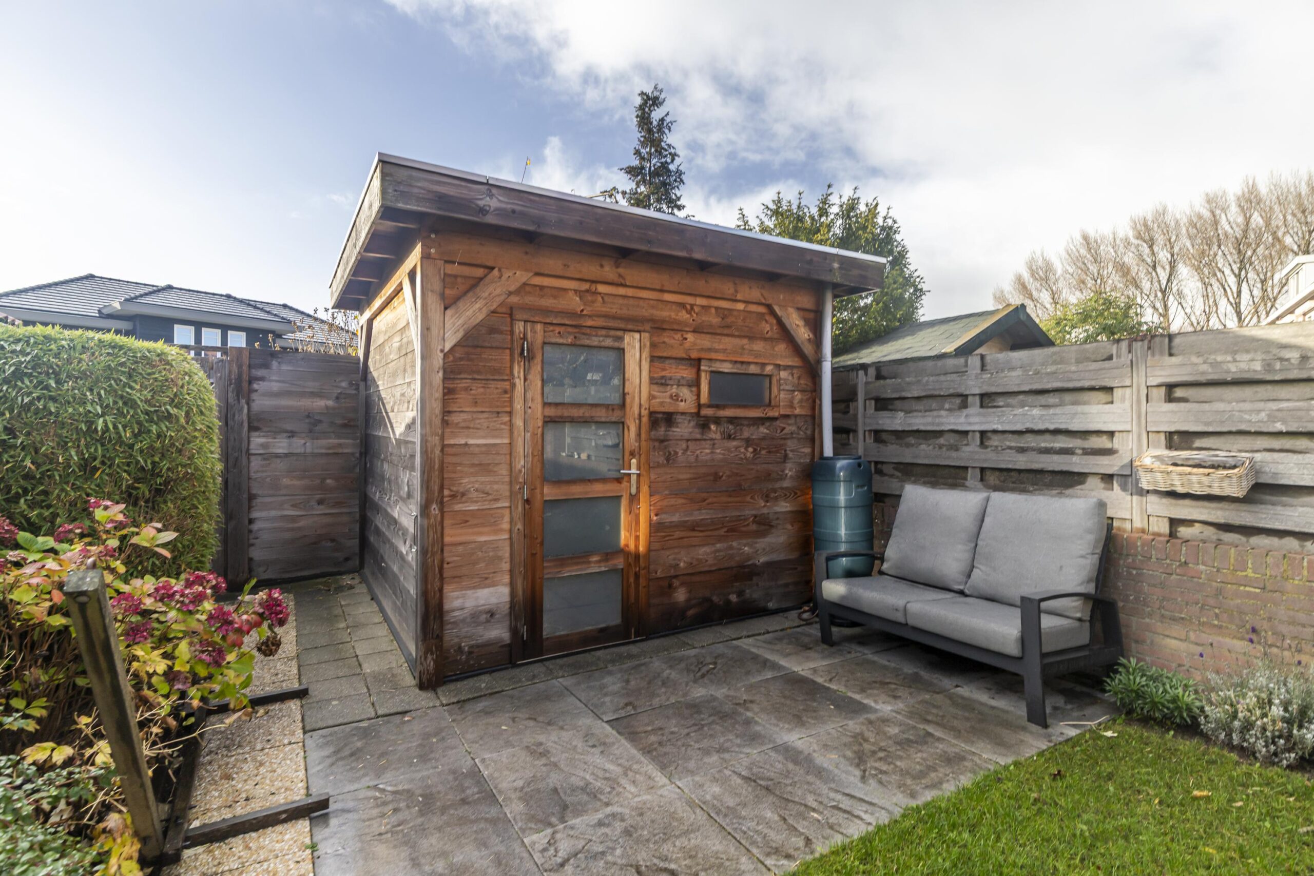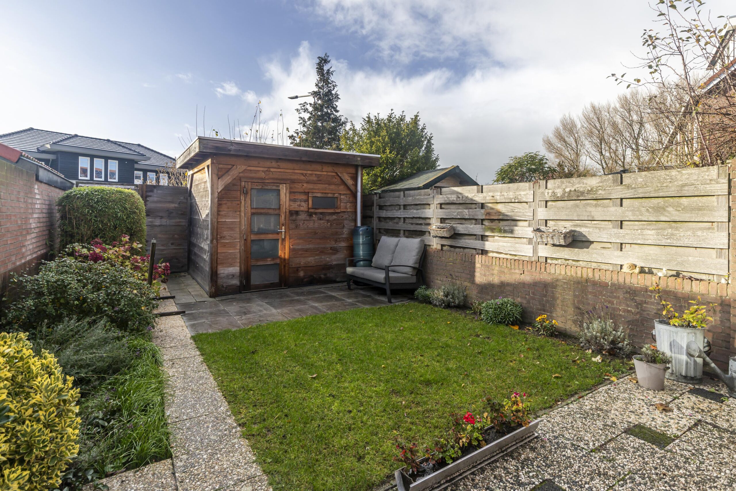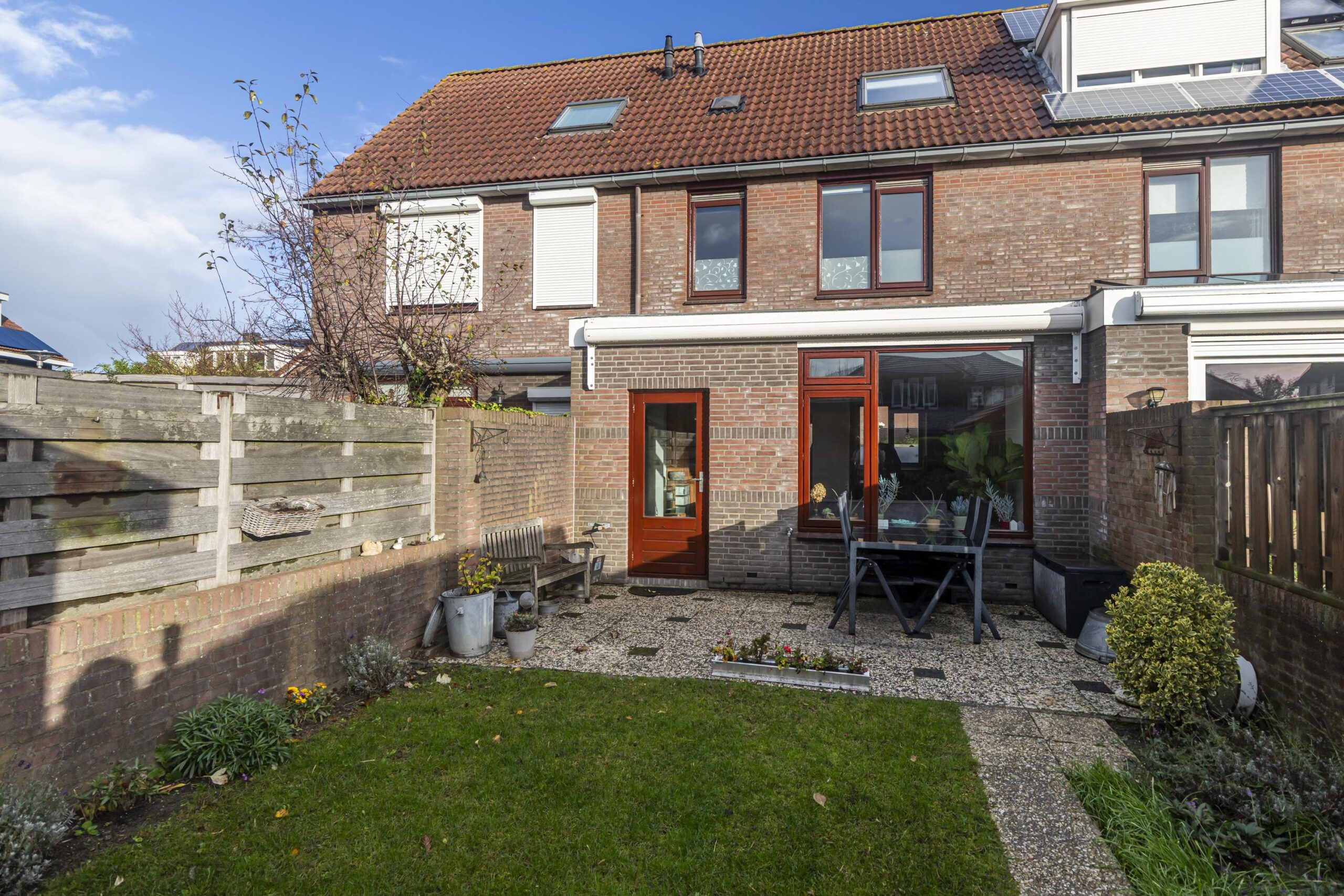 Via de achterdeur bereik je de achtertuin, gelegen op het zuidwesten. Dit betekent dat je hier de hele dag kunt genieten van de zon, met een fijne plek om buiten te zitten. De tuin is een rustige en zonnige oase, perfect voor het ontvangen van gasten of het ontspannen na een drukke werkdag.