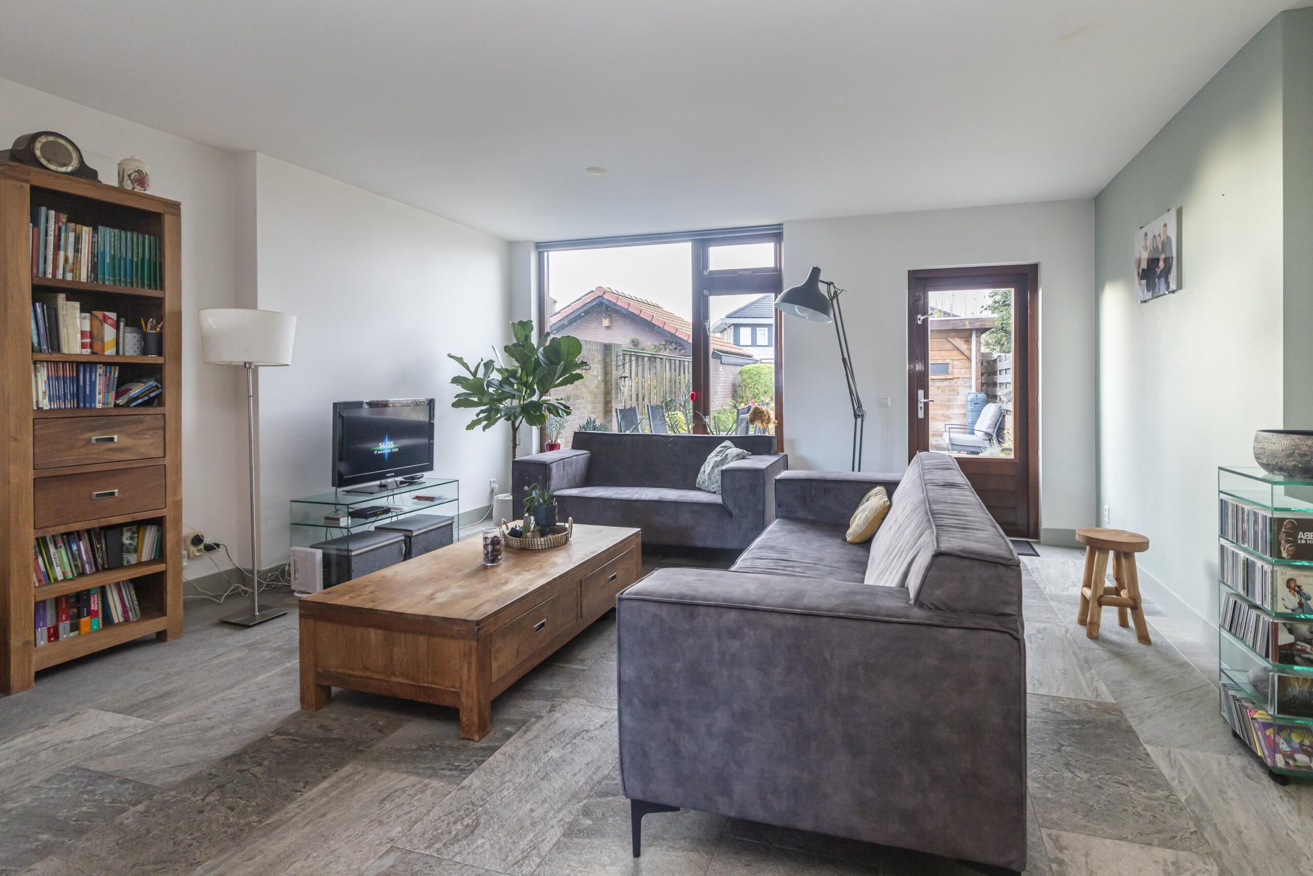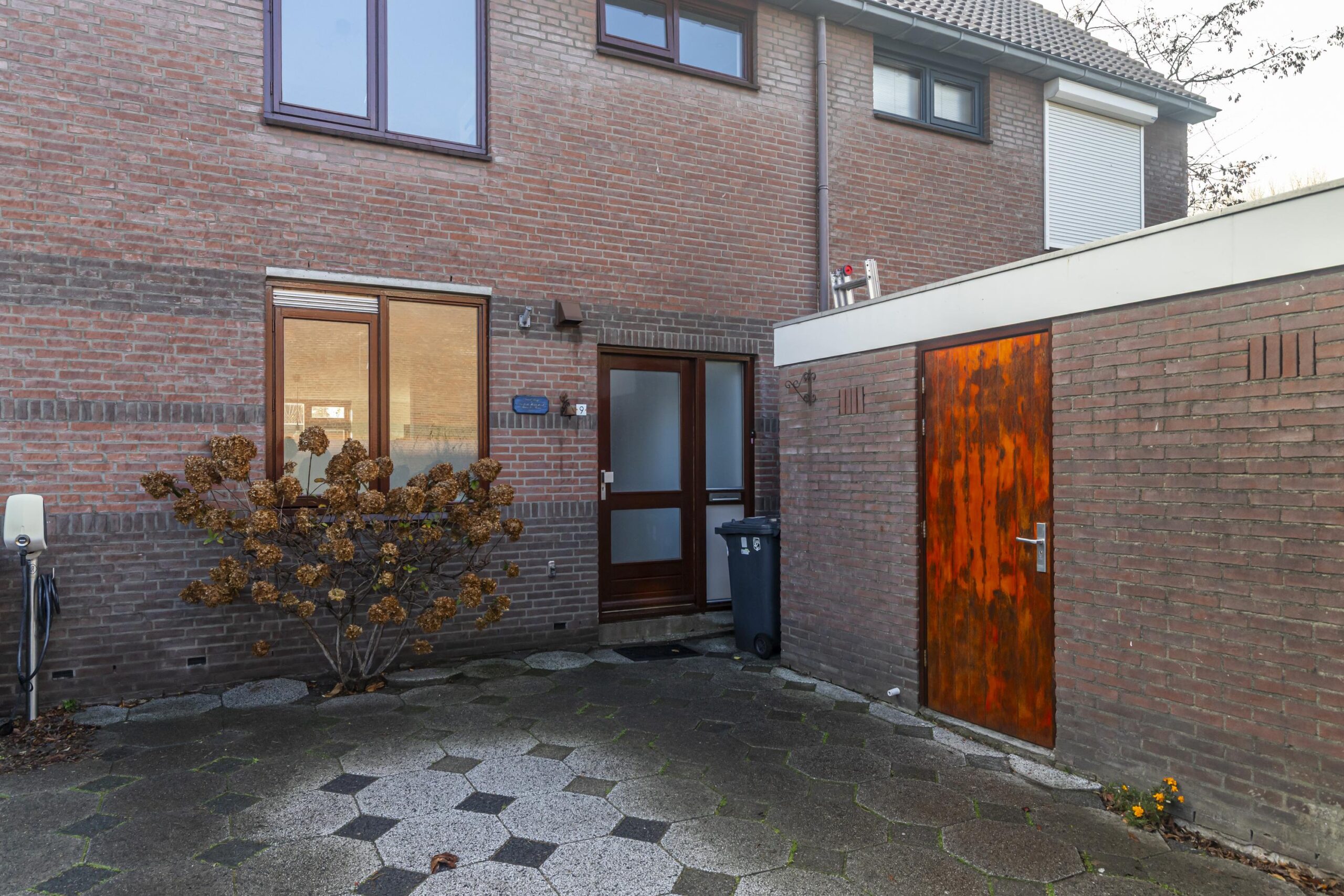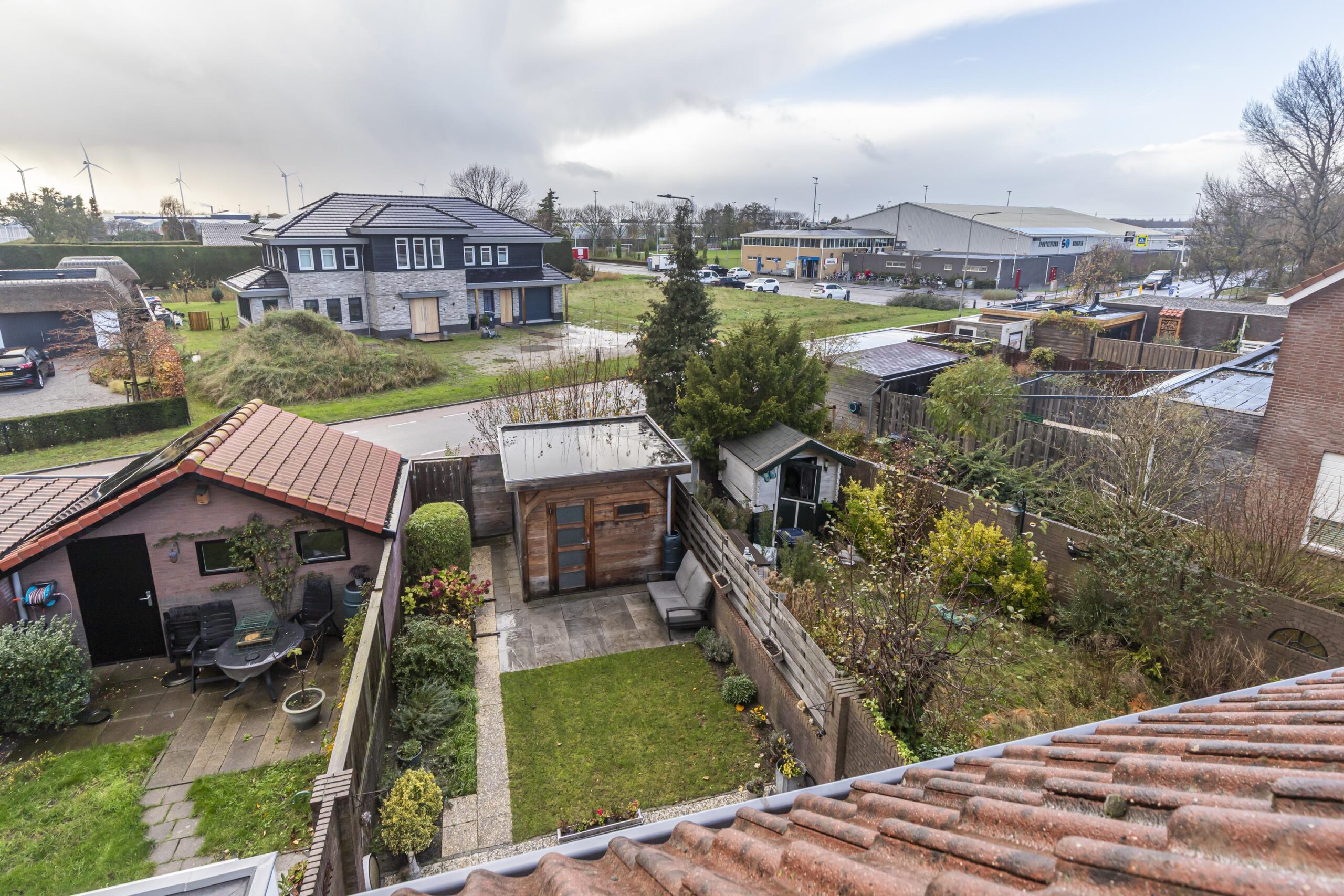 Via de achterdeur bereik je de achtertuin, gelegen op het zuidwesten. Dit betekent dat je hier de hele dag kunt genieten van de zon, met een fijne plek om buiten te zitten. De tuin is een rustige en zonnige oase, perfect voor het ontvangen van gasten of het ontspannen na een drukke werkdag.