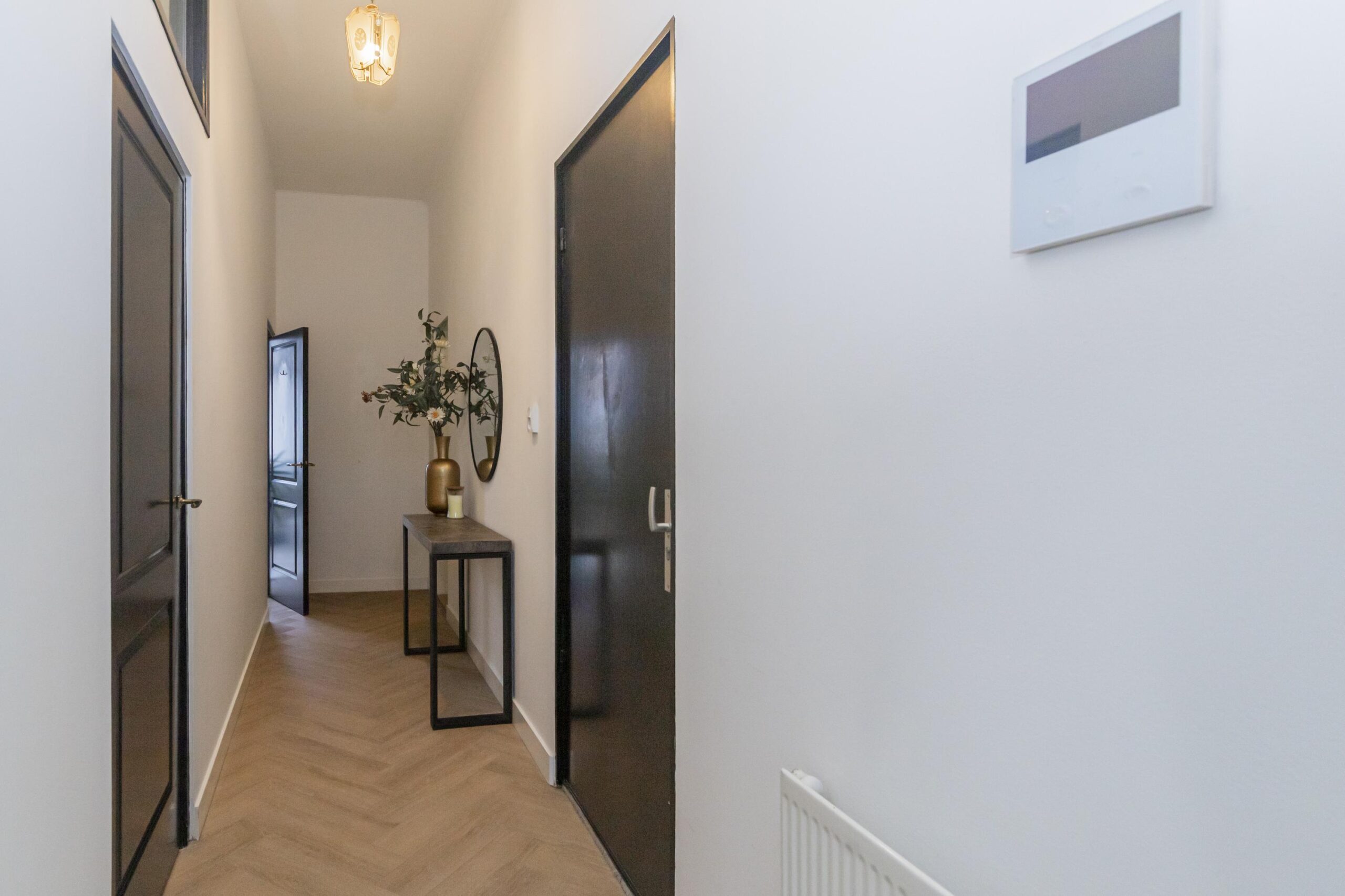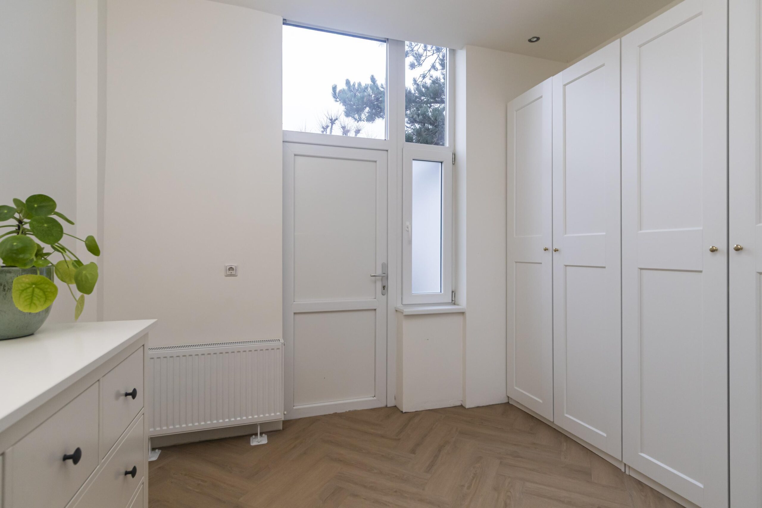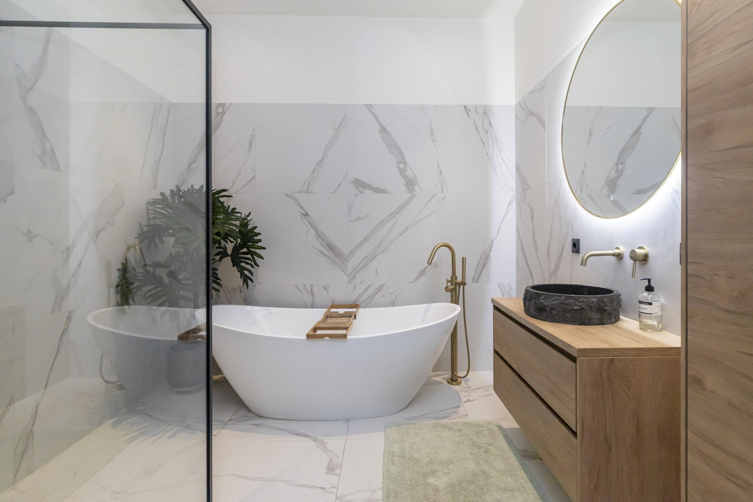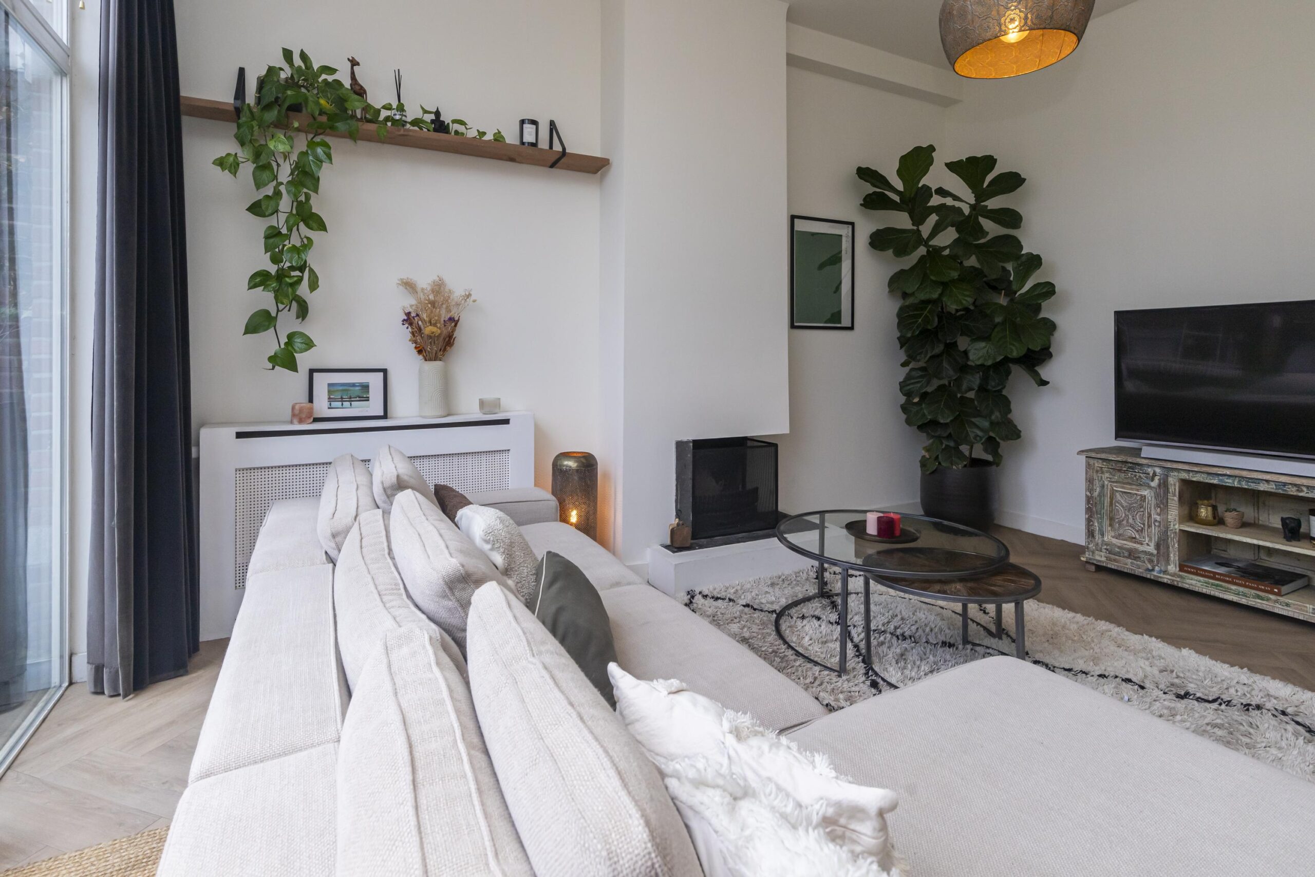 De woonkamer staat in open verbinding met de woonkeuken, eveneens aan de voorzijde gelegen, wat zorgt voor een prettige en open leefruimte. Centraal in de woning ligt de luxe badkamer, uitgevoerd met marmerlook tegelwerk en voorzien van een inloopdouche met glazen wand, een vrijstaand ligbad, een meubel met waskom, ingebouwd leidingwerk en een spiegel met geïntegreerde verlichting.