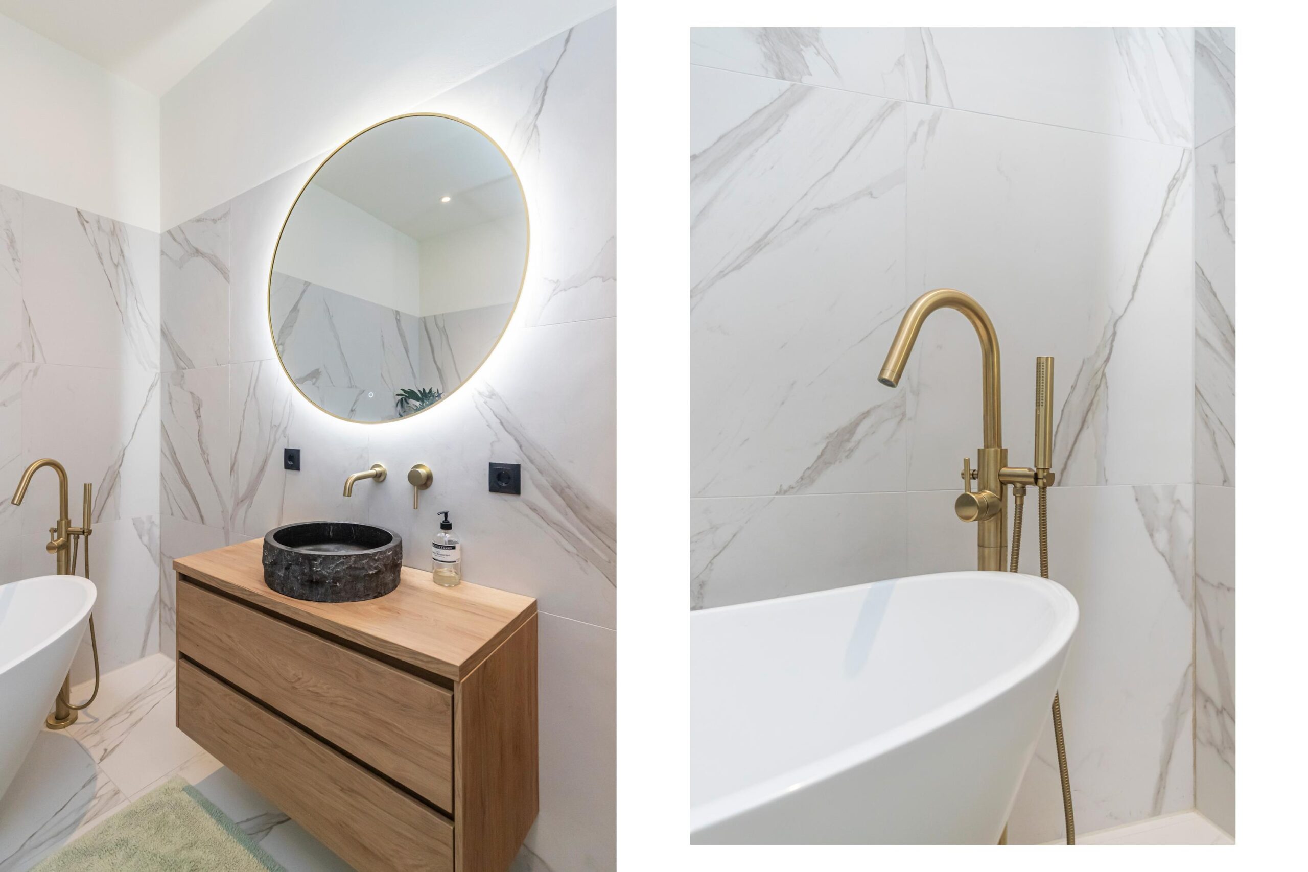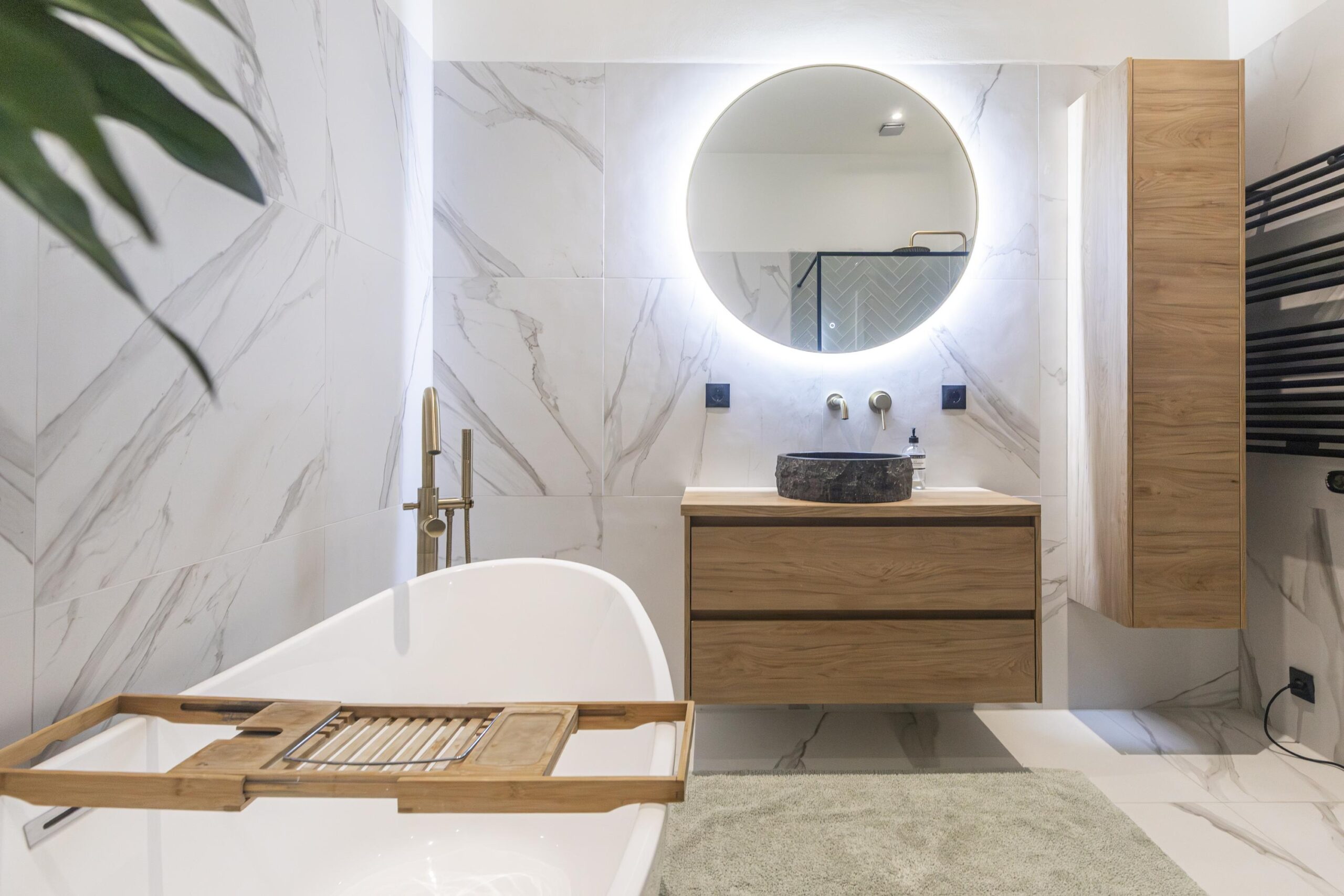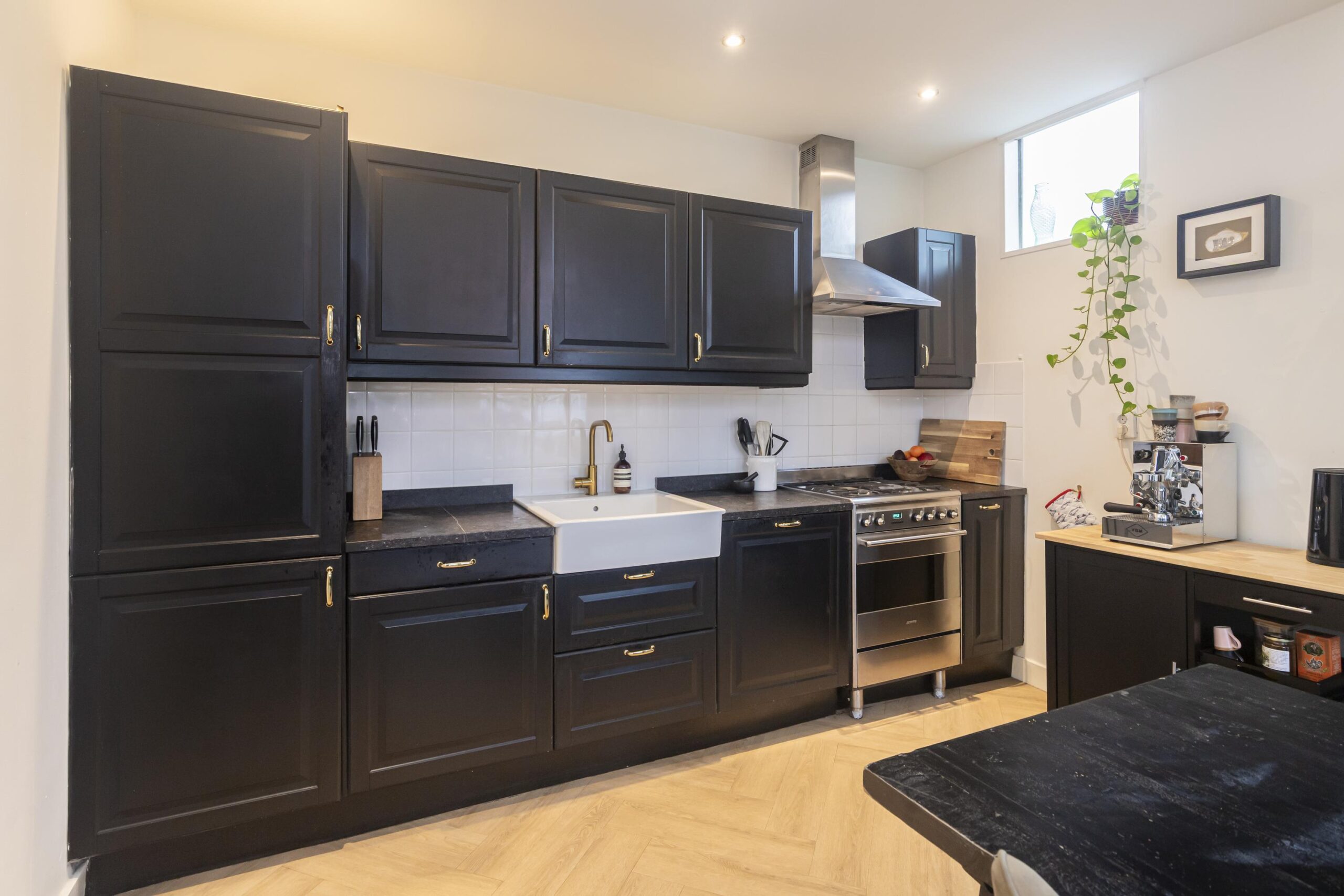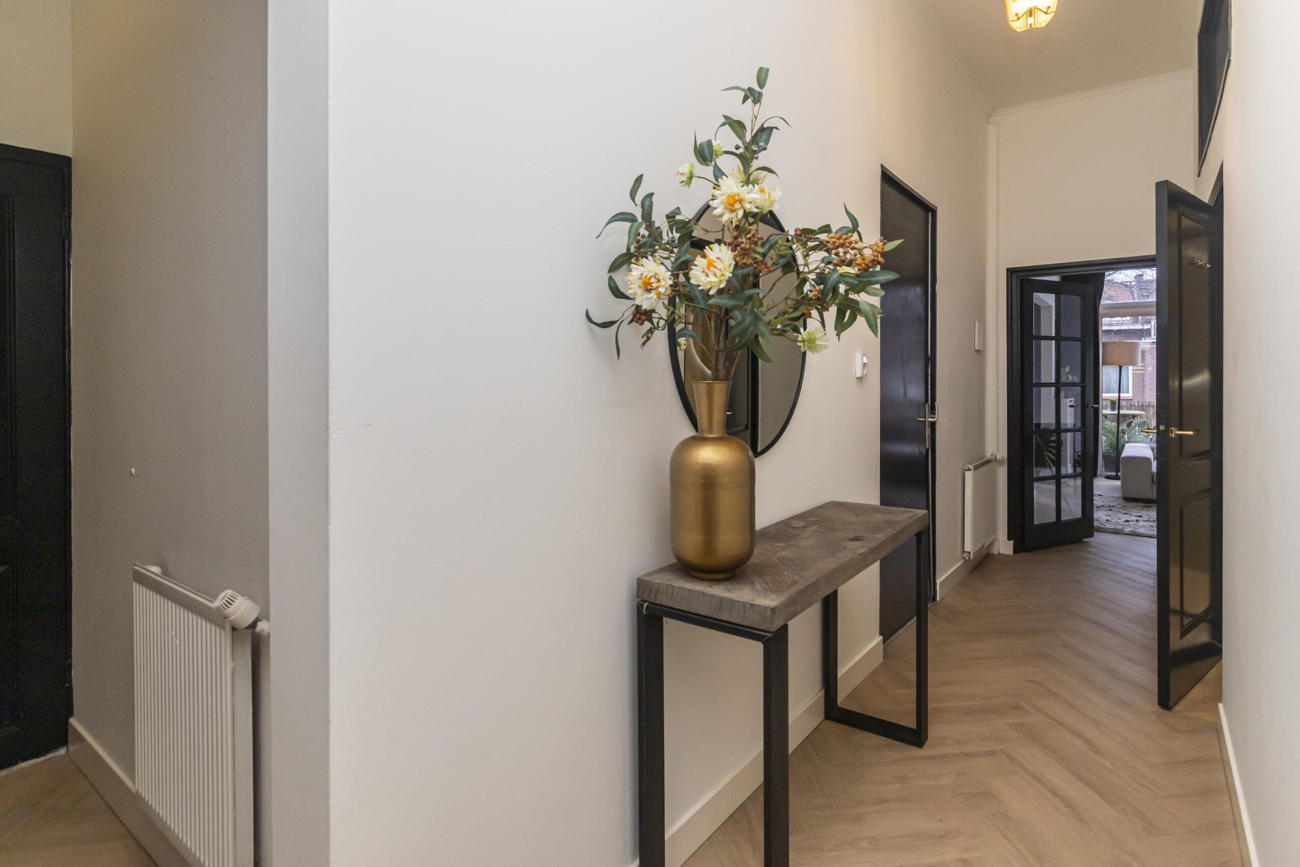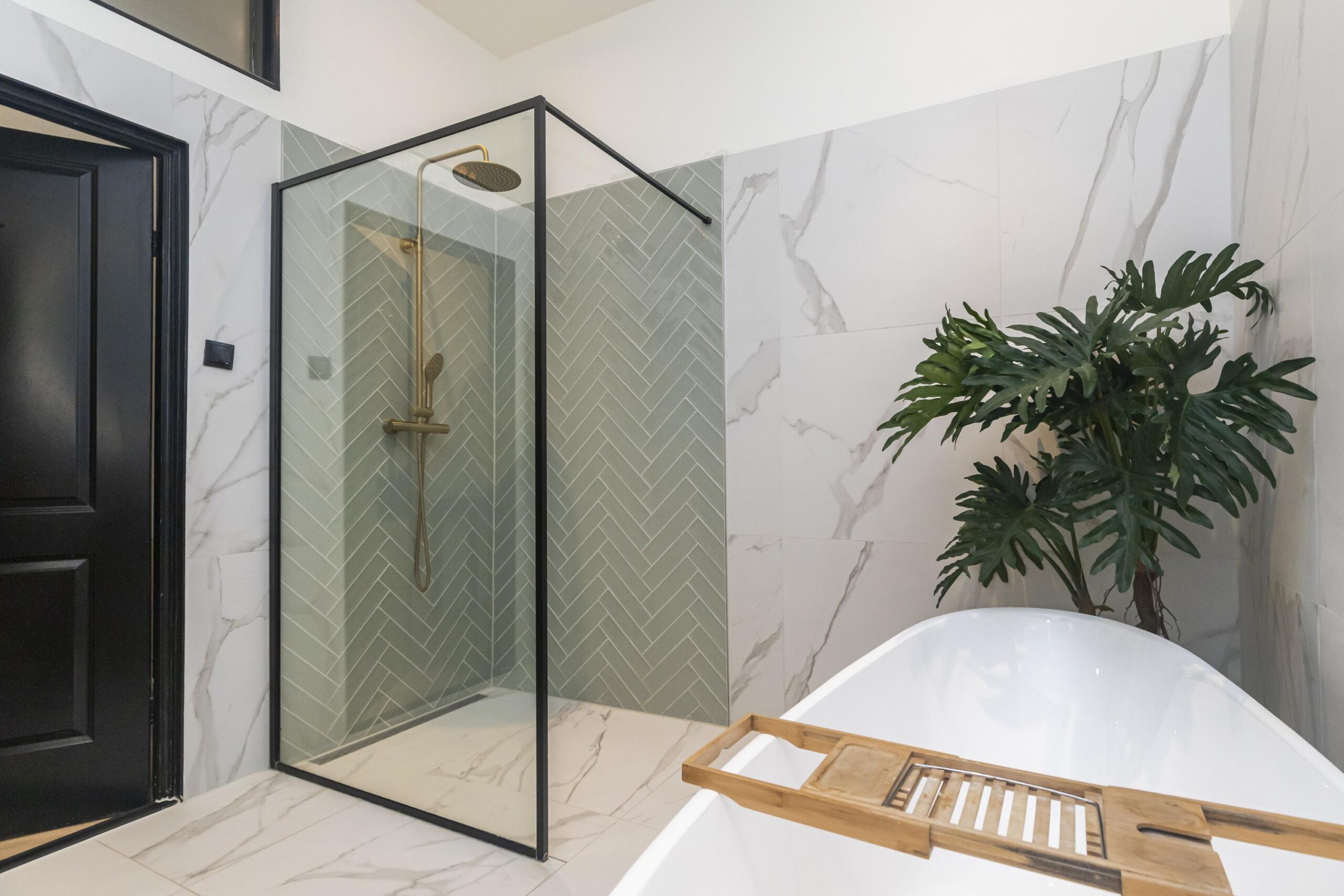 De woonkamer staat in open verbinding met de woonkeuken, eveneens aan de voorzijde gelegen, wat zorgt voor een prettige en open leefruimte. Centraal in de woning ligt de luxe badkamer, uitgevoerd met marmerlook tegelwerk en voorzien van een inloopdouche met glazen wand, een vrijstaand ligbad, een meubel met waskom, ingebouwd leidingwerk en een spiegel met geïntegreerde verlichting.