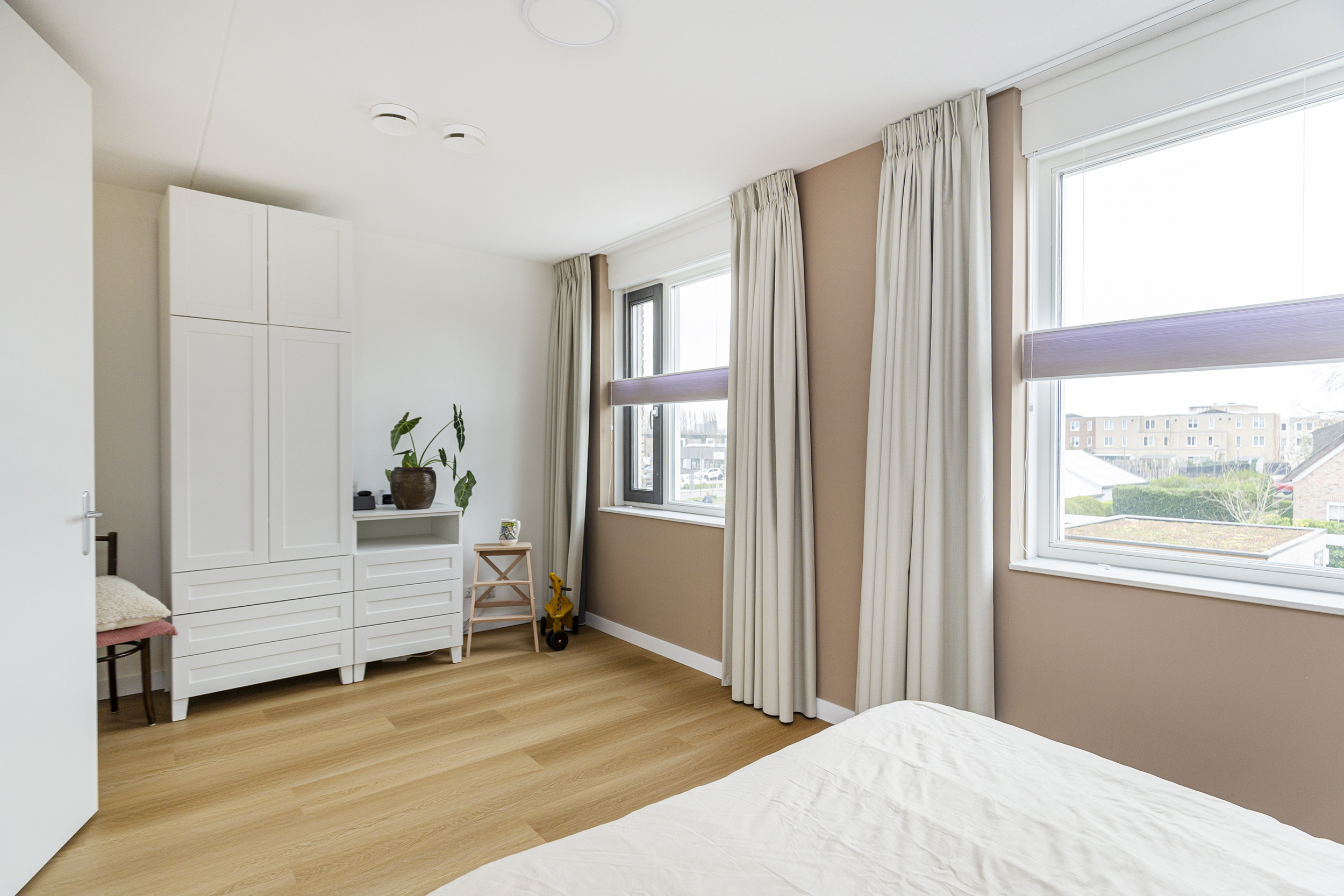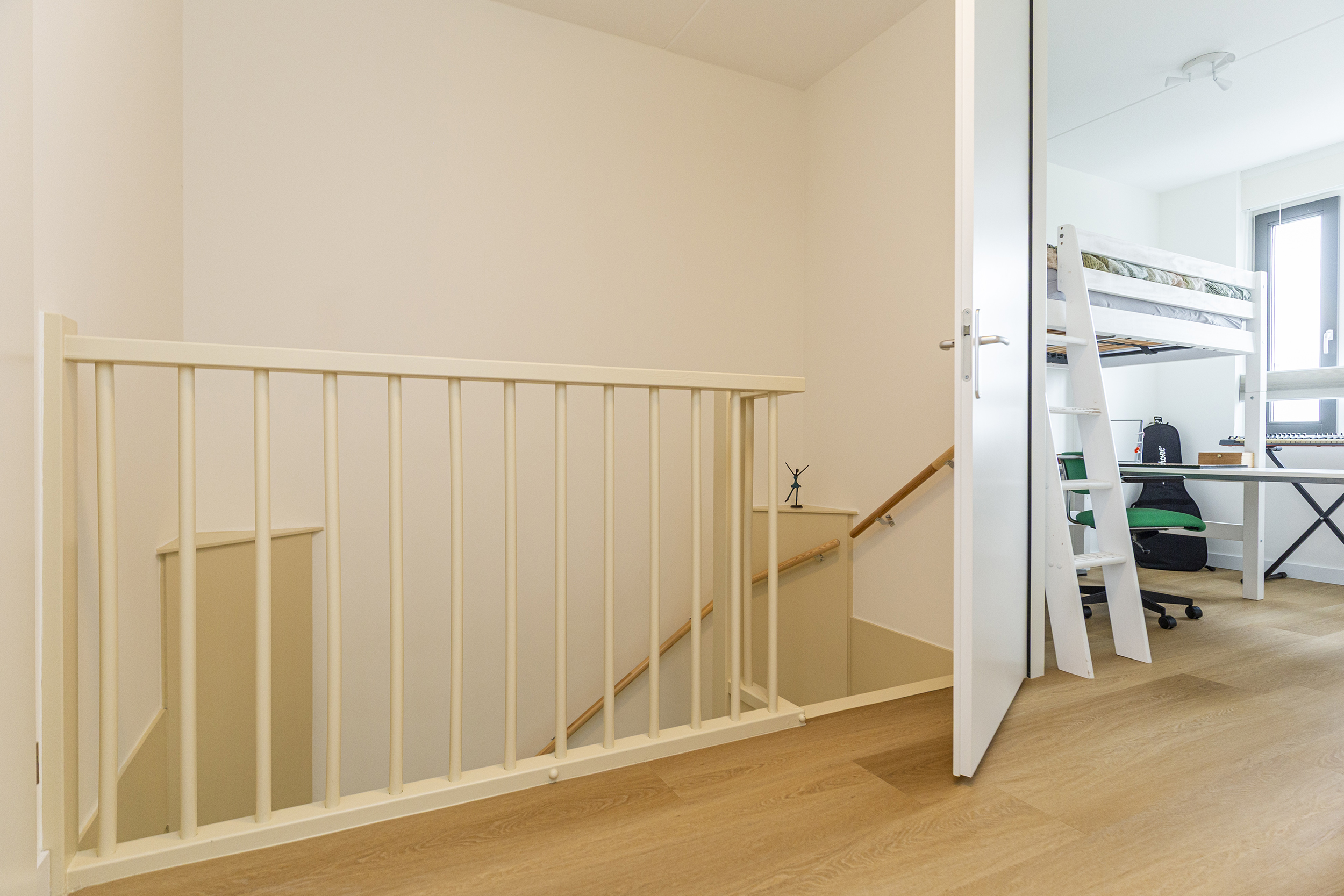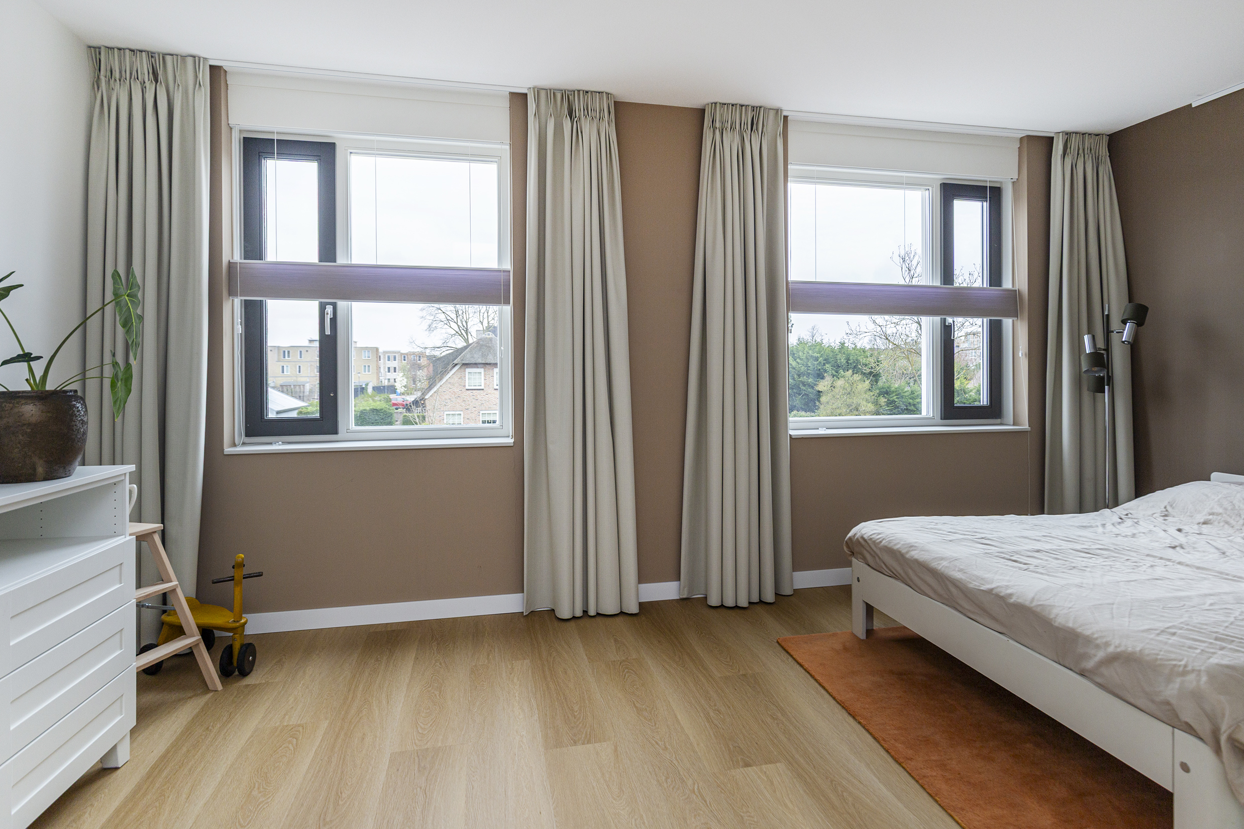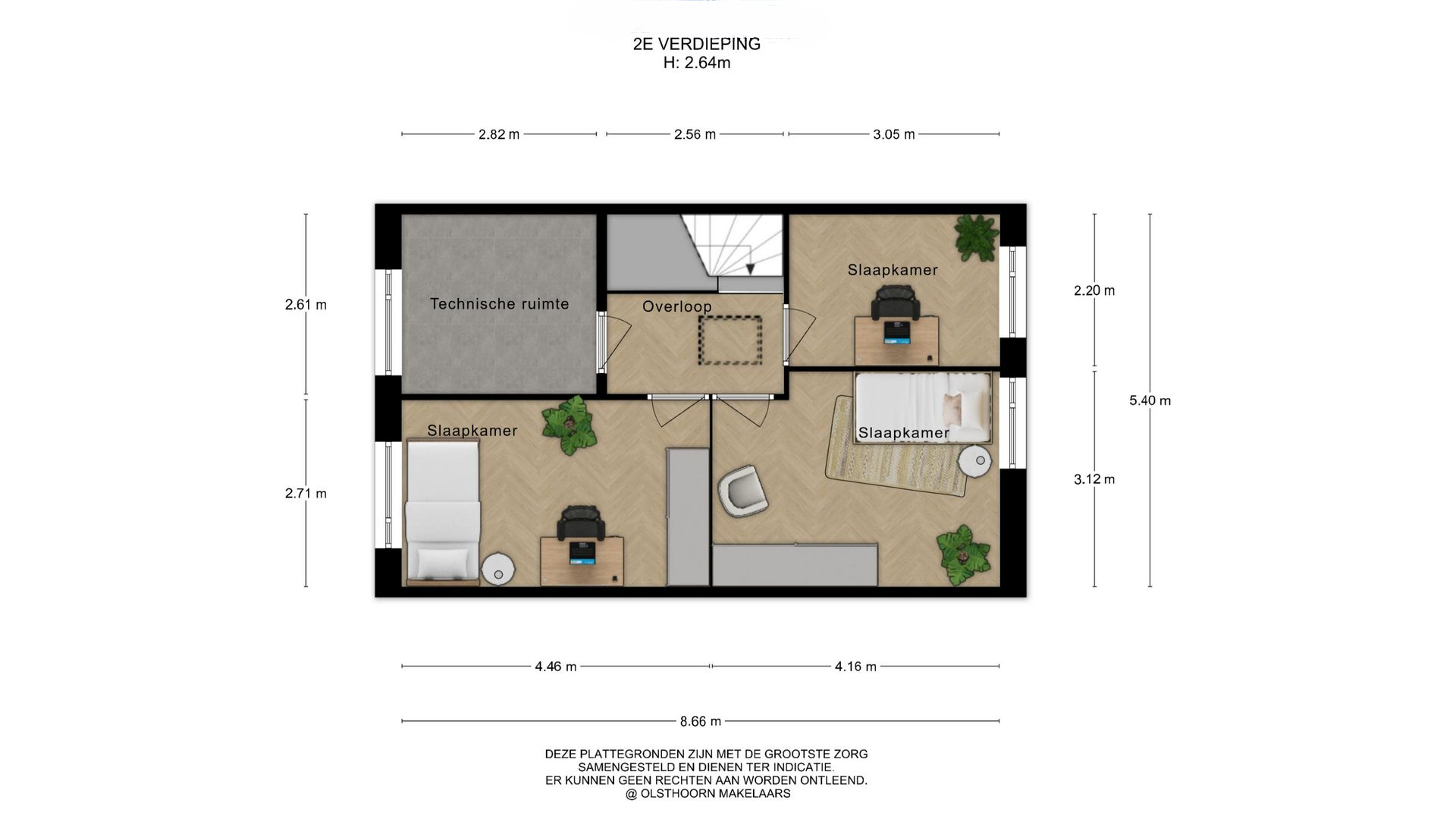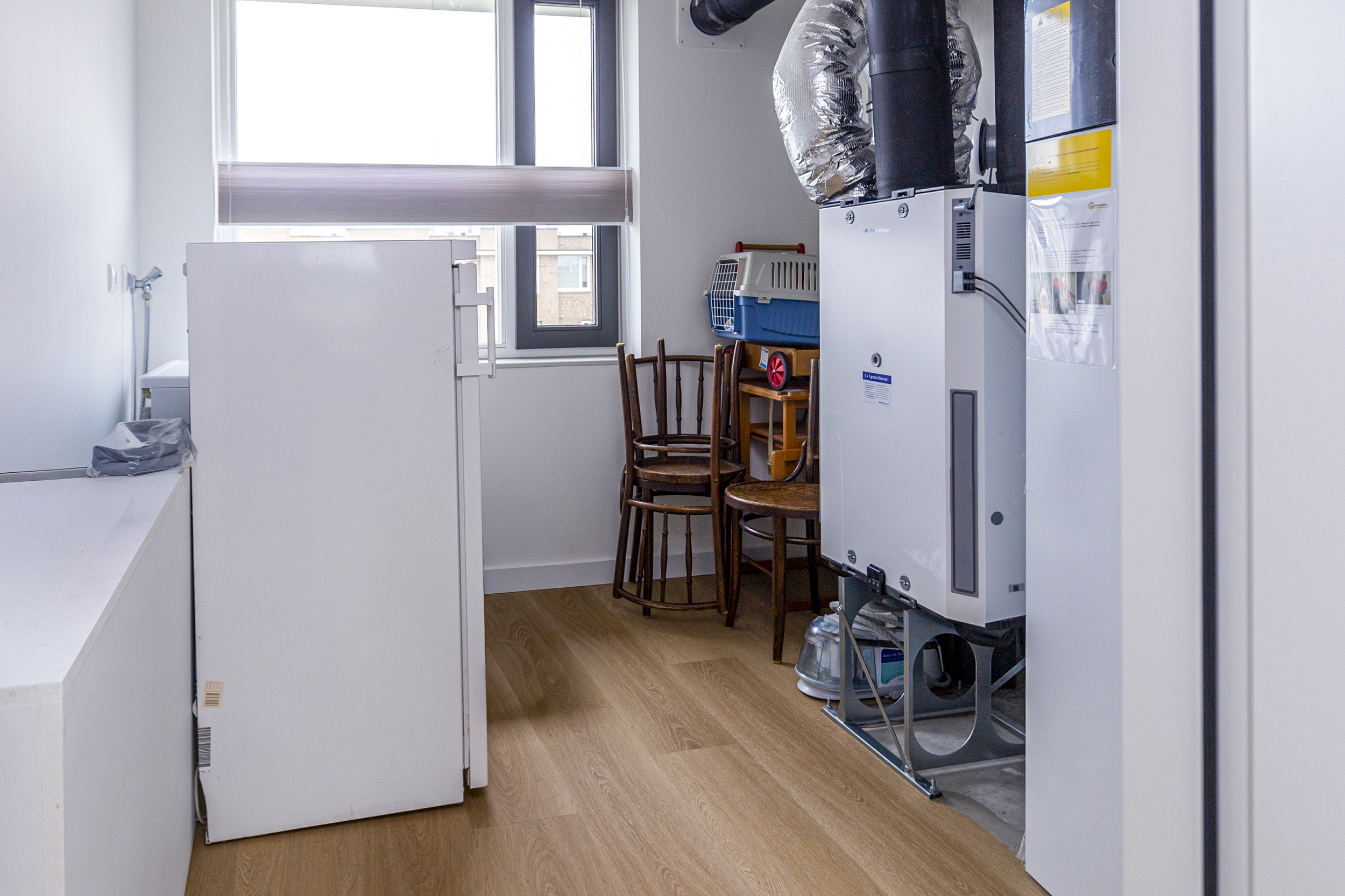 De tweede verdieping biedt drie slaapkamers en een technische ruimte, hier bevindt zich de warmtepomp met boiler en wasmachineaansluiting.