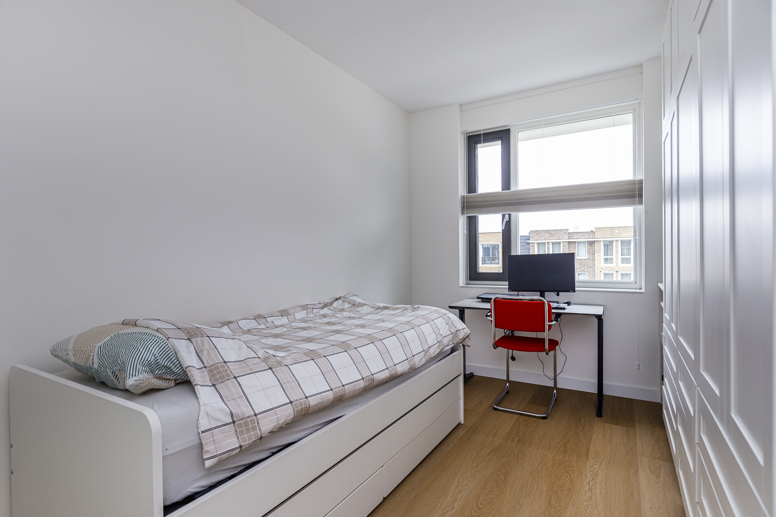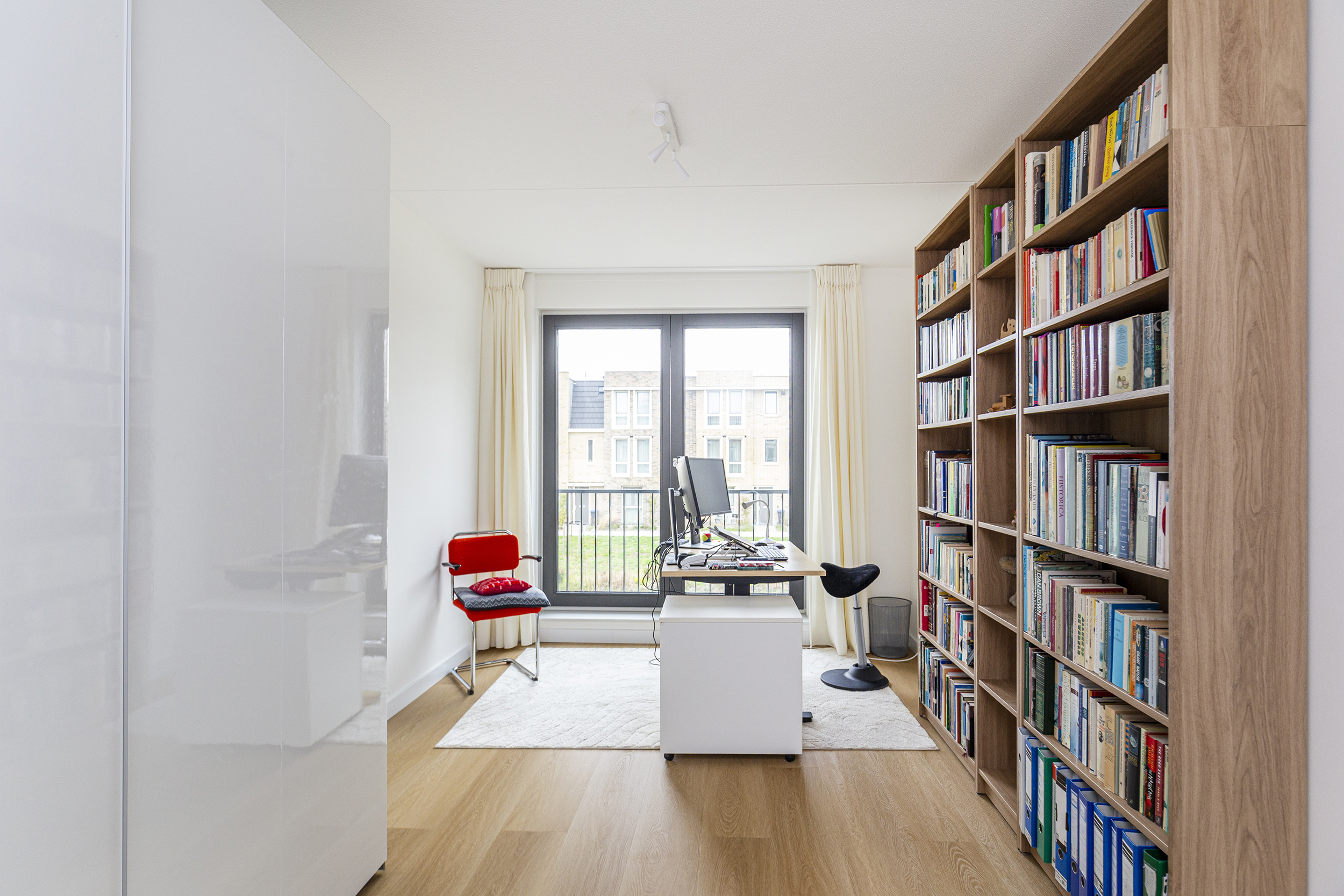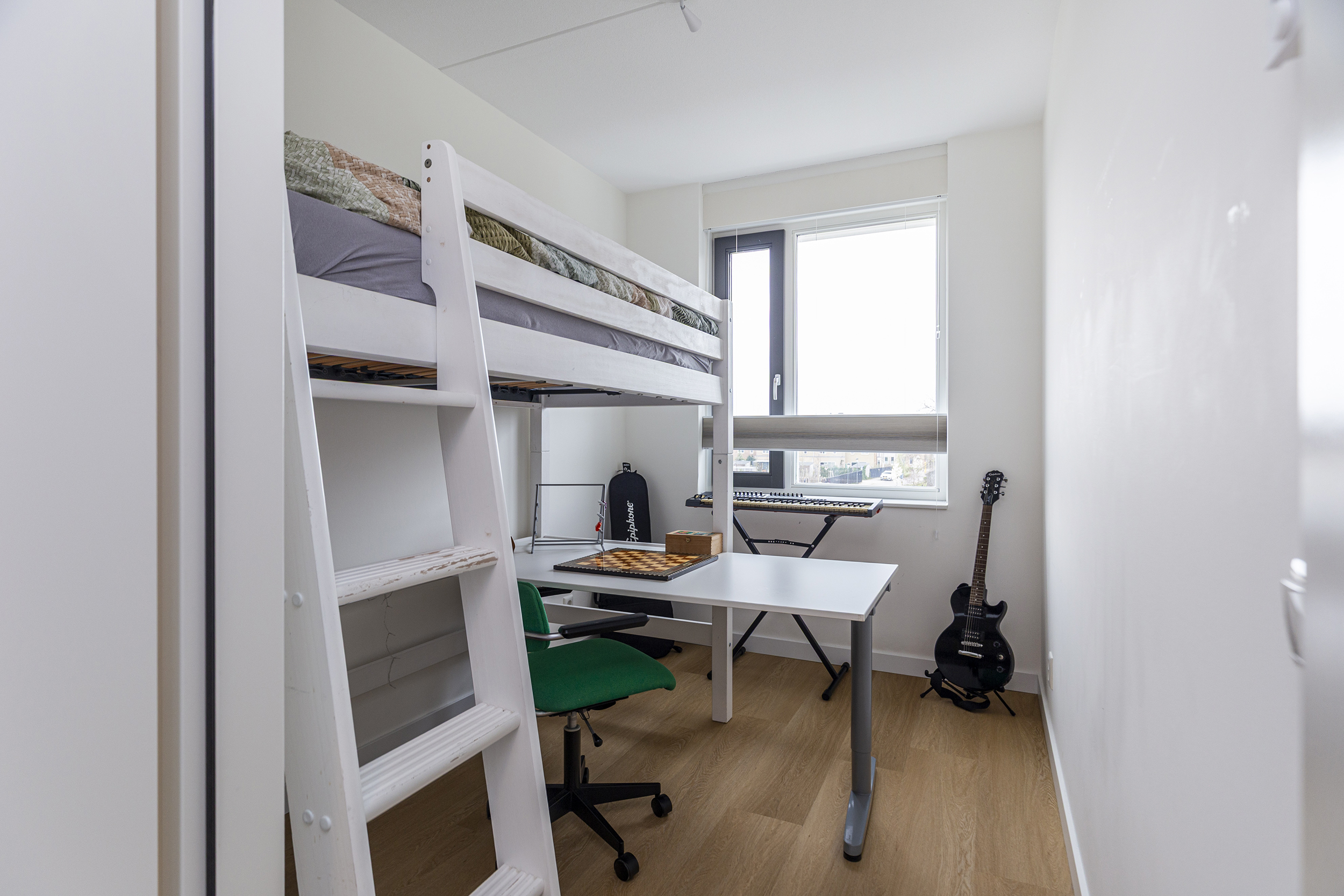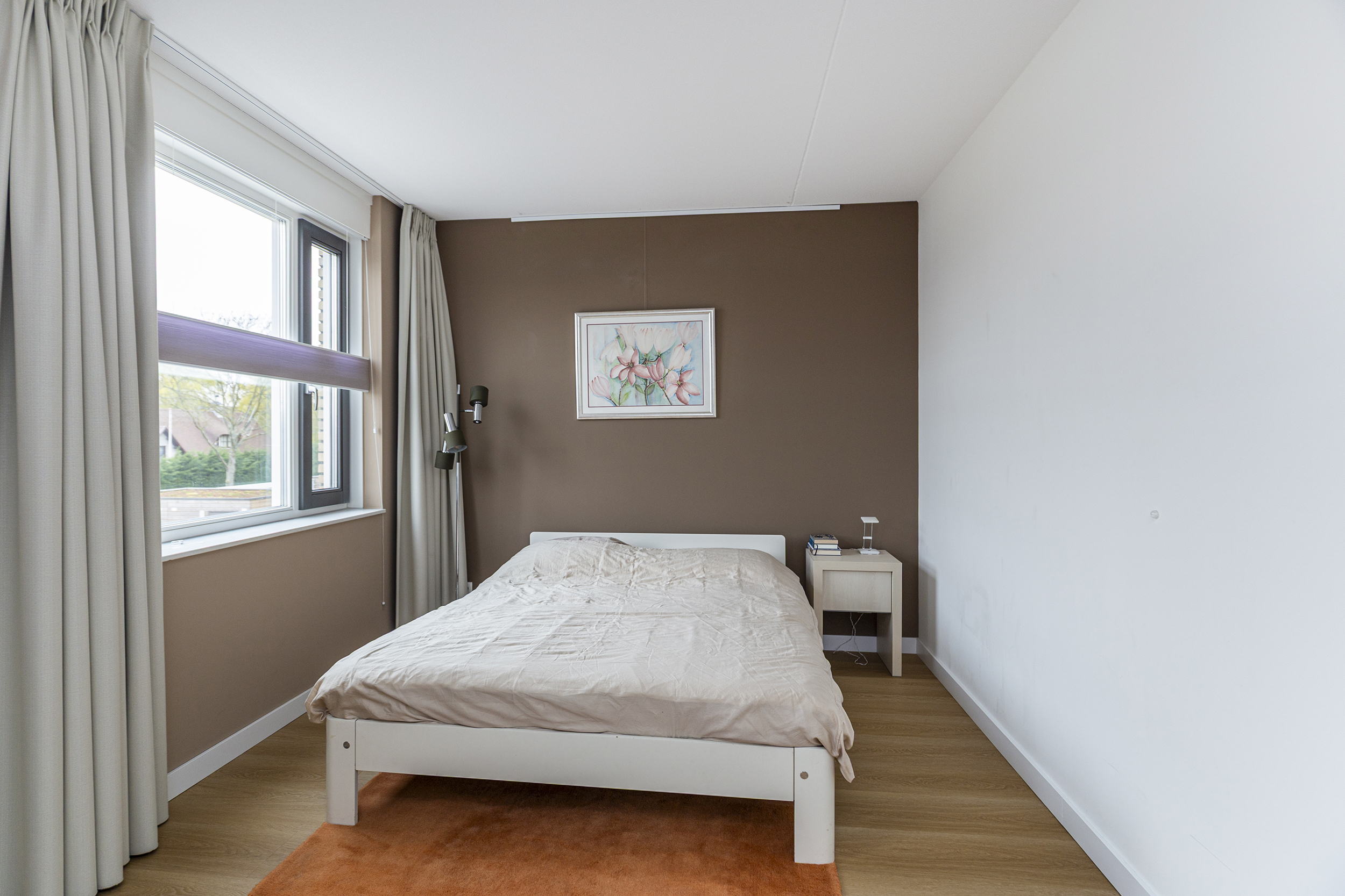 De tweede verdieping biedt drie slaapkamers en een technische ruimte, hier bevindt zich de warmtepomp met boiler en wasmachineaansluiting.