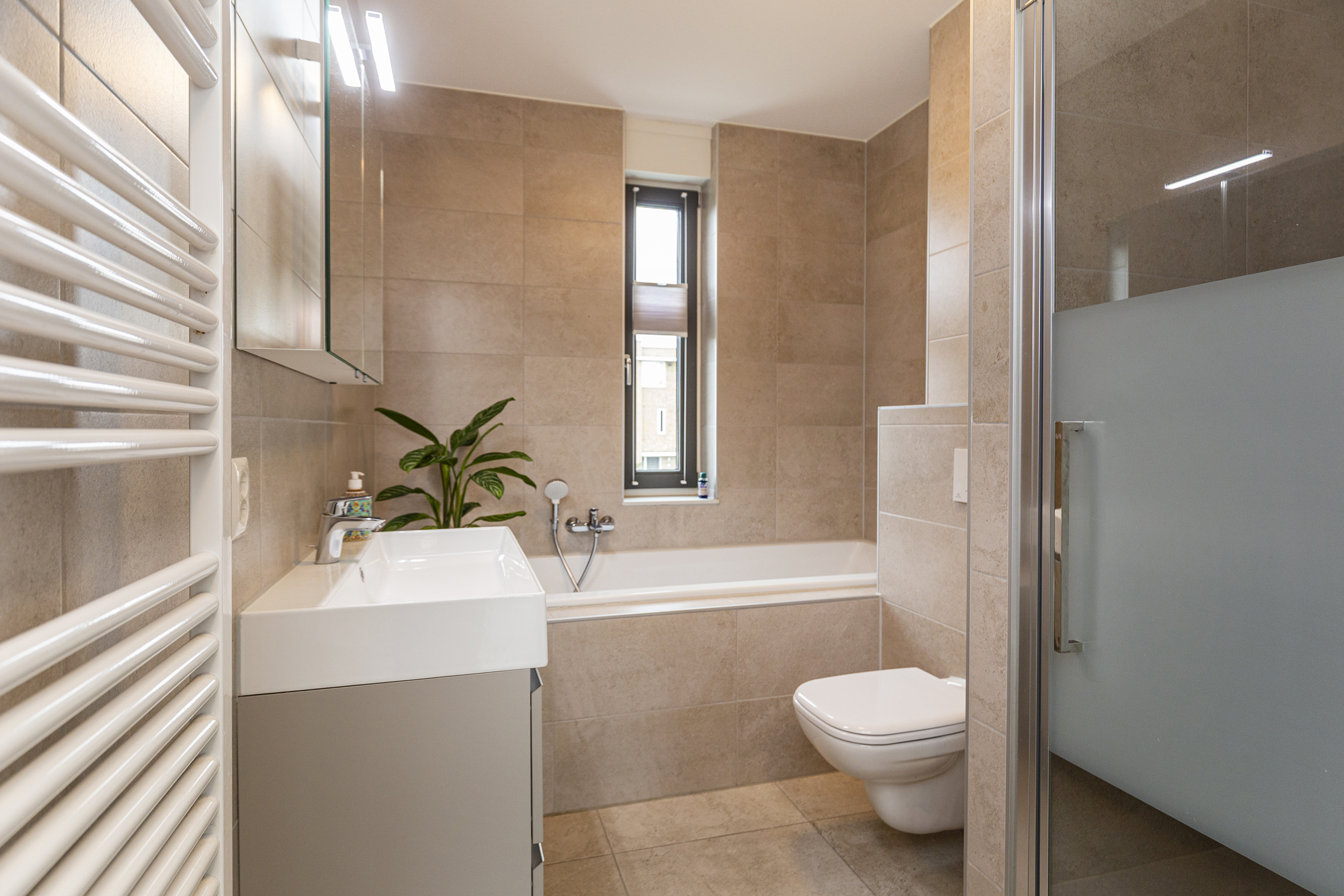 Op deze verdieping bevinden zich twee slaapkamers. De geheel betegelde badkamer is voorzien van modern sanitair en beschikt over een inloopdouche, toilet, wastafelmeubel met dubbele wastafel.