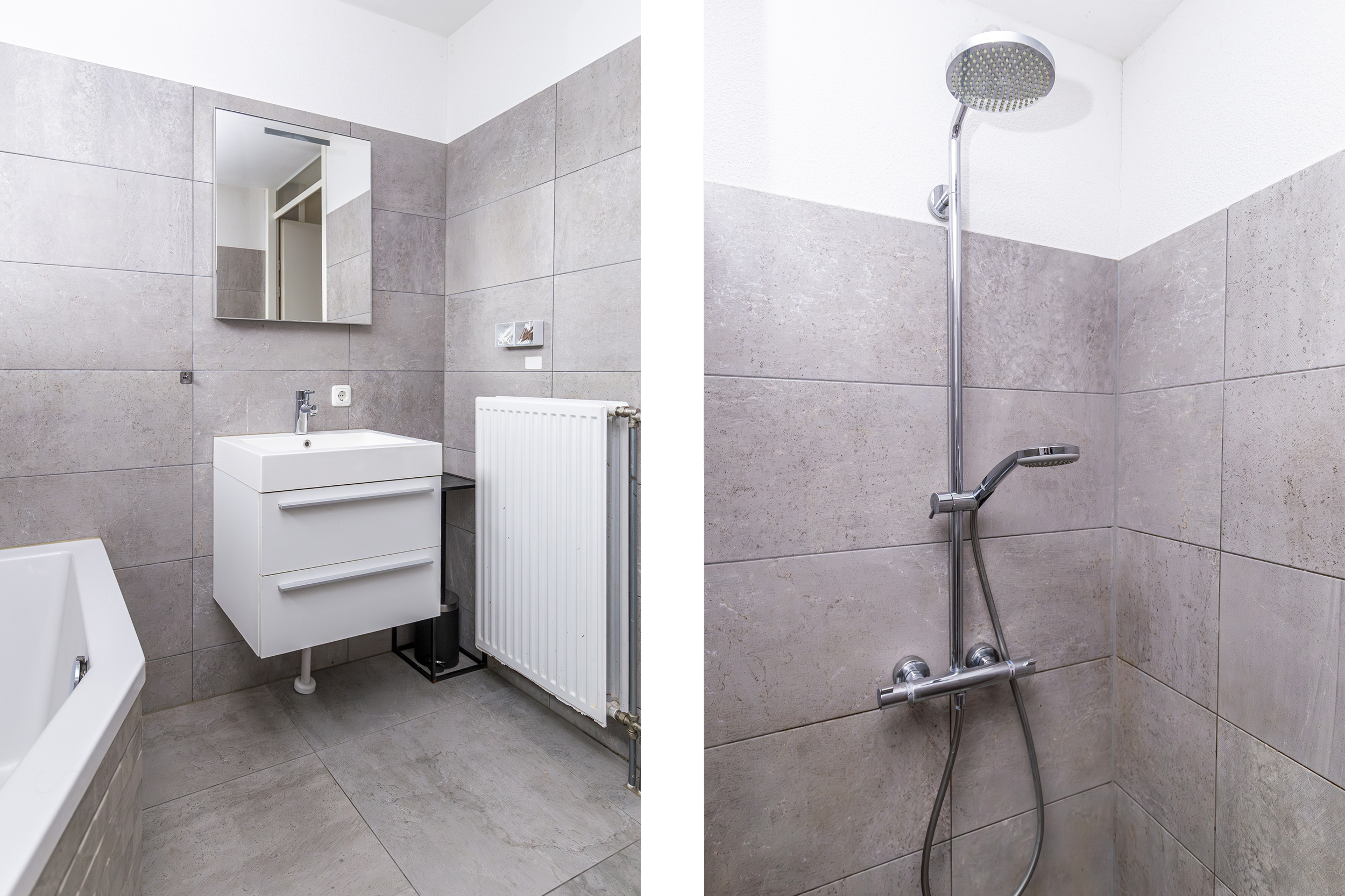 - Badkamervoorzieningen Ligbad, toilet, dubbele wastafel, inloopdouche