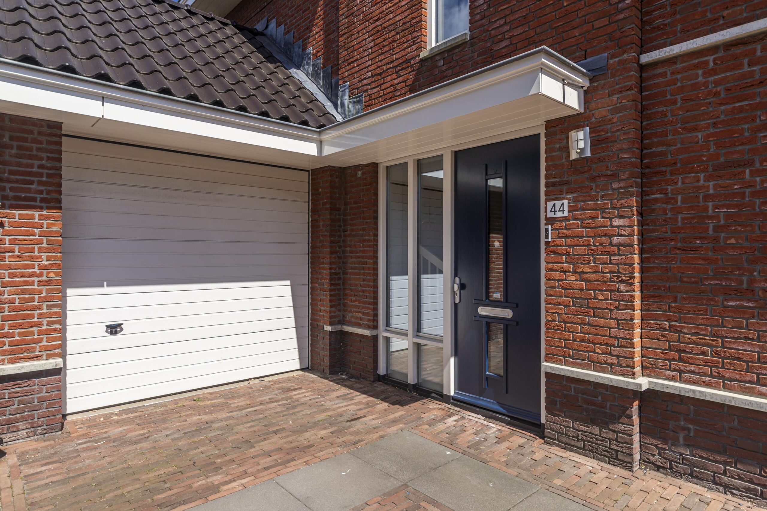 Entree woning via voortuin met dubbele parkeerplaats op eigen oprit en garage met overheaddeur. Hal met trapopgang, trapkast, meterkast en separaat, modern toilet met fonteintje.