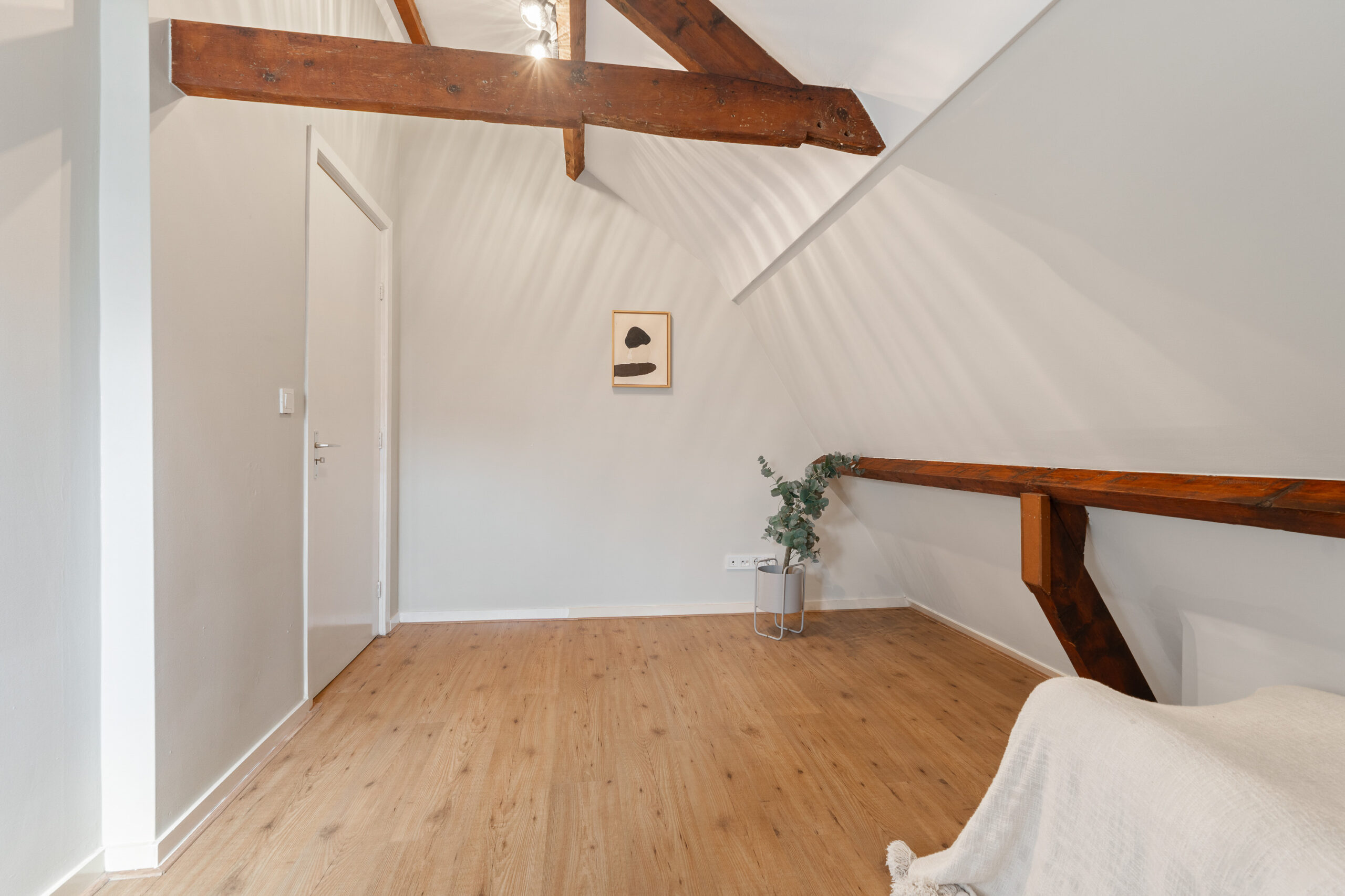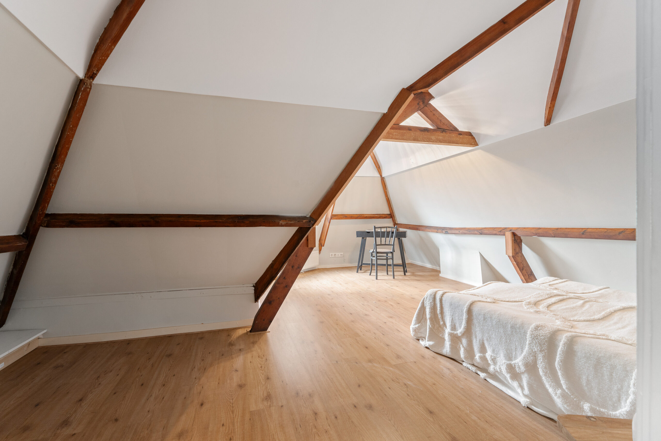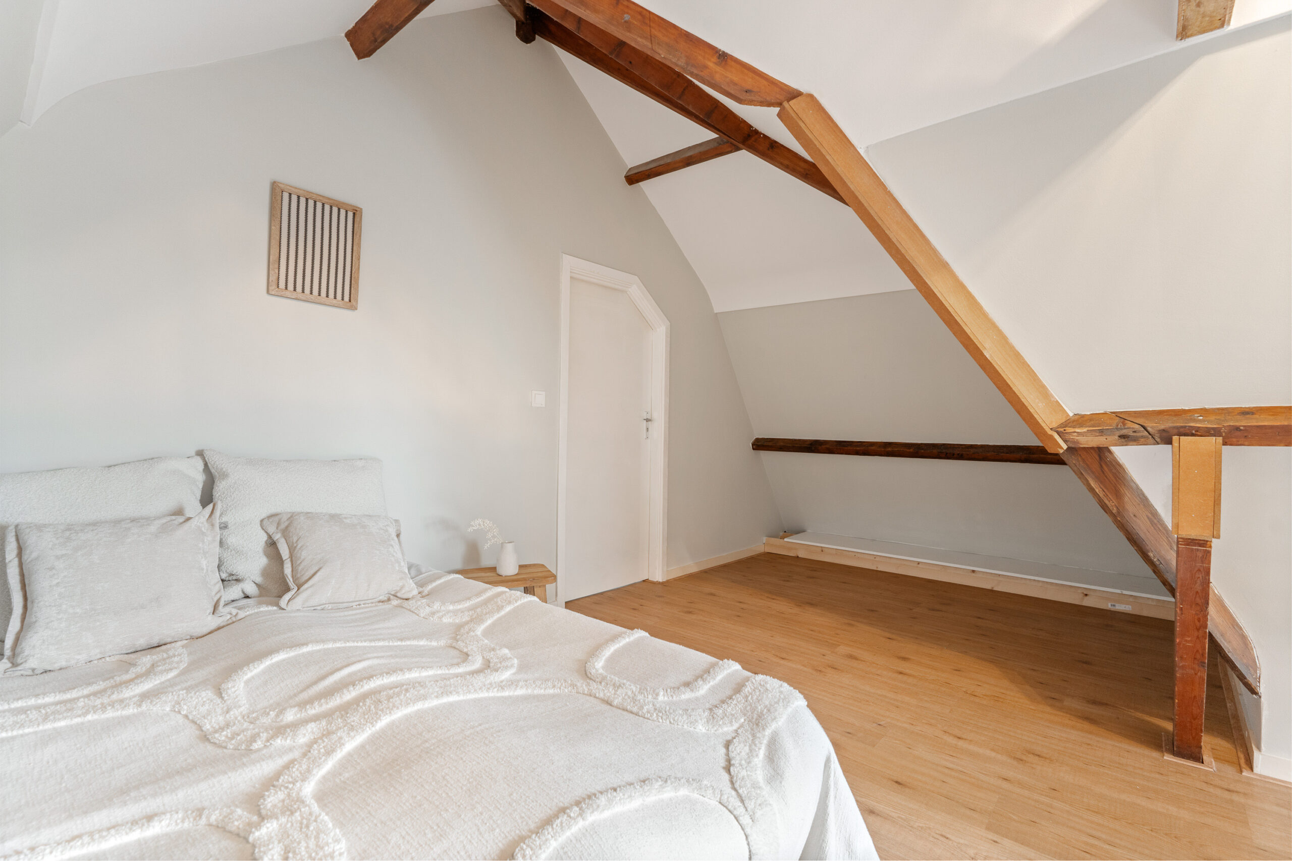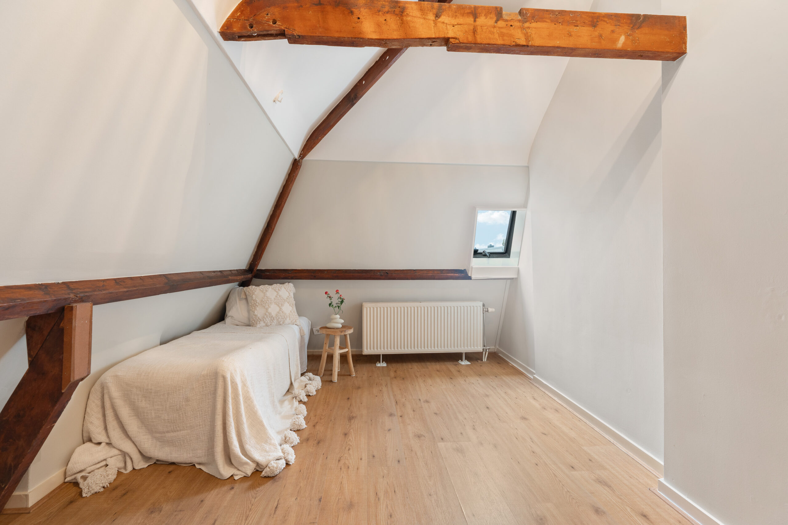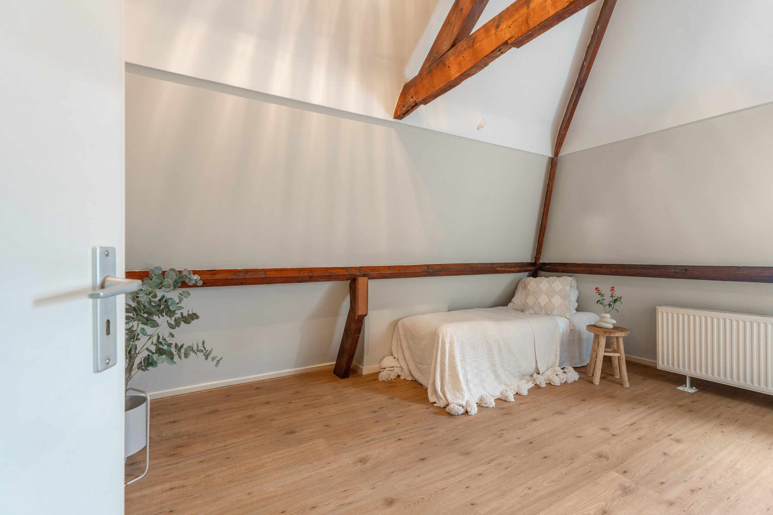 In de hal bevindt zich een vaste trap die je naar de slaapverdieping leidt. in deze kapverdieping bevinden zich twee royale slaapkamers en de badkamer. Beide slaapkamers bieden voldoende ruimte voor een tweepersoonsbed én een grote kledingkast. De zichtbare houten balken geven de kamers een warme, karakteristieke uitstraling.