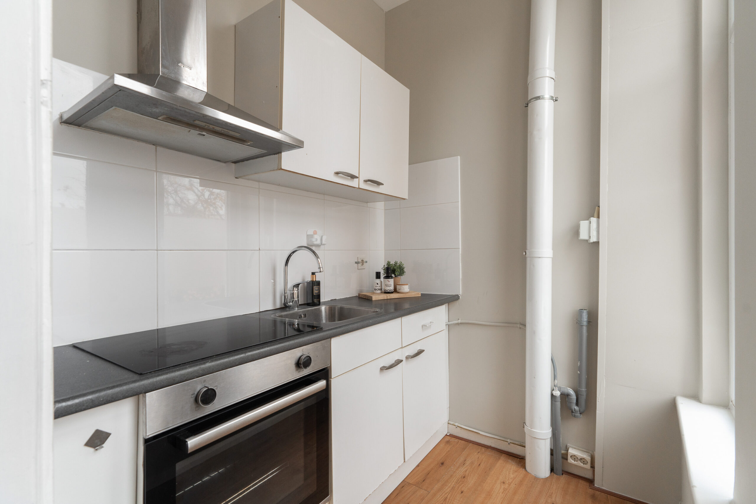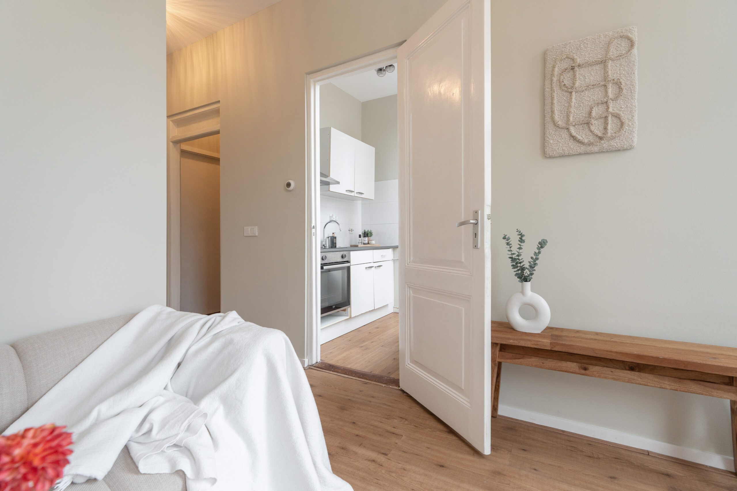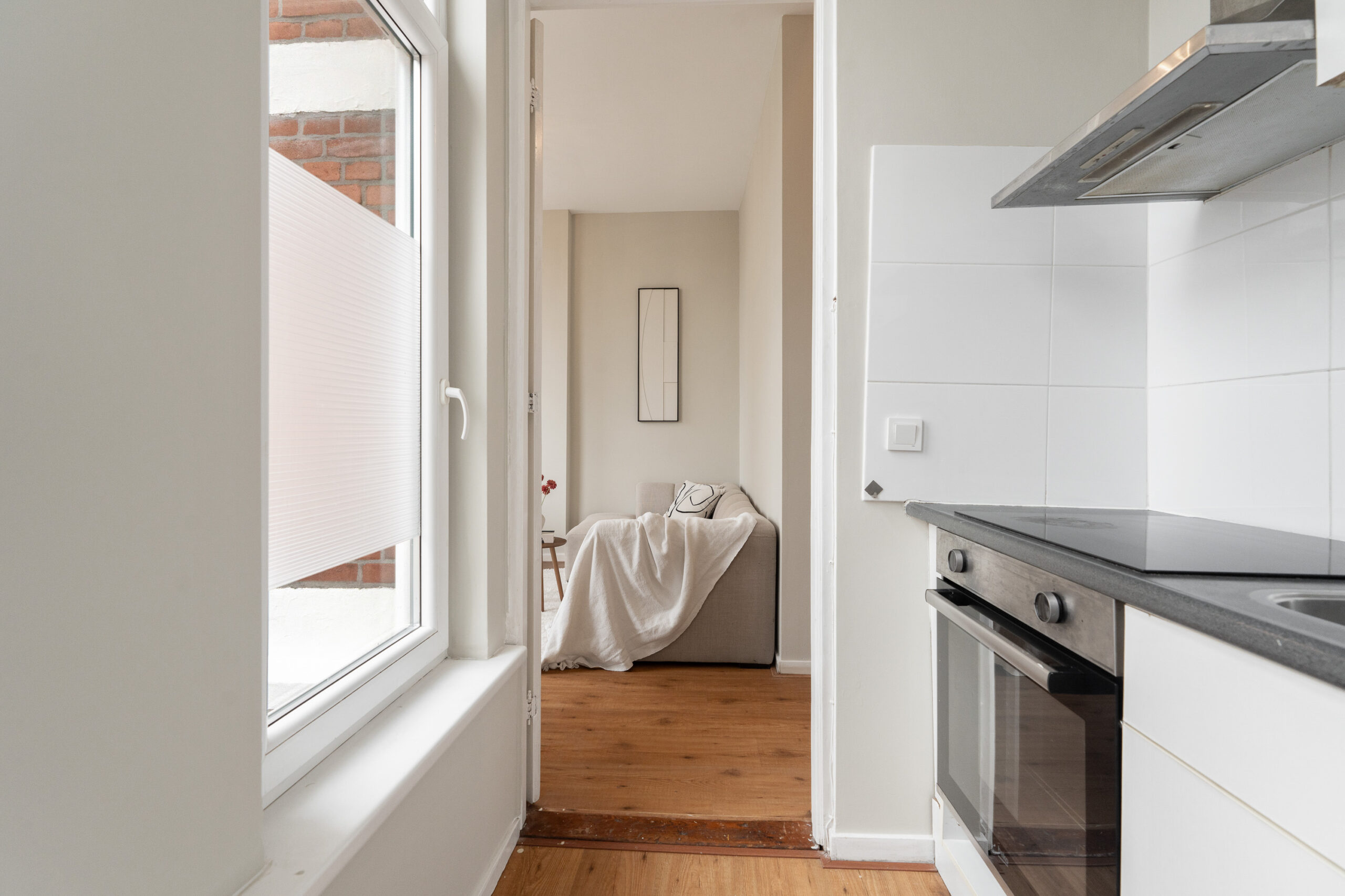 Het appartement is bereikbaar via de gezamenlijke entree en een lange trap die leidt naar de tweede woonlaag. Bij binnenkomst stap je direct de lichte en sfeervolle woonkamer binnen, waar veel daglicht naar binnen valt. Vanuit de woonkamer heb je toegang tot de gesloten keuken. De keuken is voorzien van diverse gemakken, zoals een afzuigkap, inbouwoven en een inductiekookplaat.