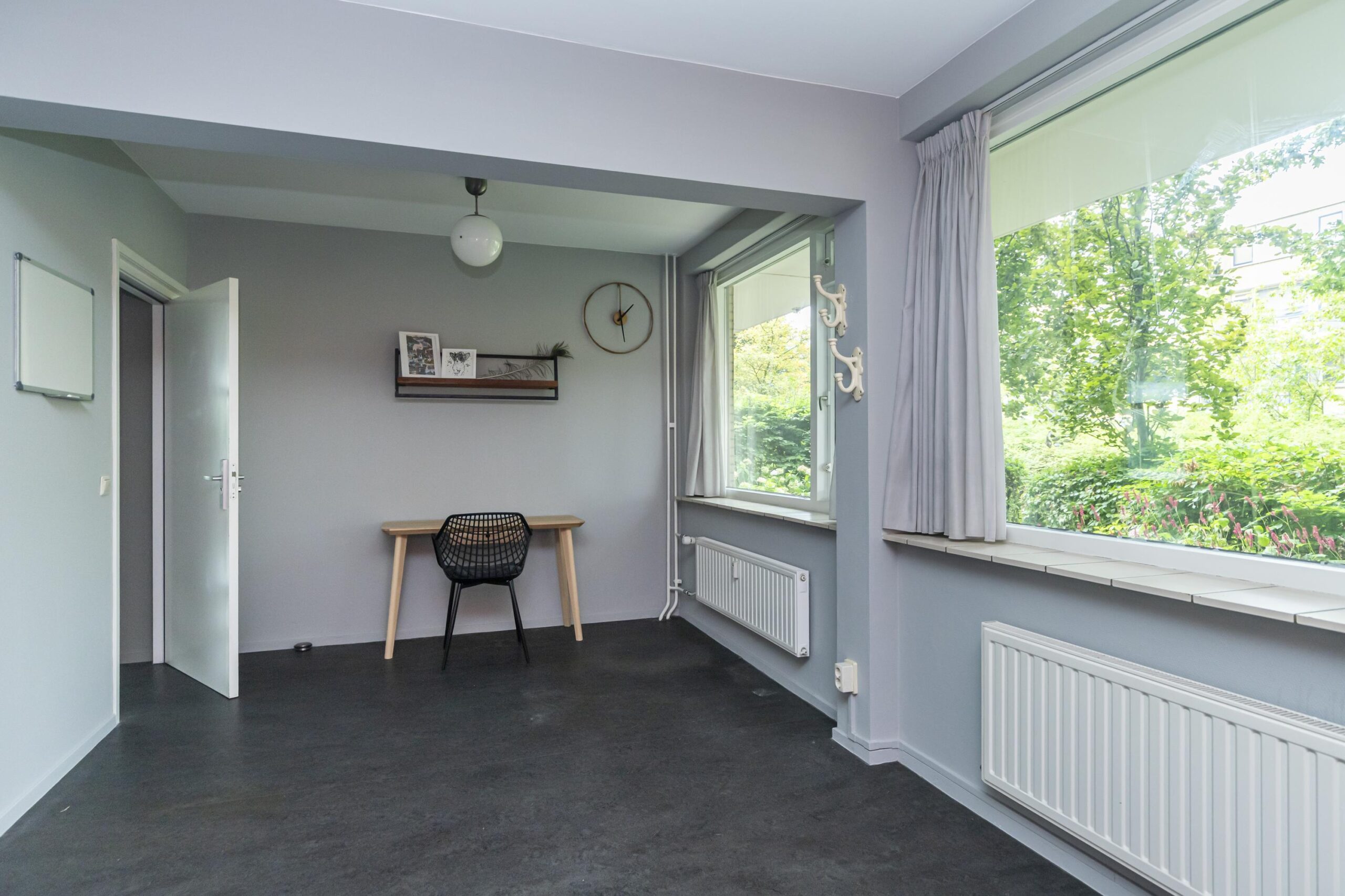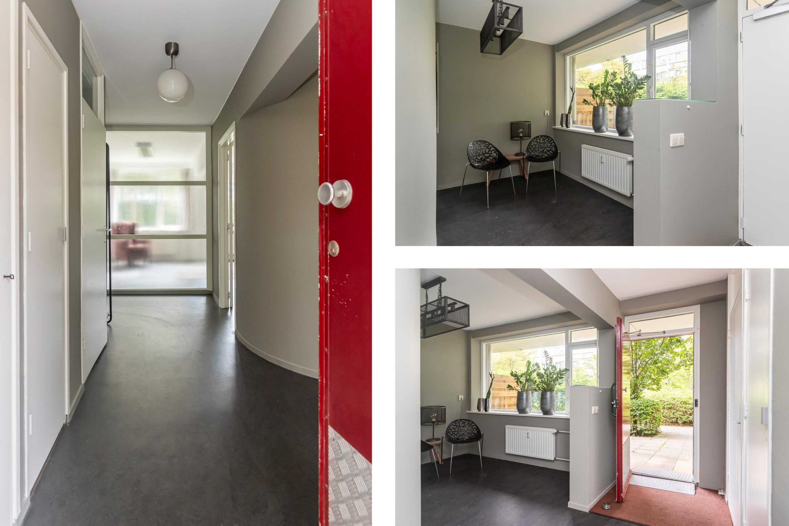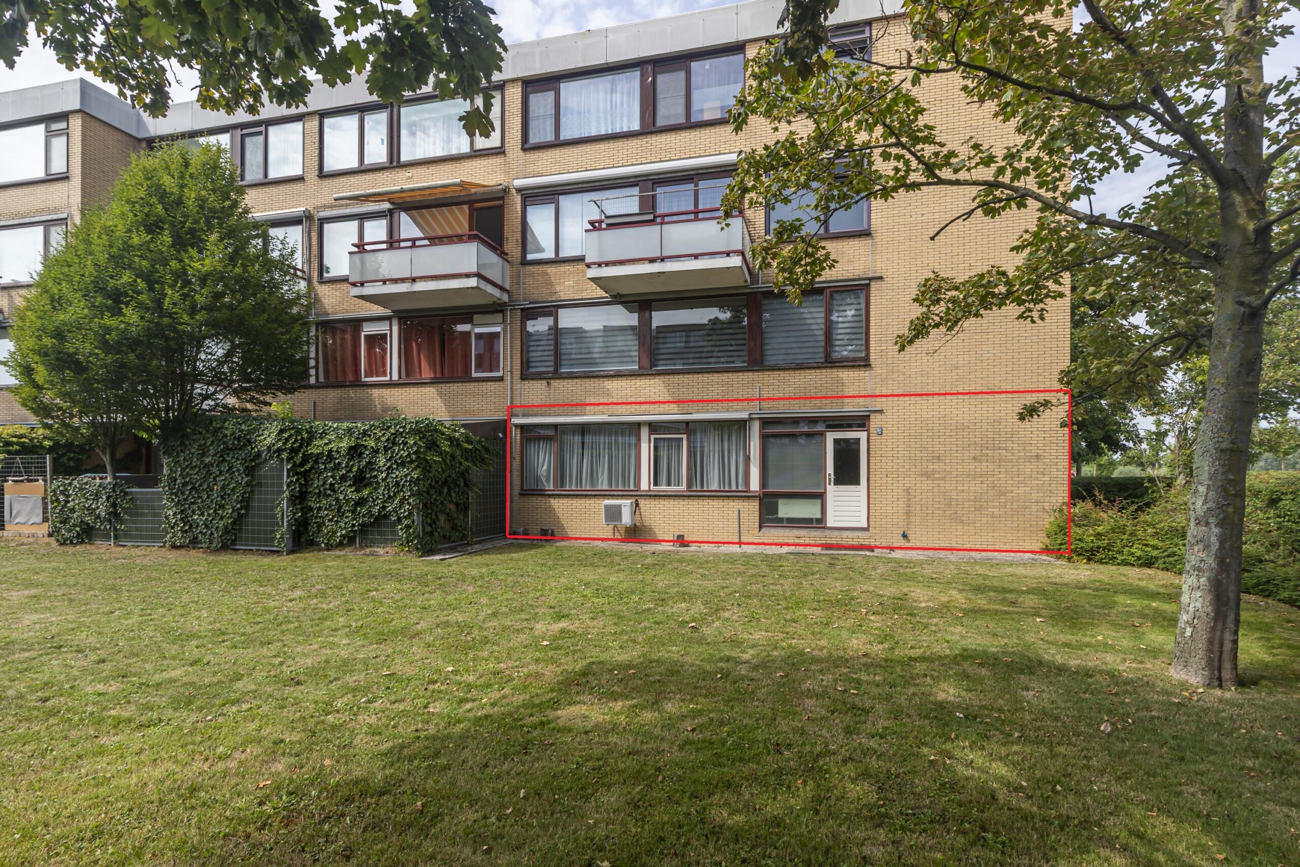 Bij binnenkomst via de centrale entree bevindt zich het bellentableau en de brievenbussen. Via de voortuin bereikt u de entree van de benedenwoning. Bij binnenkomst treft u de ruime hal met toegang tot alle vertrekken. Aan uw linkerzijde vindt u de meterkast en een voorraadkast, waar tevens de warmwaterboiler gepositioneerd is. De toiletruimte is separaat en is tevens voorzien van een fonteintje. De L-vormige woonkamer beschikt over grote raampartijen, waardoor er veel daglicht toetreding is. Er is een airconditioning geïnstalleerd in de woonkamer zodat ook in de zomer een aangenaam binnenklimaat wordt gerealiseerd. De woning beschikt over twee goed bemeten slaapkamers, die flexibel in te delen zijn als hoofdslaapkamer, kinderkamer of werkkamer. De tussenliggende keuken is voorzien van een keukenblok. Tevens is de wasmachineaansluiting hier gevestigd. Momenteel is er geen badkamer aanwezig, maar de woning biedt uitstekende mogelijkheden om deze naar eigen wens te realiseren. Zo kan er bijvoorbeeld gekozen worden voor een badkamer ensuite bij de hoofdslaapkamer of een separate badkamer elders in de woning. Vanuit de slaapkamer aan de achterzijde heeft u toegang tot de achtertuin.