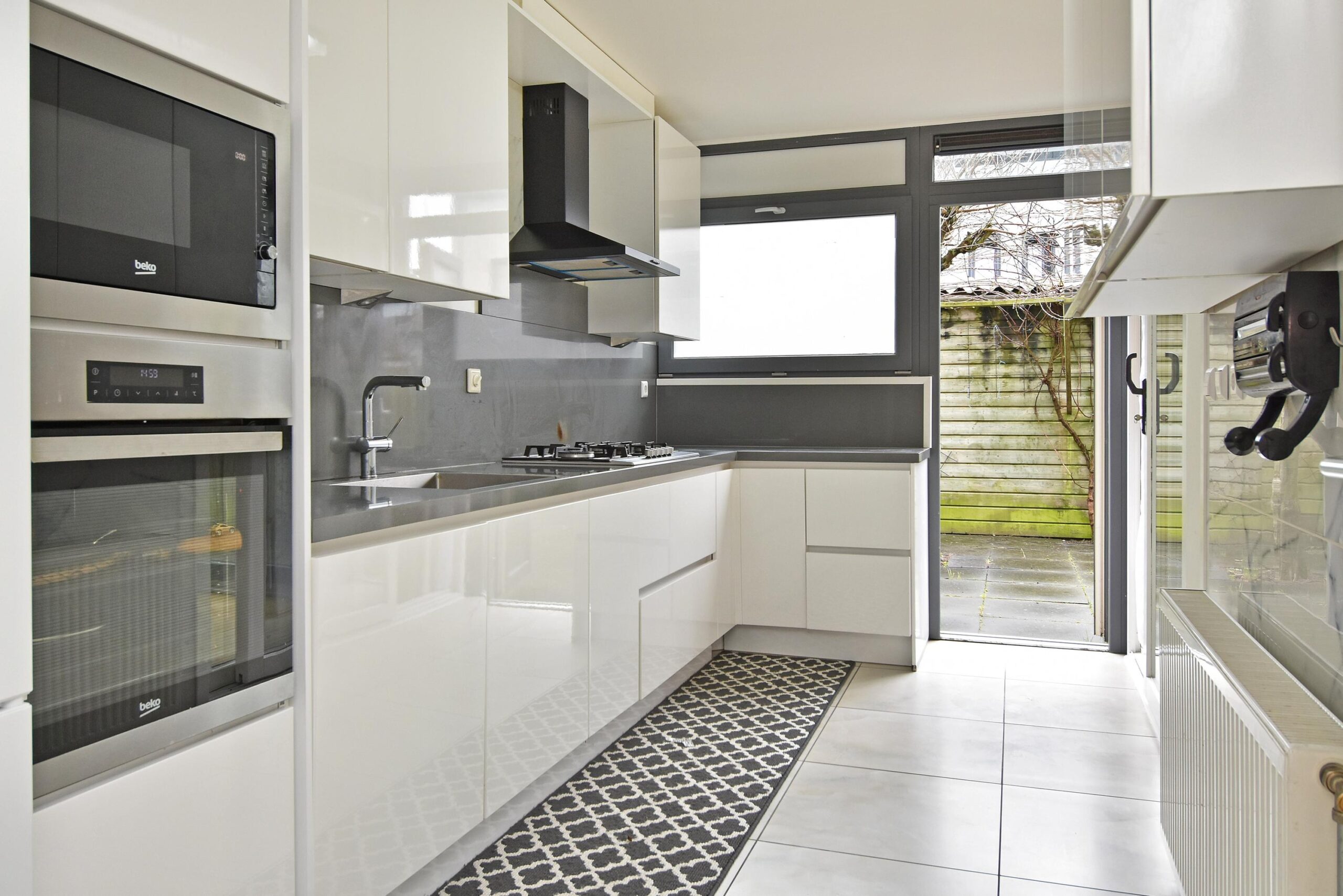 Via de voortuin bereikt u de entree van de woning. In de hal bevinden zich de meterkast, het toilet met fontein en een praktische trapkast. De keuken is aan de achterzijde gesitueerd en voorzien van een oven, magnetron, vaatwasser, 5-pits gasfornuis en afzuigkap. Vanuit de keuken is er toegang tot de achtertuin en via een schuifdeur staat de keuken in verbinding met de woonkamer.