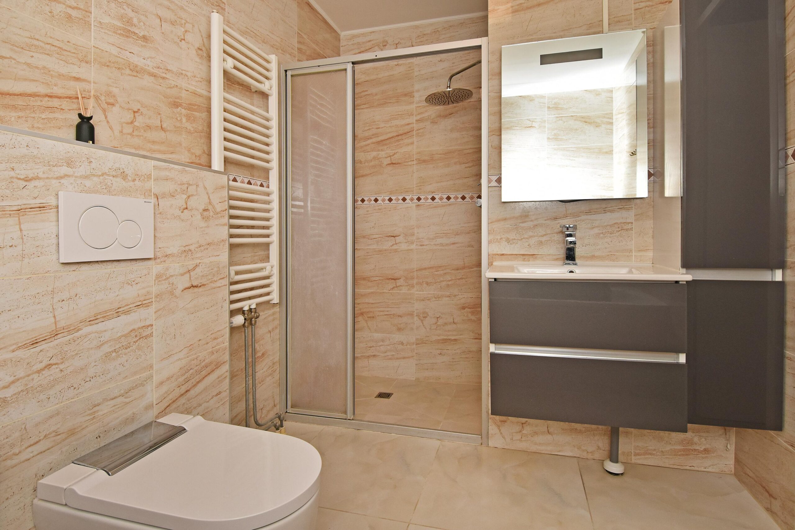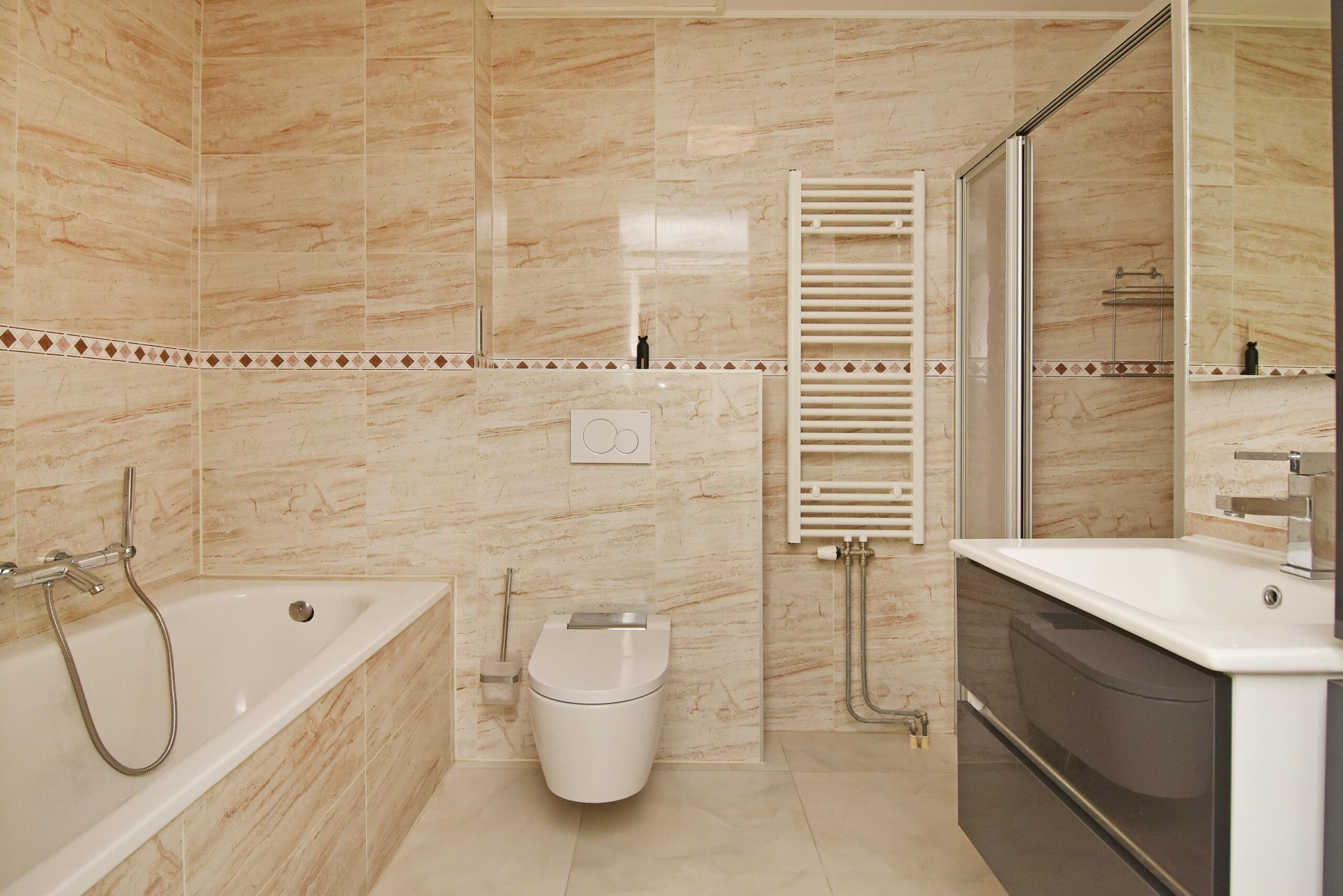 - Badkamervoorzieningen Ligbad, toilet, douche, wastafelmeubel, toilet, wastafel, inloopdouche
