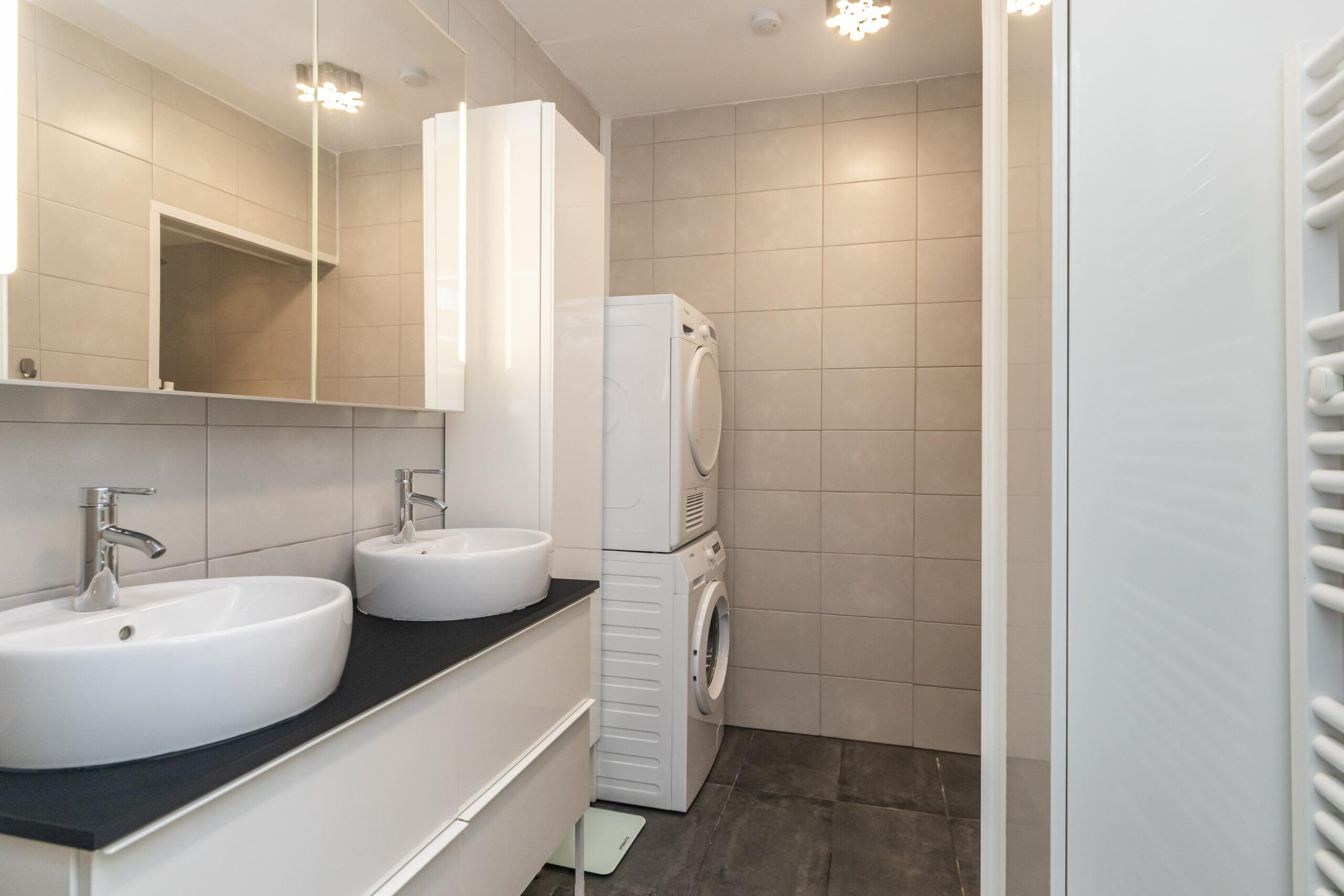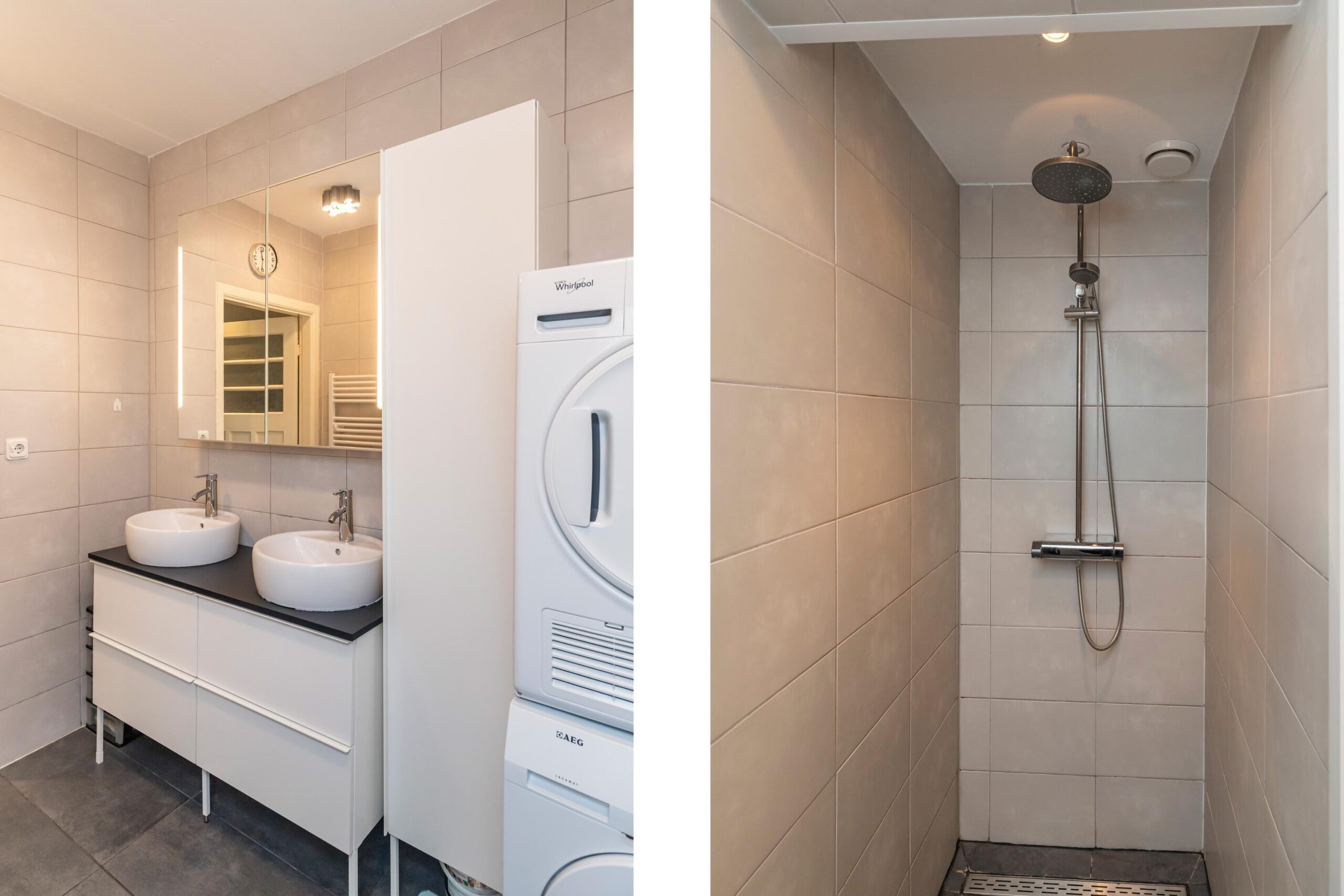 In het midden van de woning ligt de moderne badkamer, compleet uitgerust met een inloopdouche, dubbel wastafelmeubel en aansluiting voor de wasmachine. Daarnaast is er een apart toilet aanwezig.