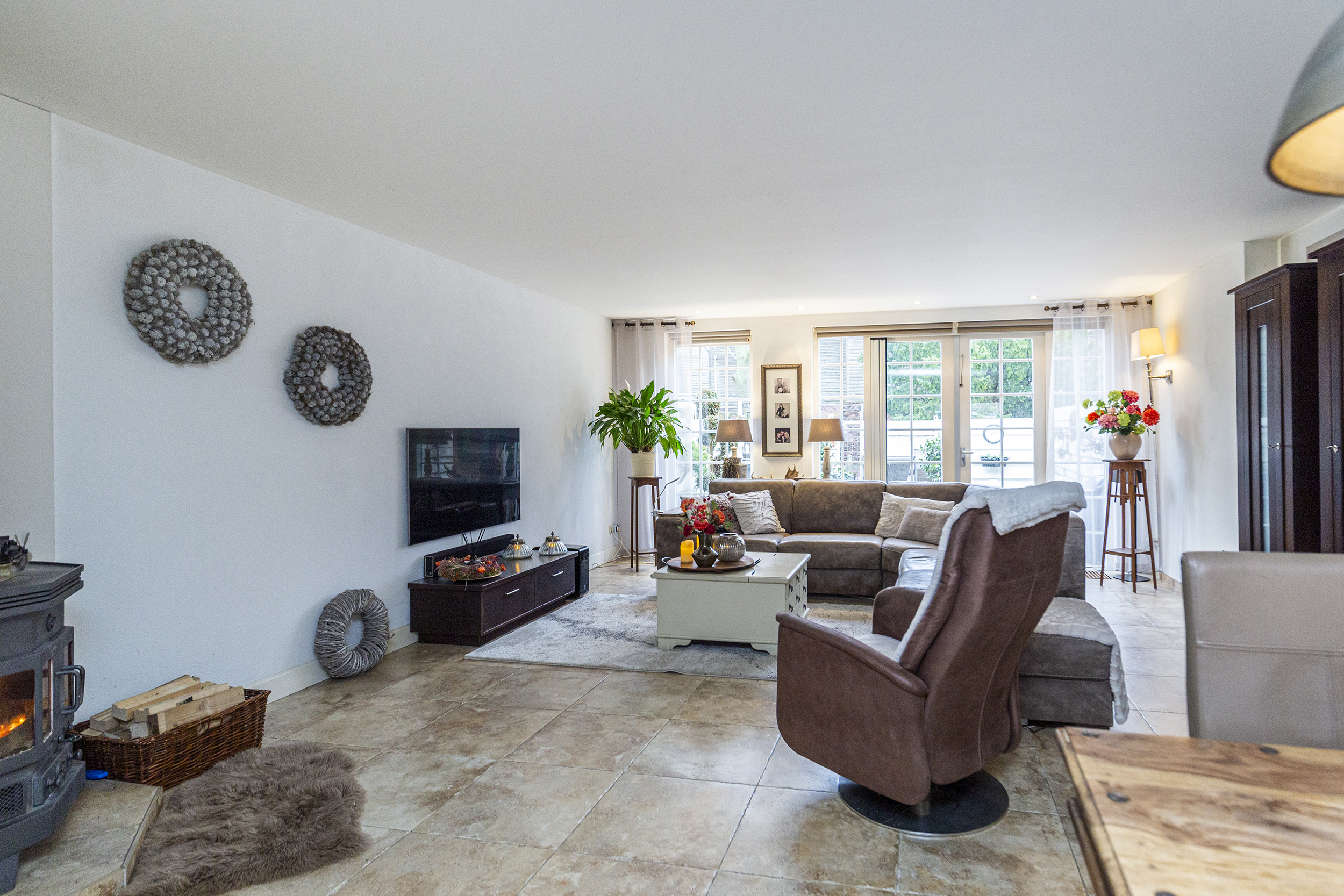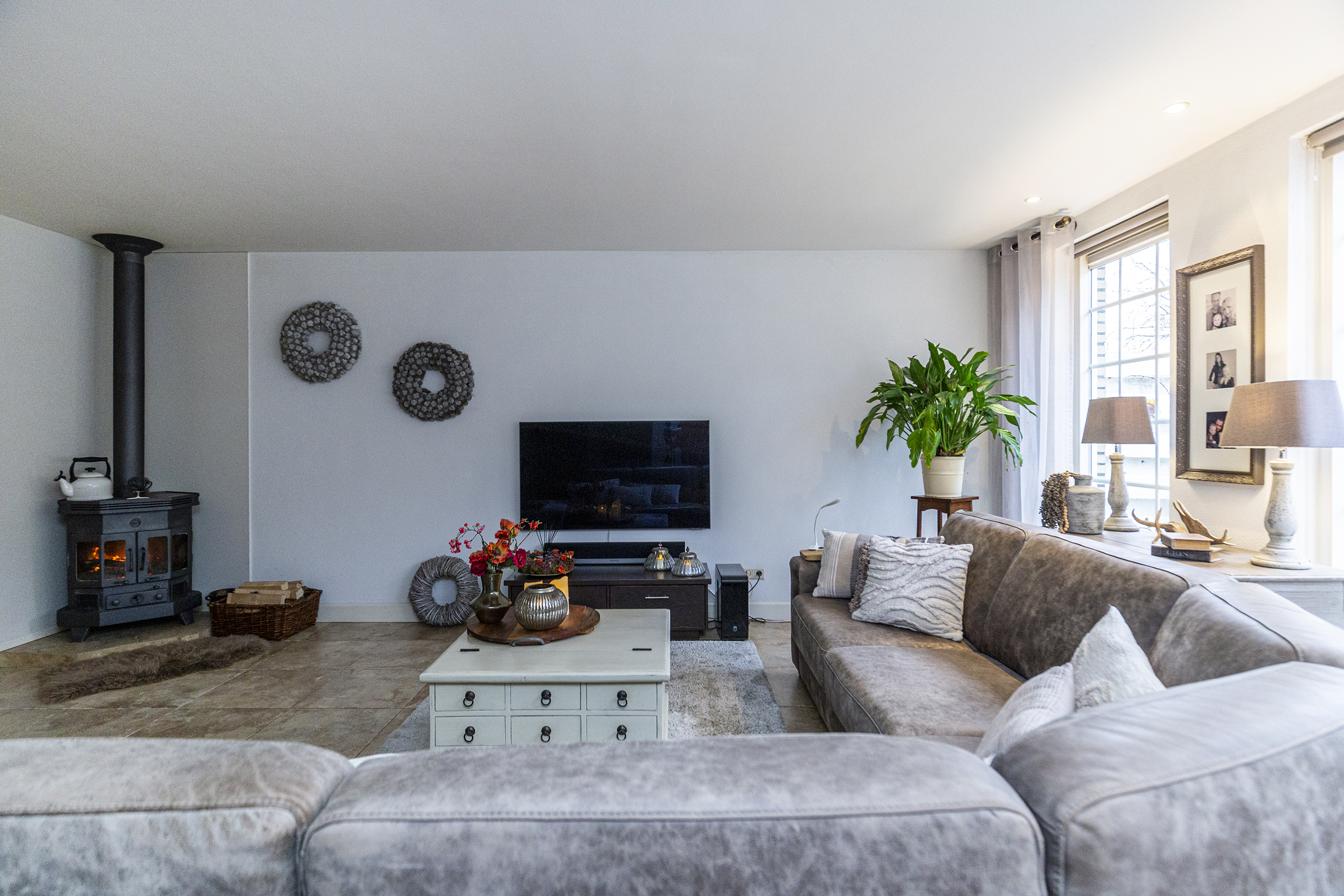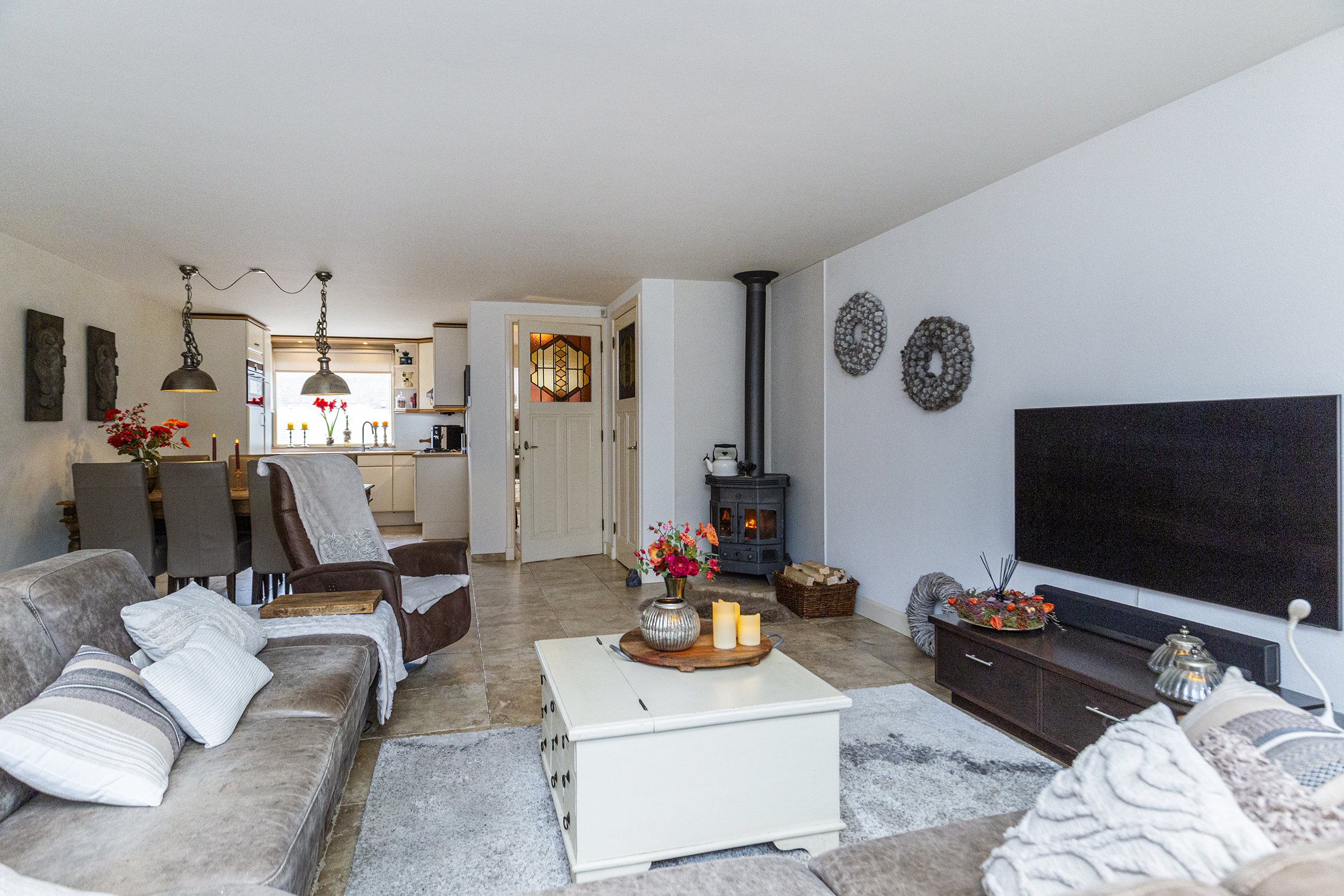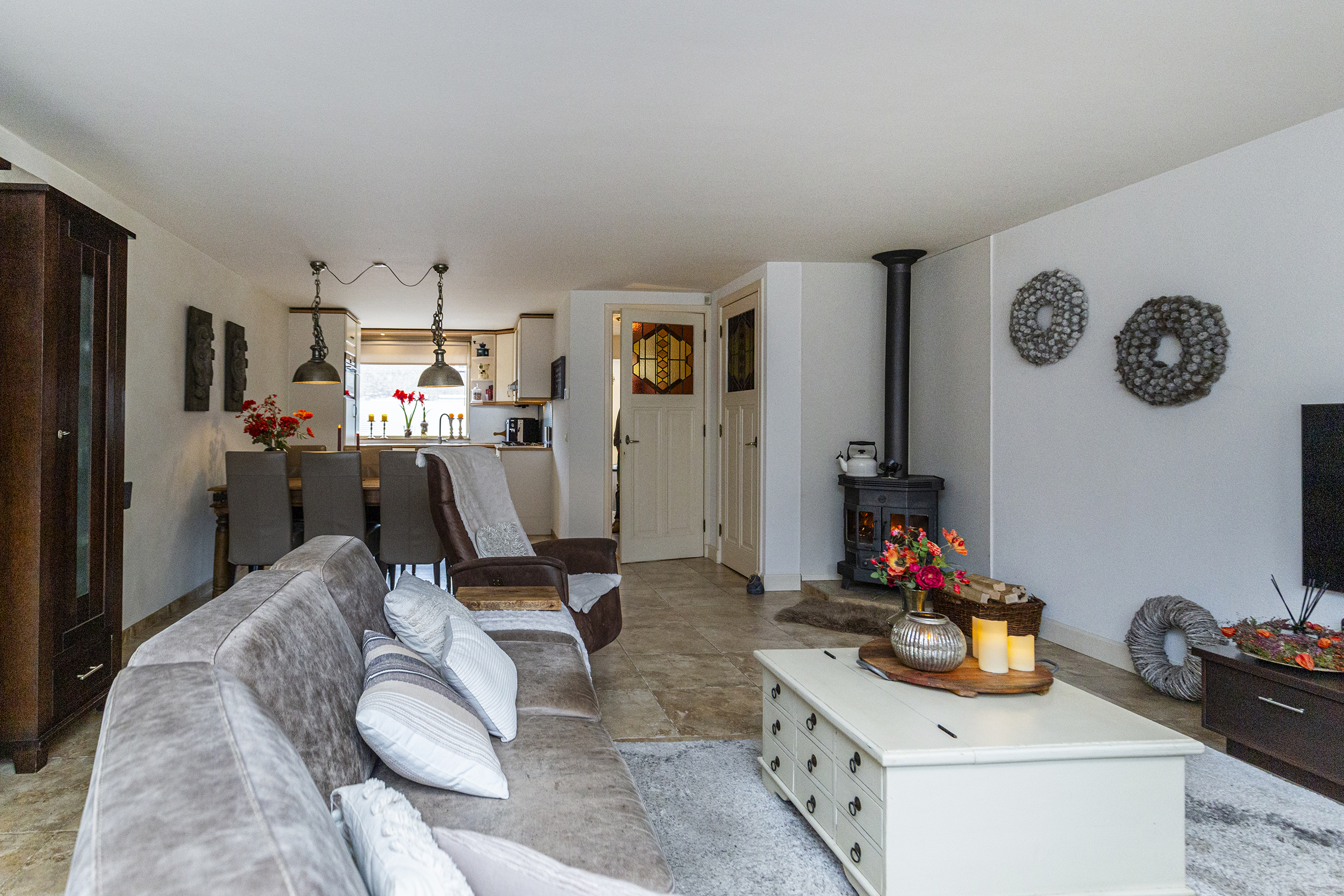 De begane grond van deze woning biedt een lichte en sfeervolle indeling. De ruime woonkamer heeft een charmante houthaard, die zorgt voor extra sfeer en warmte tijdens de koudere maanden.