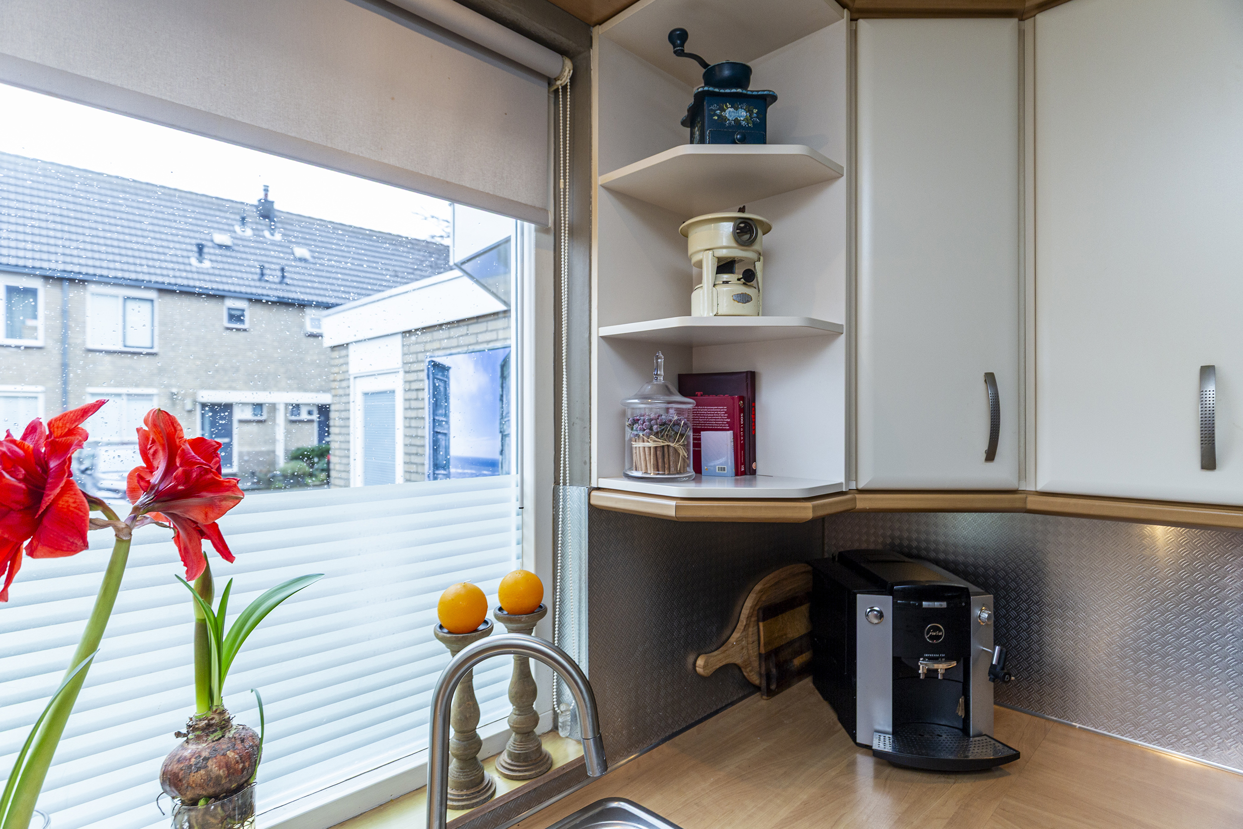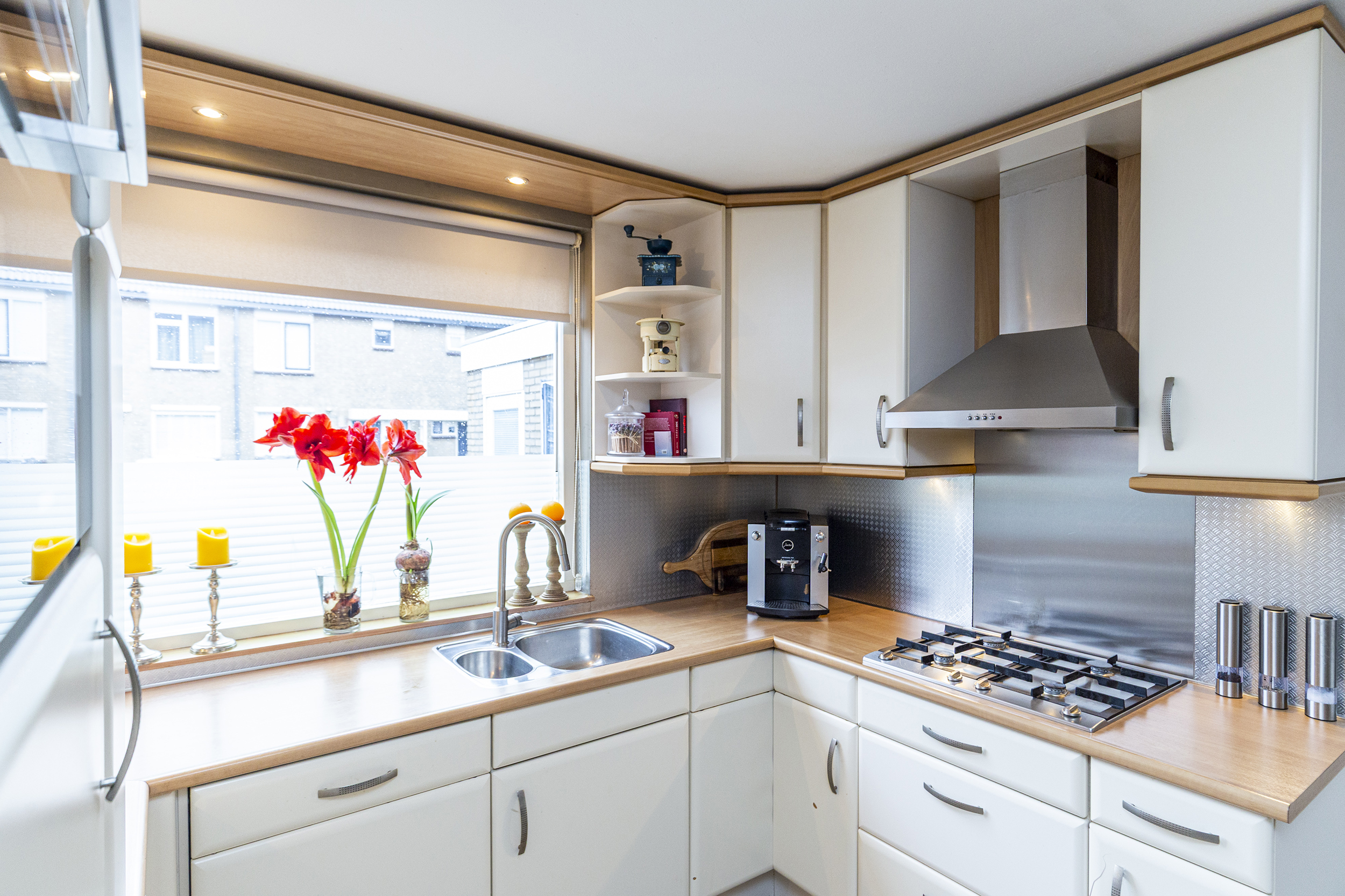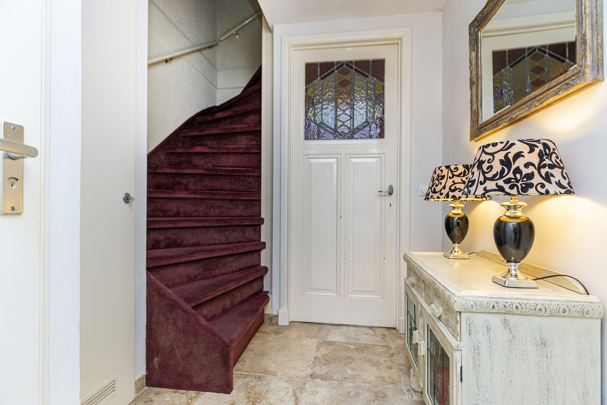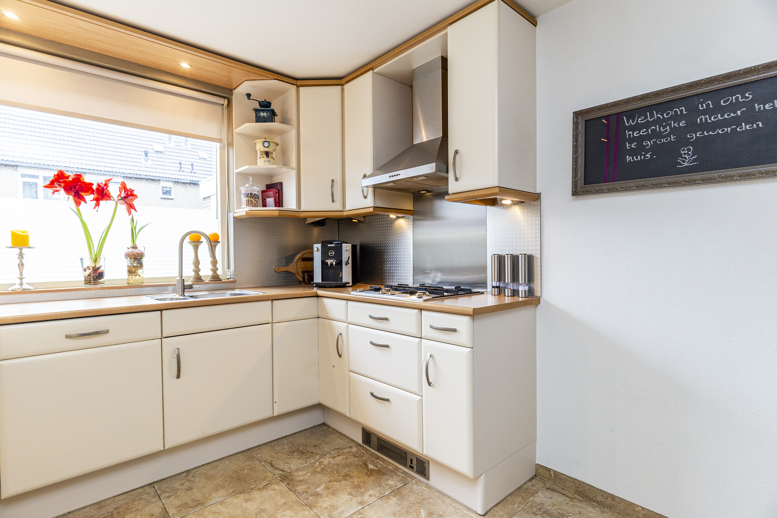 De begane grond van deze woning biedt een lichte en sfeervolle indeling. De ruime woonkamer heeft een charmante houthaard, die zorgt voor extra sfeer en warmte tijdens de koudere maanden.