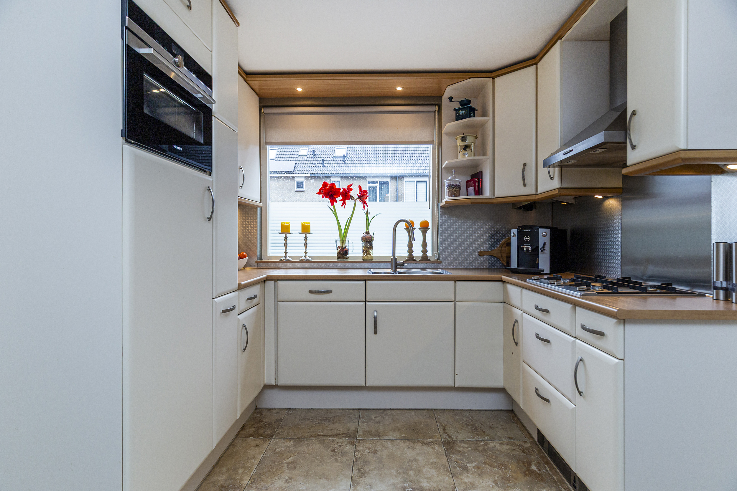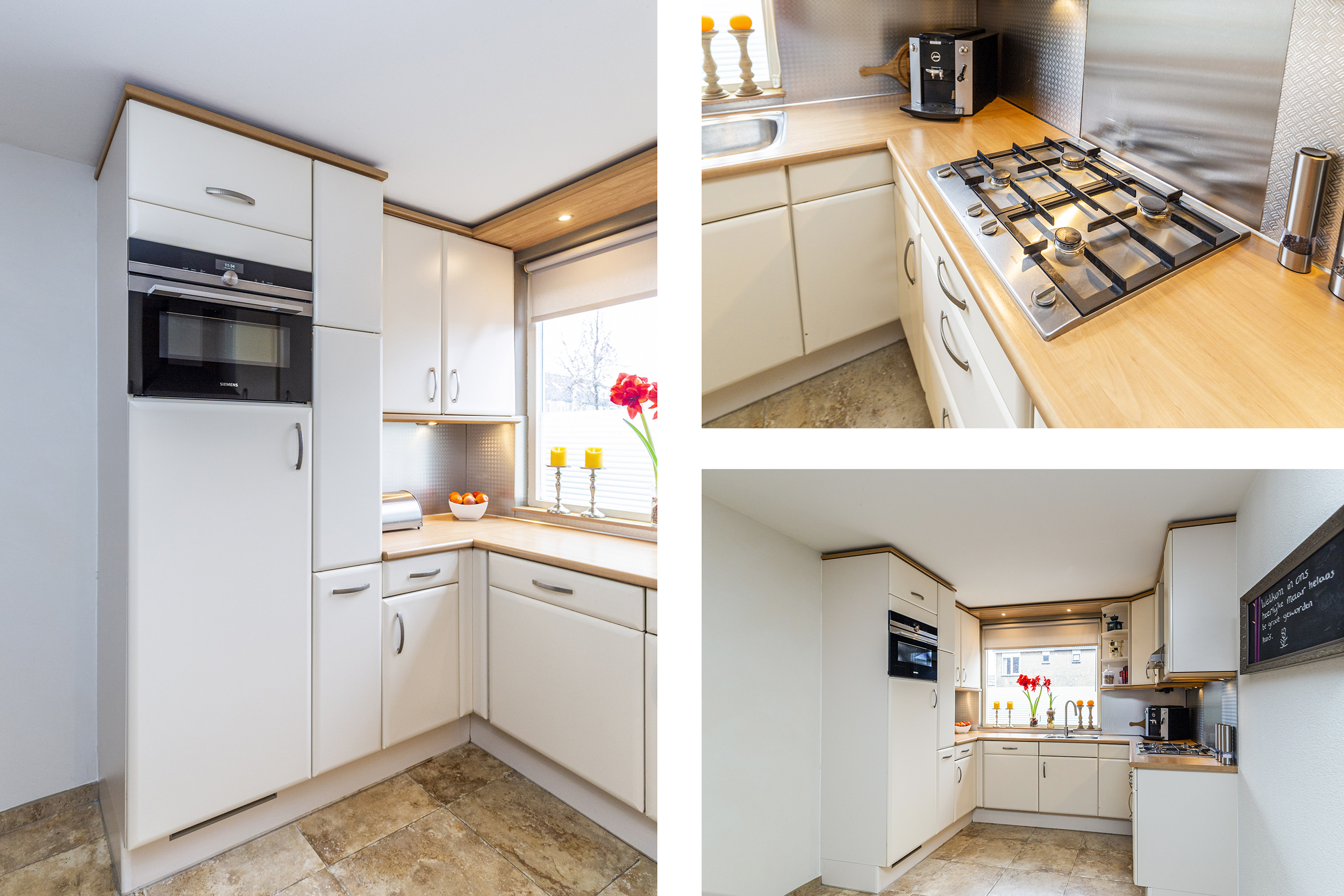 De open keuken beschikt over inbouwapparatuur van Siemens, waaronder een oven, vaatwasser en andere handige inbouwapparatuur. De open verbinding met de woonkamer maakt het een fijne ruimte om te koken en tegelijkertijd te genieten van het gezelschap van vrienden of familie.