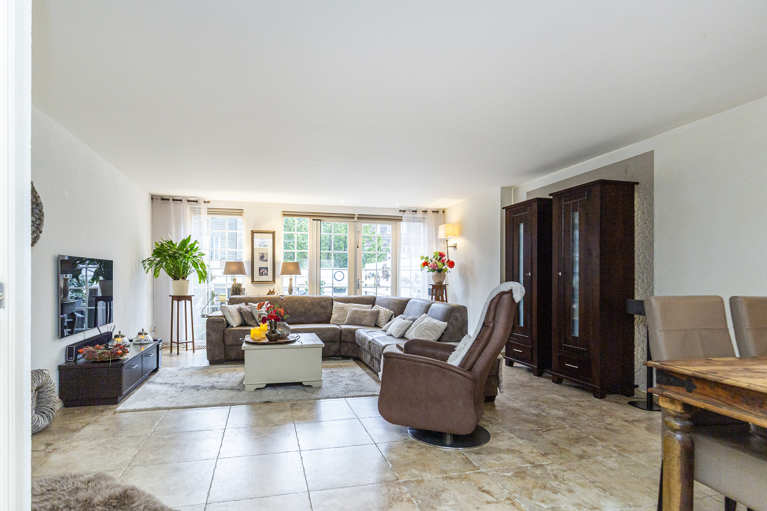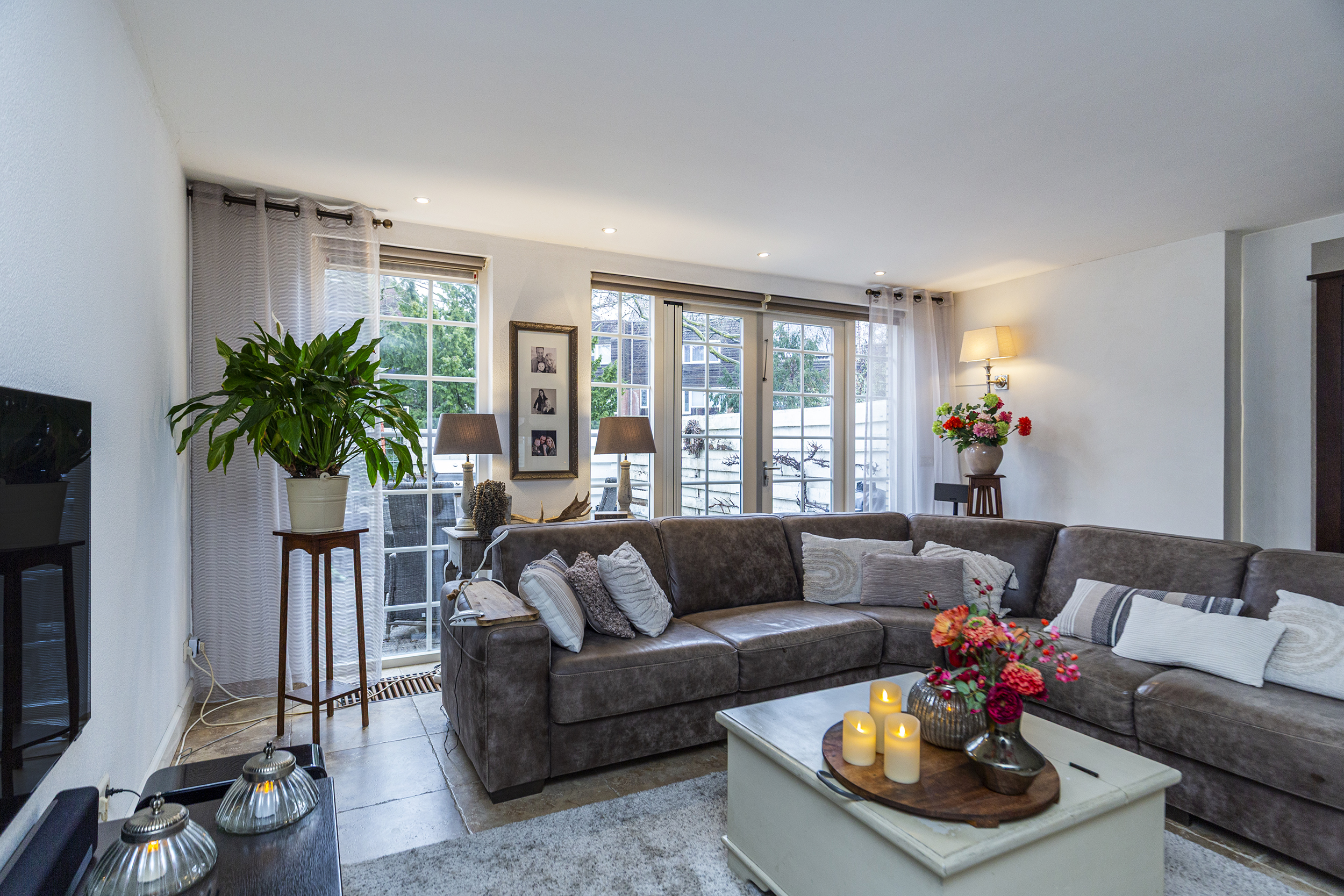 De woonkamer kijkt uit op de tuin en biedt middels openslaande deuren toegang tot de achtertuin, gelegen op het zuidwesten. De tuin grenst direct aan het water, wat zorgt voor een rustig gevoel.