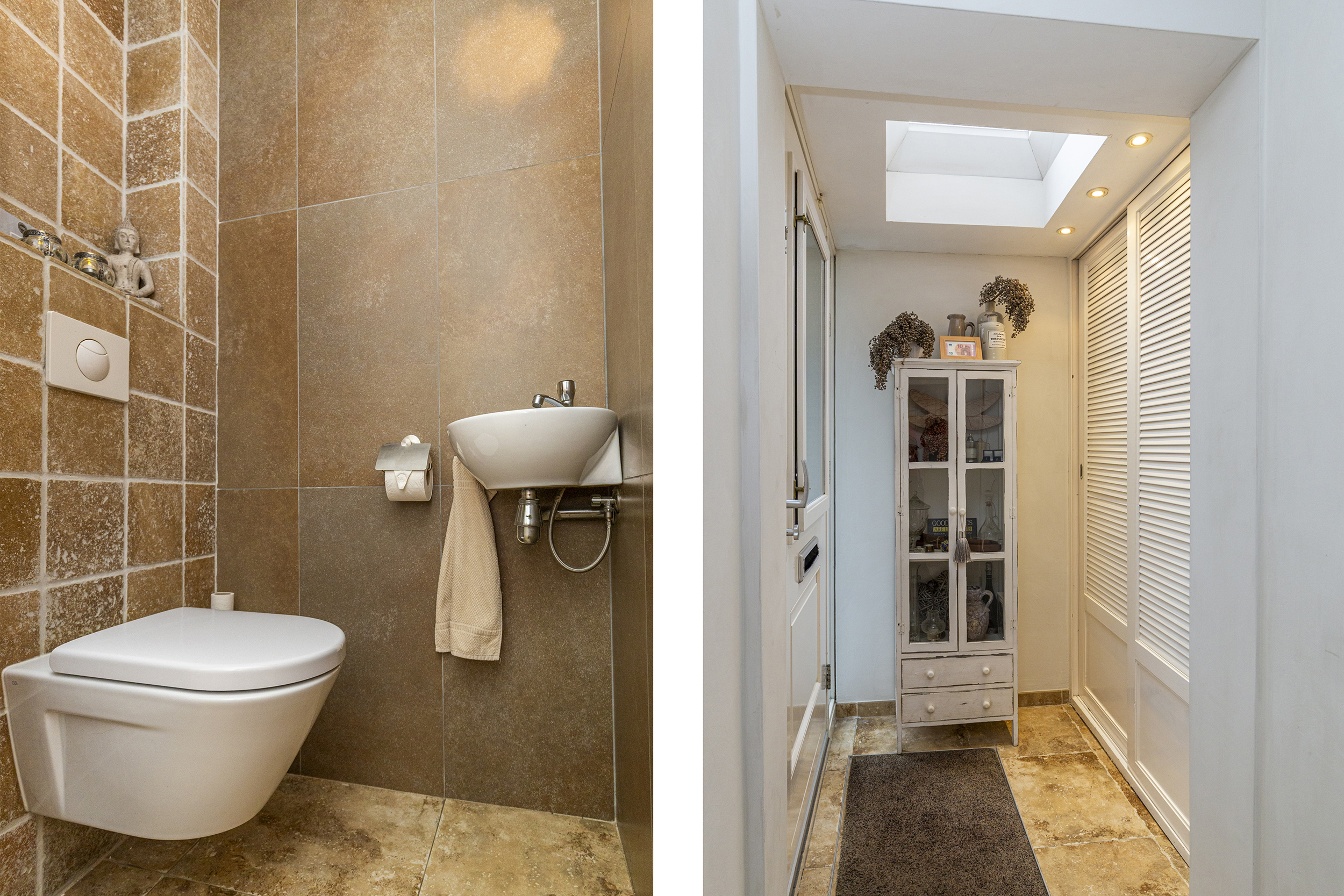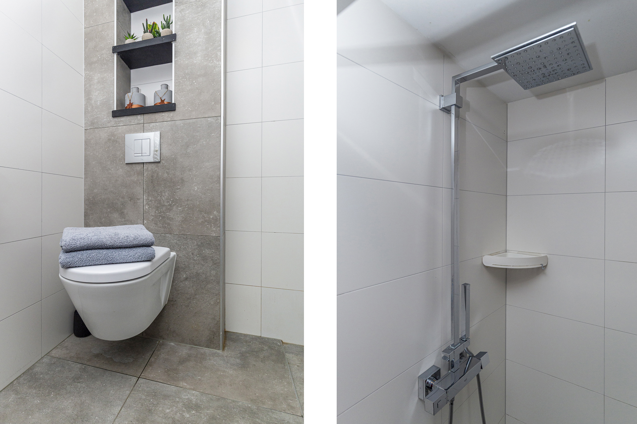 De badkamer, vernieuwd in 2017, is voorzien van twee wastafelmeubels, een inloopdouche en een toilet, en biedt alle ruimte voor ontspanning.