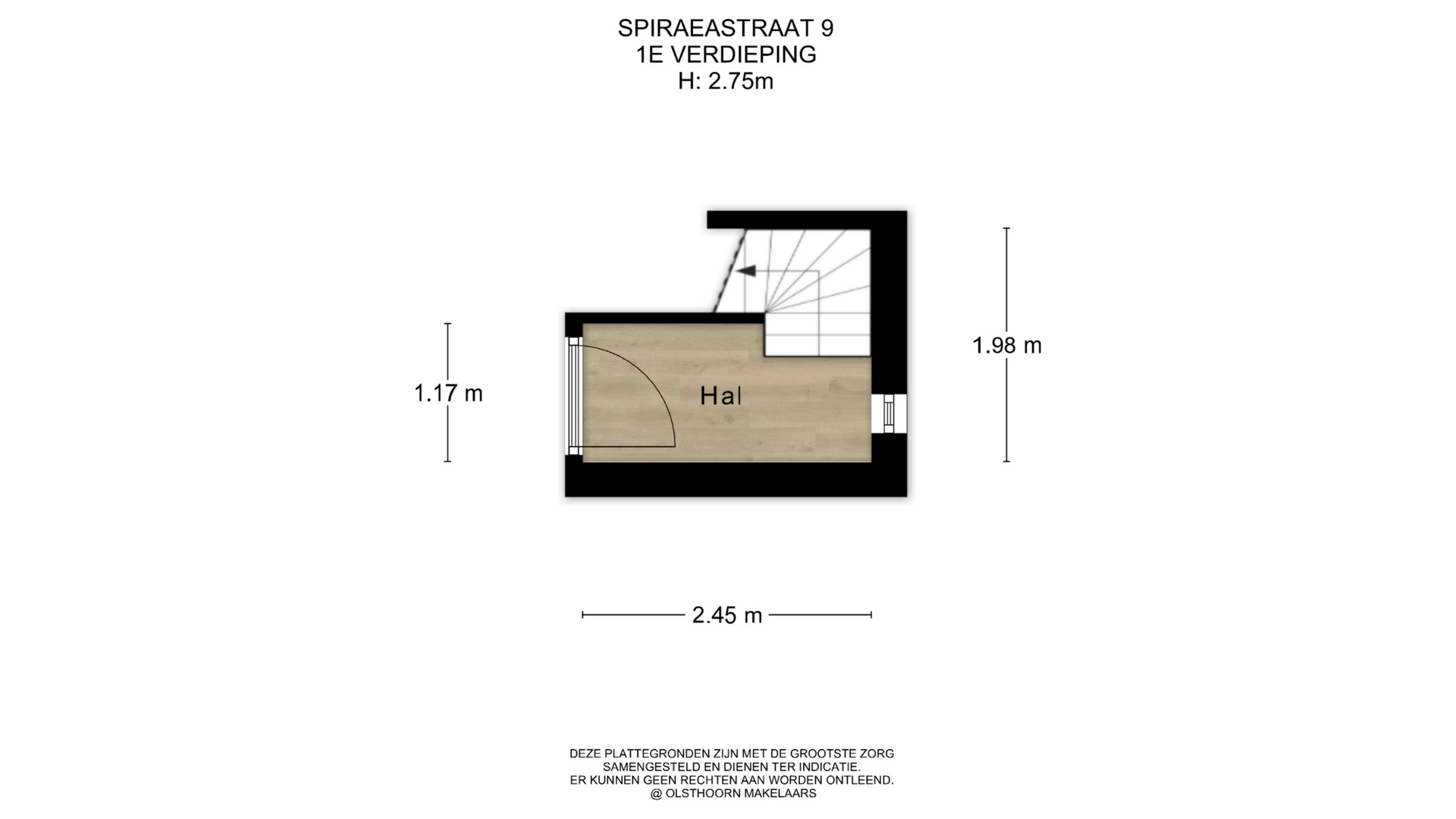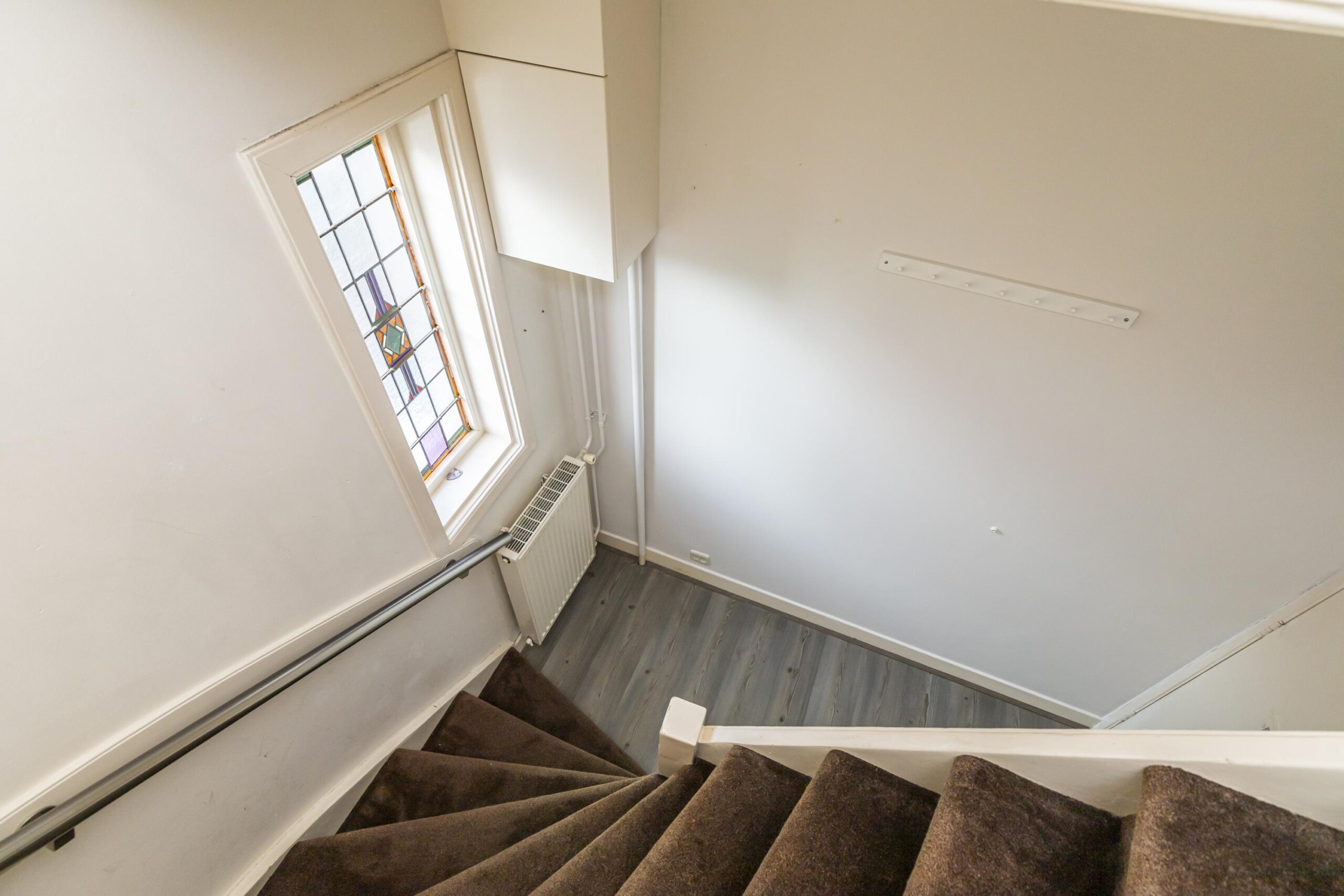 Via het open portiek bereik je de entree van het appartement op de eerste verdieping. Bij binnenkomst kom je in de hal, waar zich de binnentrap naar de tweede verdieping bevindt.