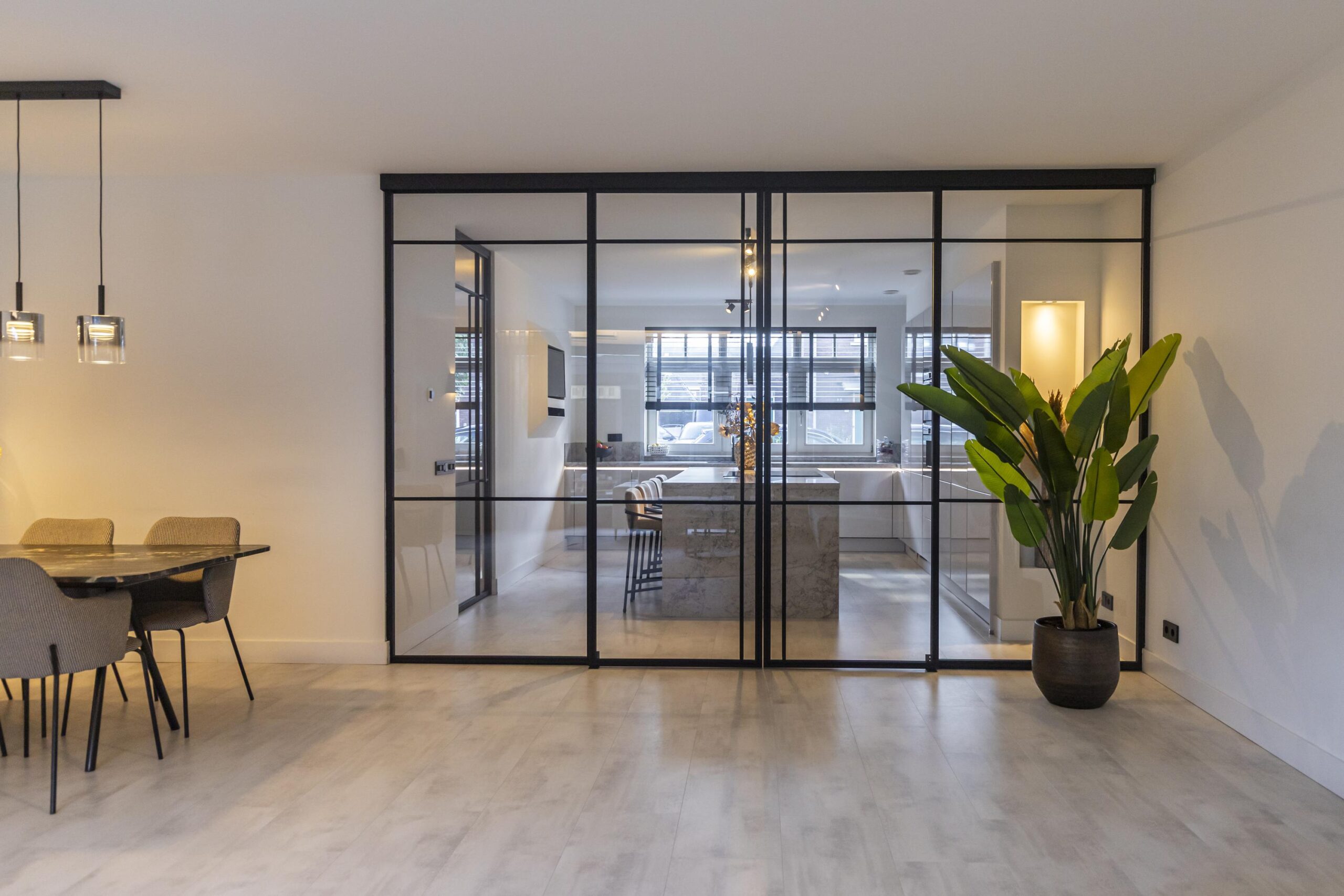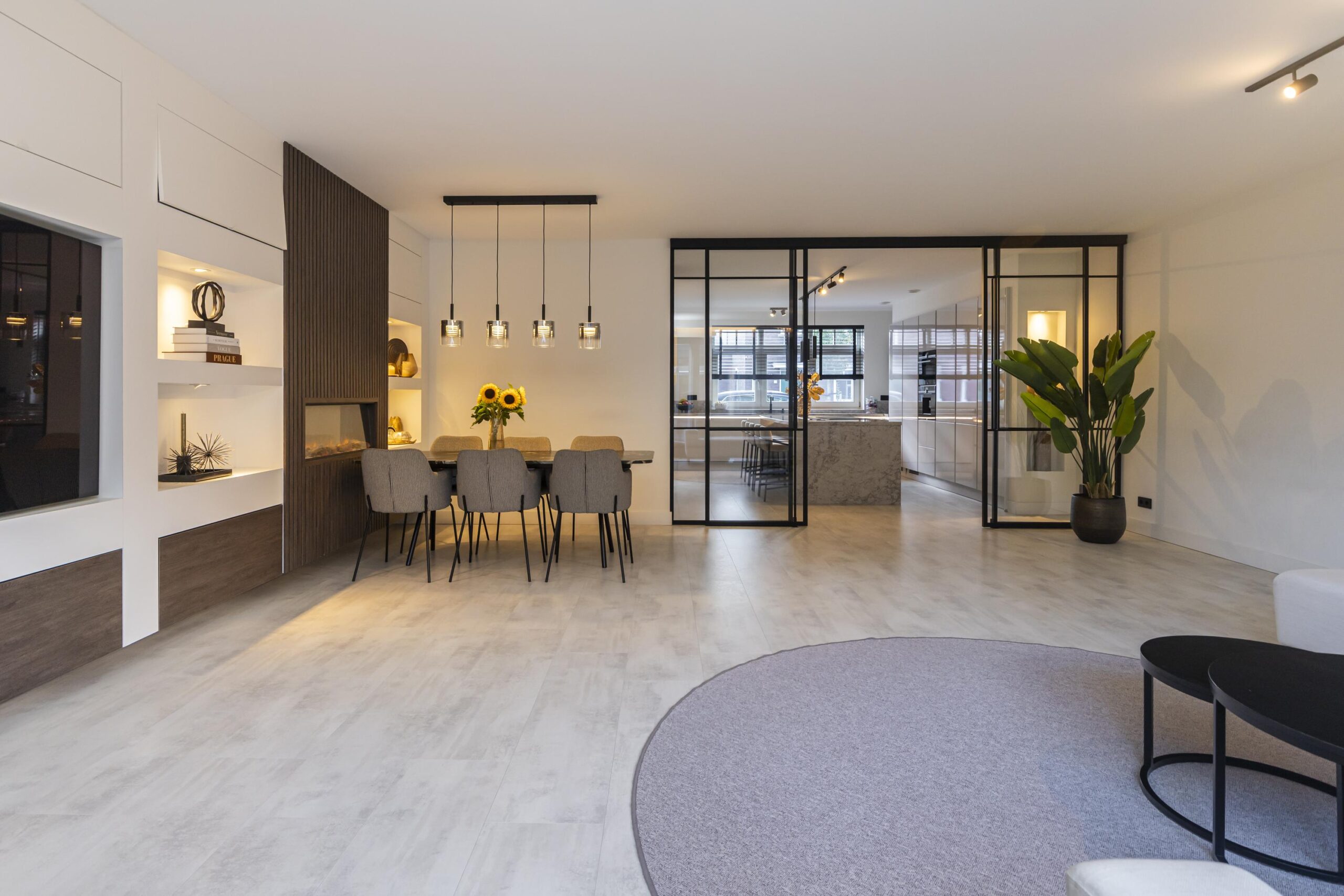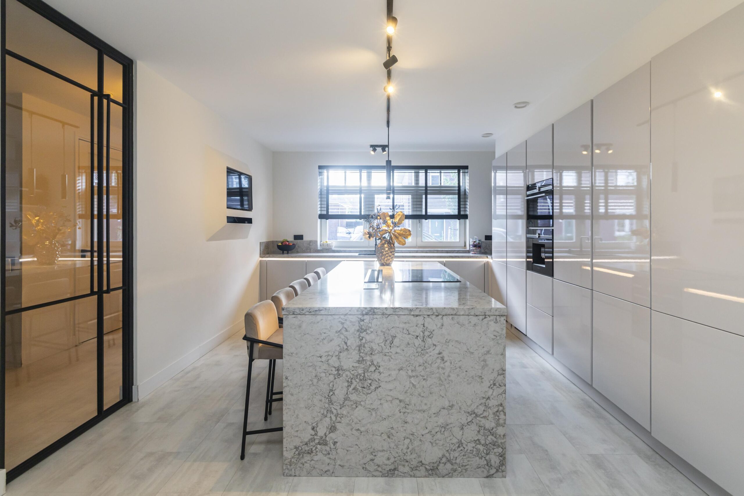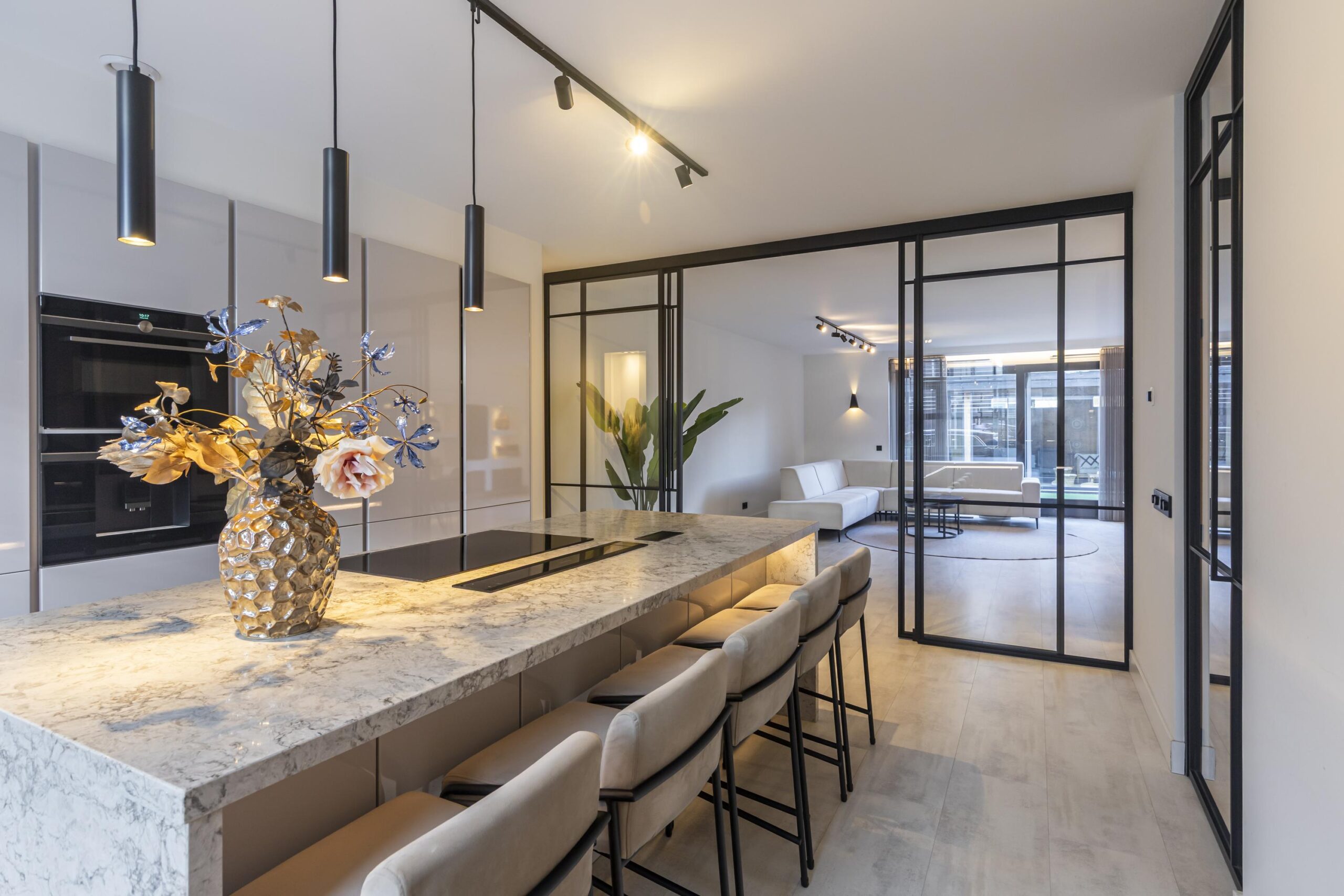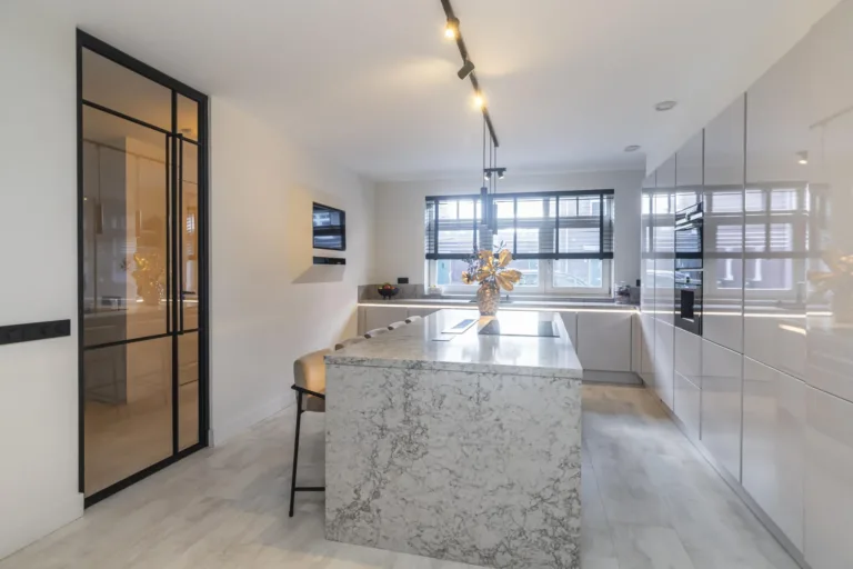Wanneer je de woning binnenkomt, stap je in een royale hal waar ook het moderne toilet met wastafel te vinden is. Vanuit hier loop je door naar de ruime, open keuken met een centraal kookeiland. De keuken is voorzien van diverse inbouwapparatuur en biedt volop opbergruimte, waardoor koken hier een waar plezier wordt. Via grote taatsdeuren is de keuken verbonden met de lichte en royale woonkamer, die dankzij de luxe afwerking een stijlvolle uitstraling heeft. De schuifdeuren geven toegang tot de fraai aangelegde tuin met veranda, waar je in alle rust kunt genieten van het buitenleven.