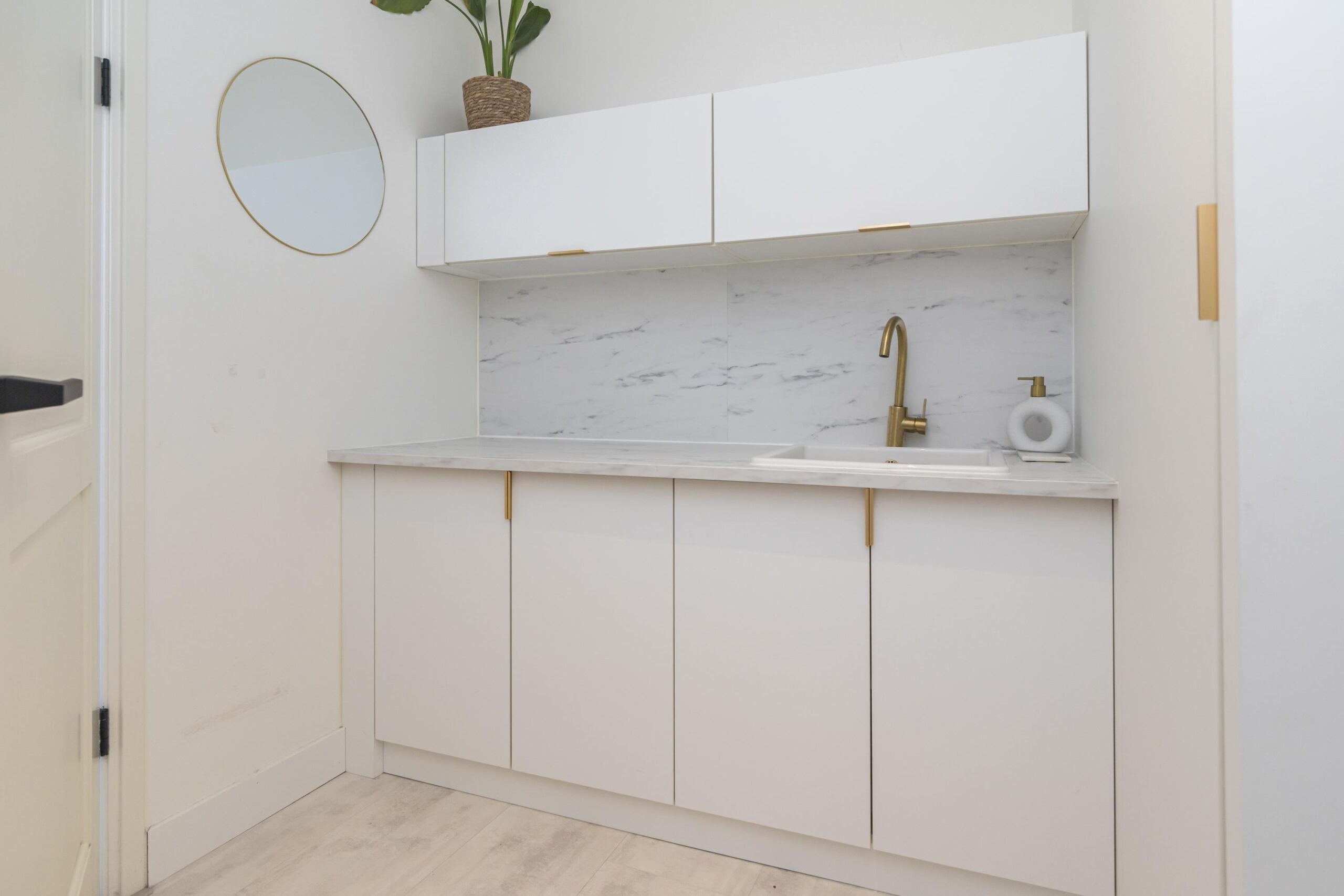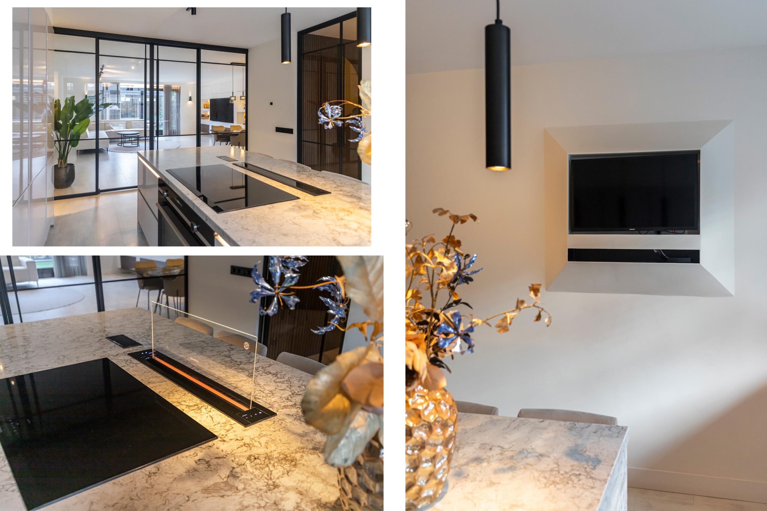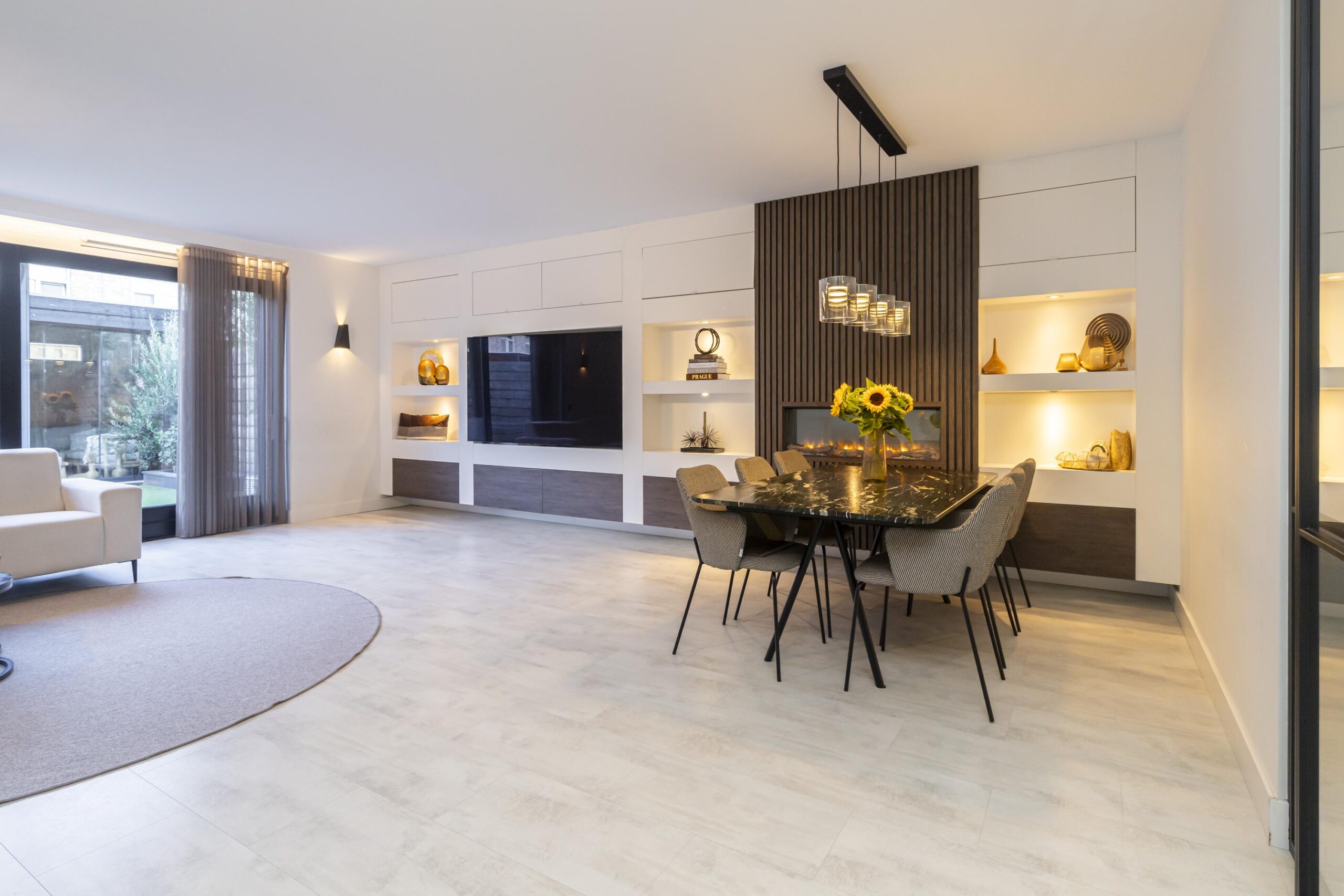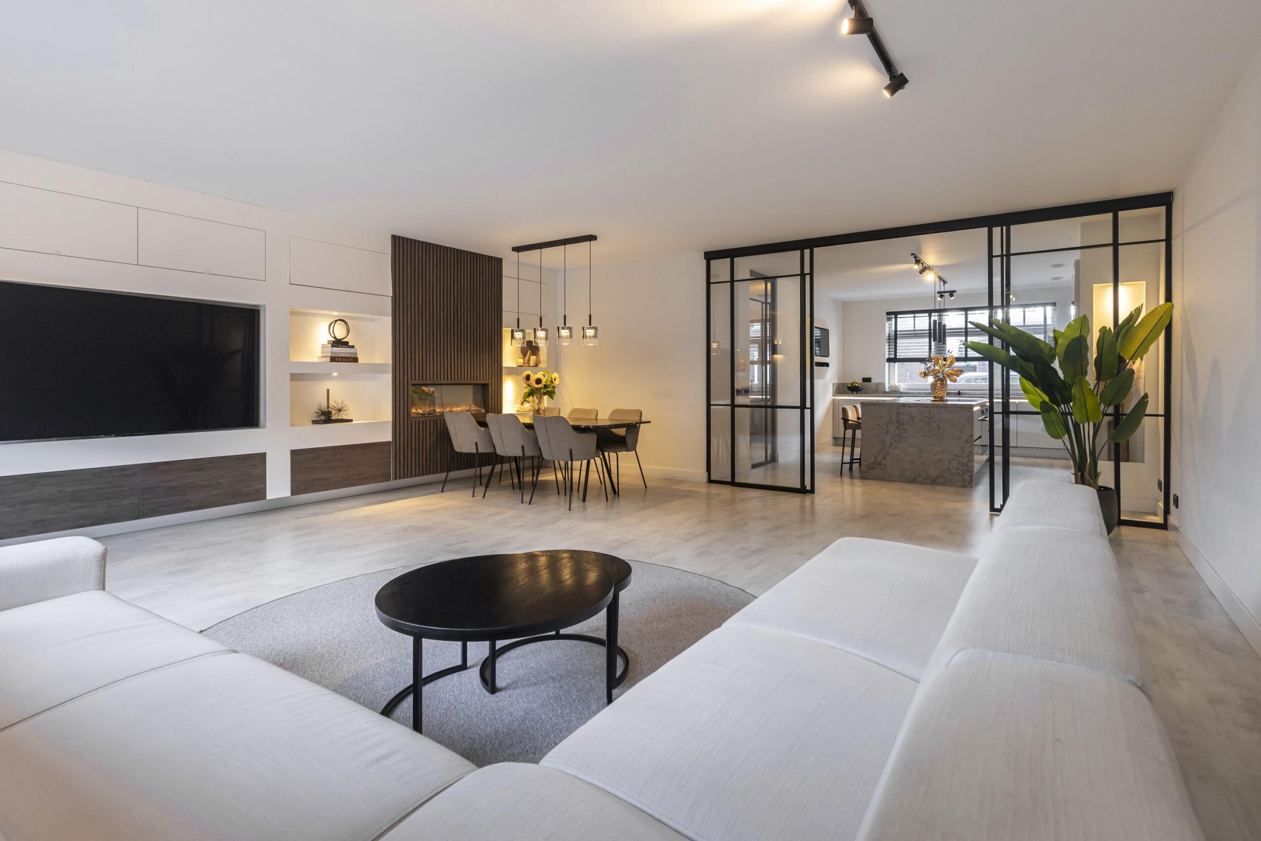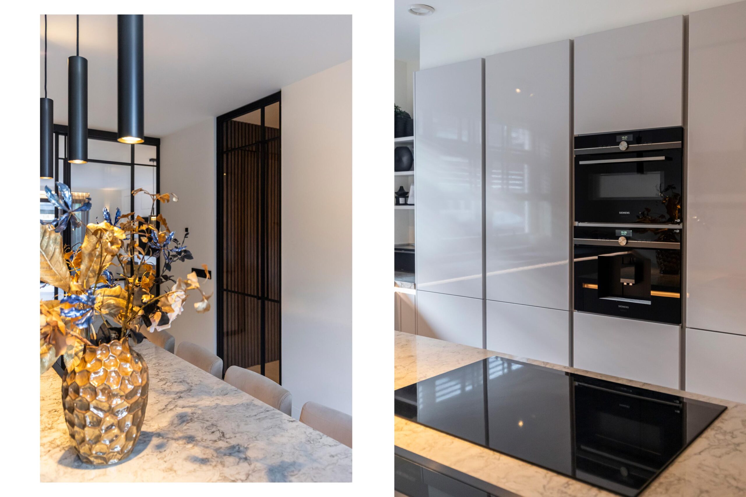 Wanneer je de woning binnenkomt, stap je in een royale hal waar ook het moderne toilet met wastafel te vinden is. Vanuit hier loop je door naar de ruime, open keuken met een centraal kookeiland. De keuken is voorzien van diverse inbouwapparatuur en biedt volop opbergruimte, waardoor koken hier een waar plezier wordt. Via grote taatsdeuren is de keuken verbonden met de lichte en royale woonkamer, die dankzij de luxe afwerking een stijlvolle uitstraling heeft. De schuifdeuren geven toegang tot de fraai aangelegde tuin met veranda, waar je in alle rust kunt genieten van het buitenleven.
