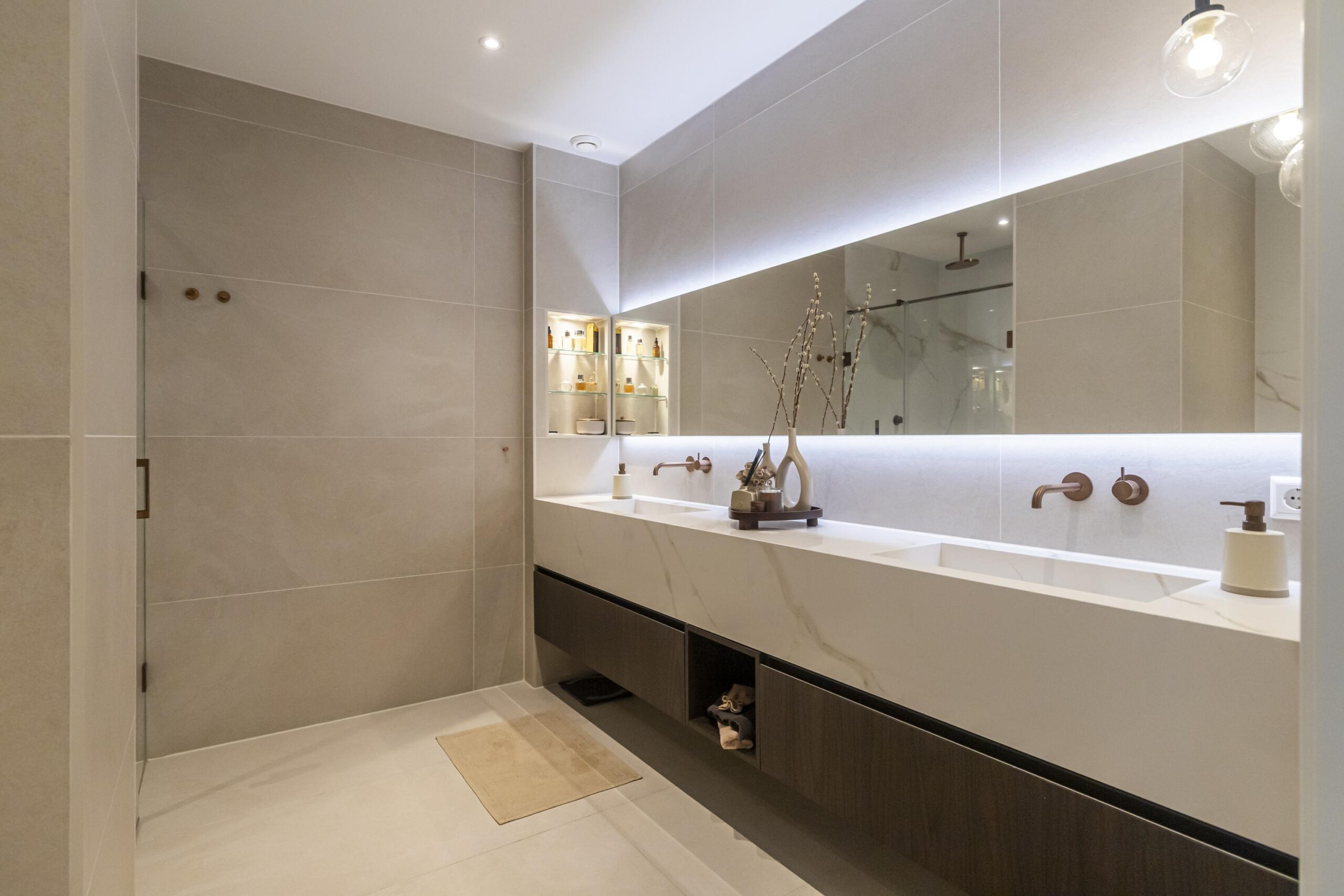 - Badkamervoorzieningen Toilet, douche, dubbele wastafel, vloerverwarming