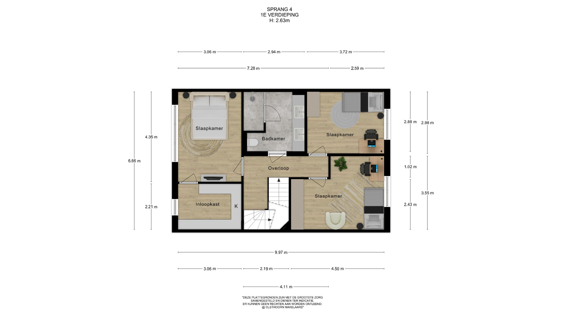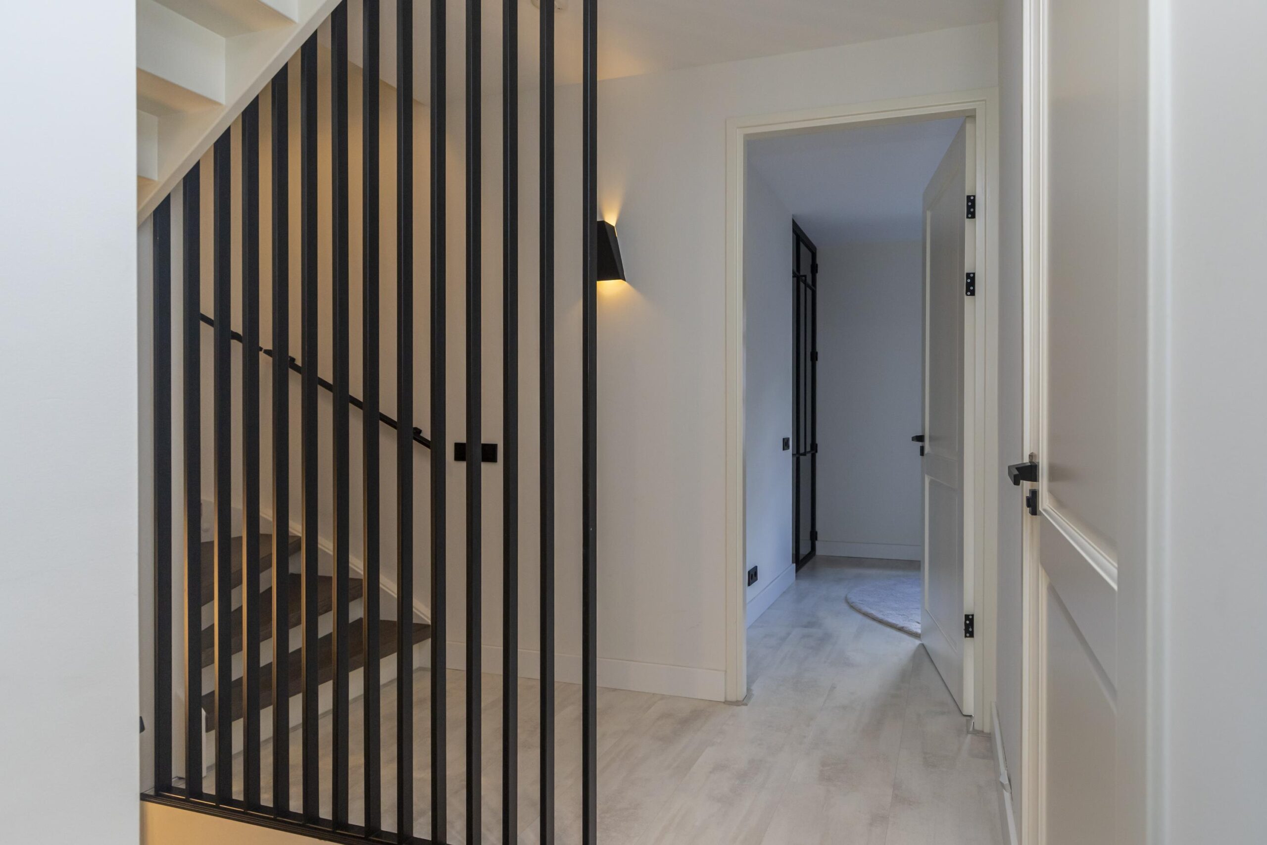 Neem je de trap naar boven, dan kom je op de eerste verdieping. Aan de voorzijde vind je een ruime slaapkamer met directe toegang tot een praktische inloopkast. Aan de achterzijde bevinden zich nog twee ruime slaapkamers, ideaal voor kinderen, werk- of logeerkamers. Vanuit de overloop bereik je de heerlijk ruime badkamer. Deze is uitgerust met een dubbel wastafelmeubel, een royale inloopdouche en een toilet, waardoor je hier van alle gemakken bent voorzien.