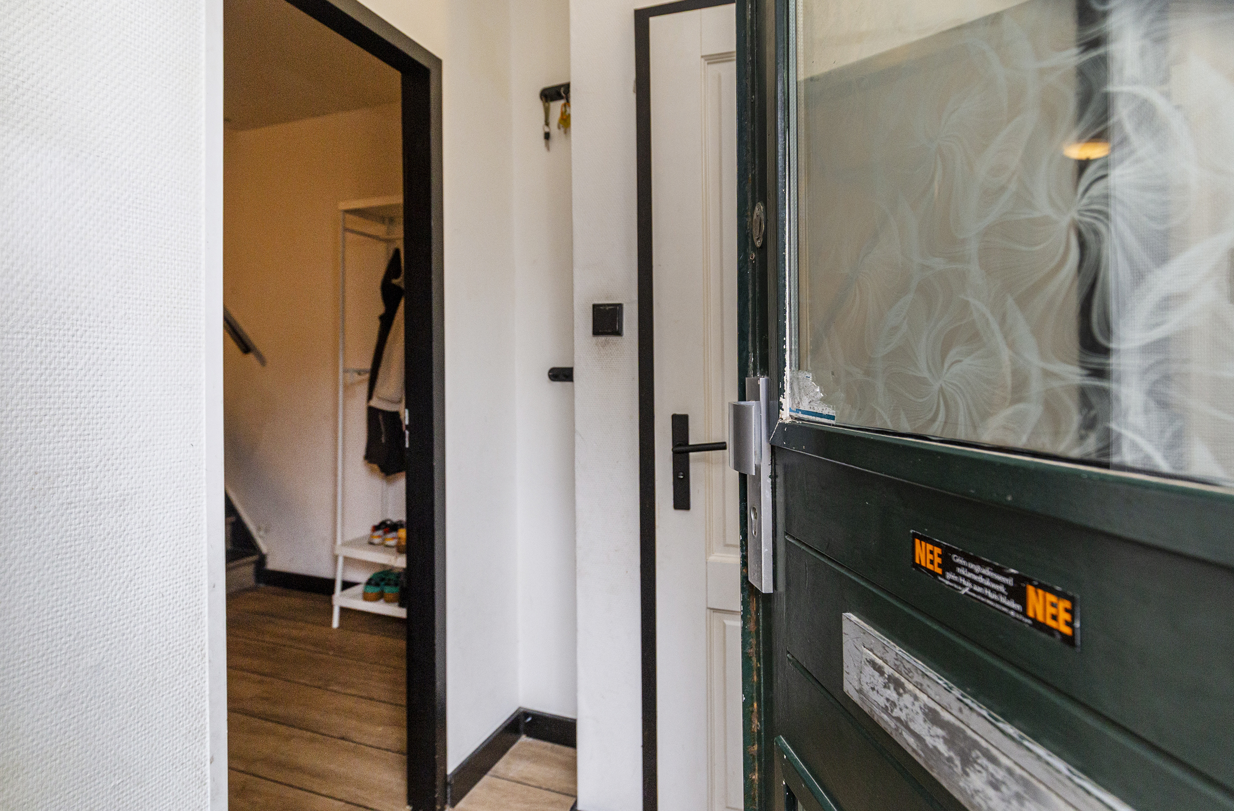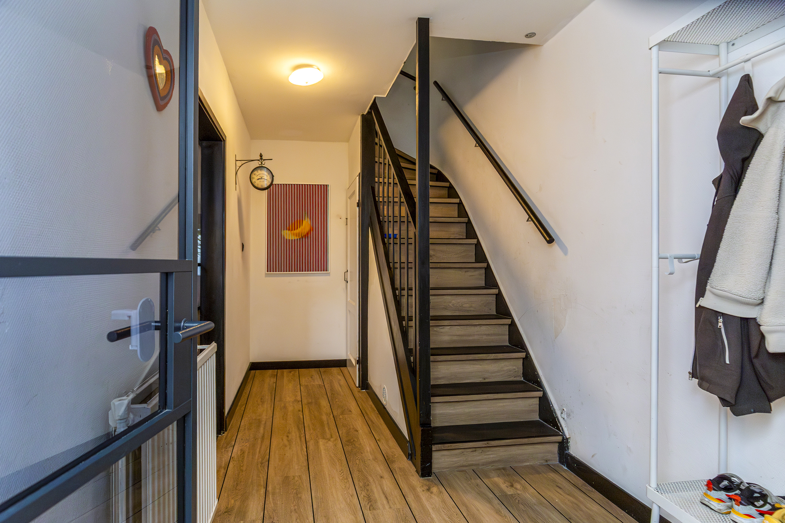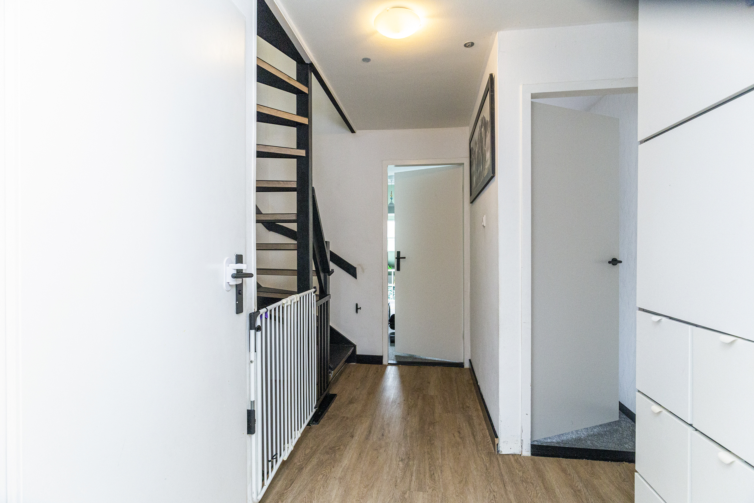 Via de voortuin bereikt u de entree van de woning, evenals de garage. Bij binnenkomst komt u in de hal met toegang tot een separaat toilet en de garage. De hal loopt door naar een centrale gang waar zich de meterkast, een praktische trapkast en de trap naar de eerste verdieping bevinden.