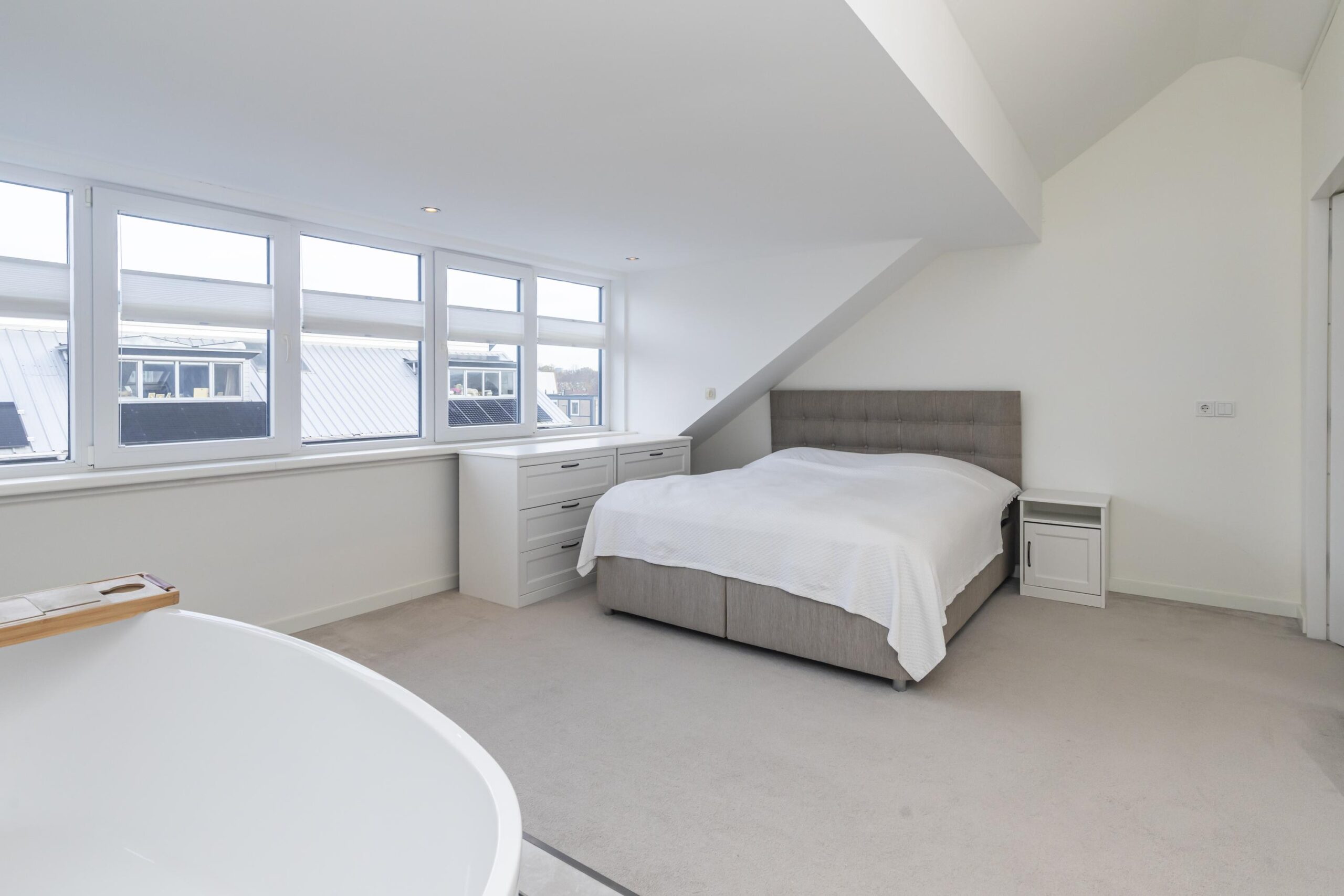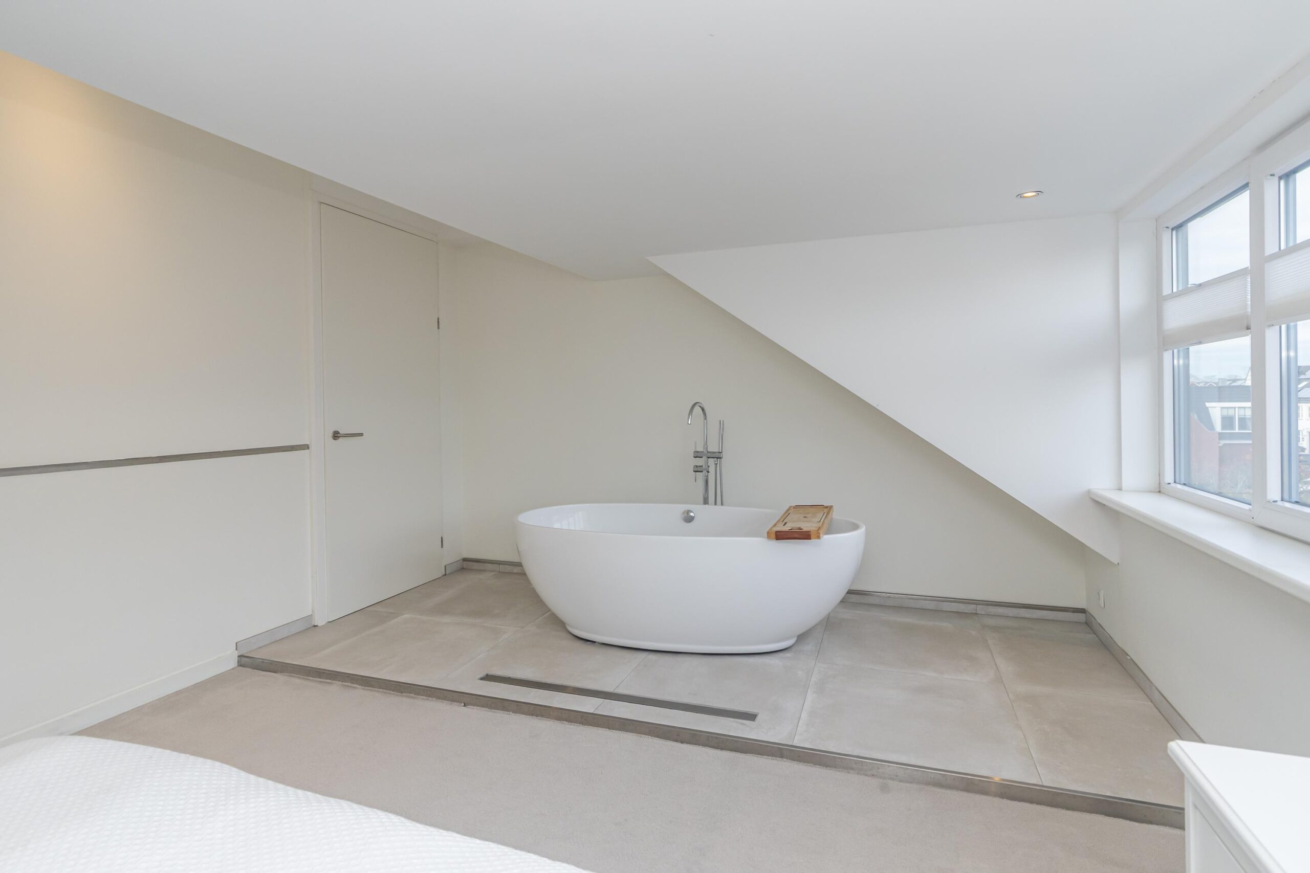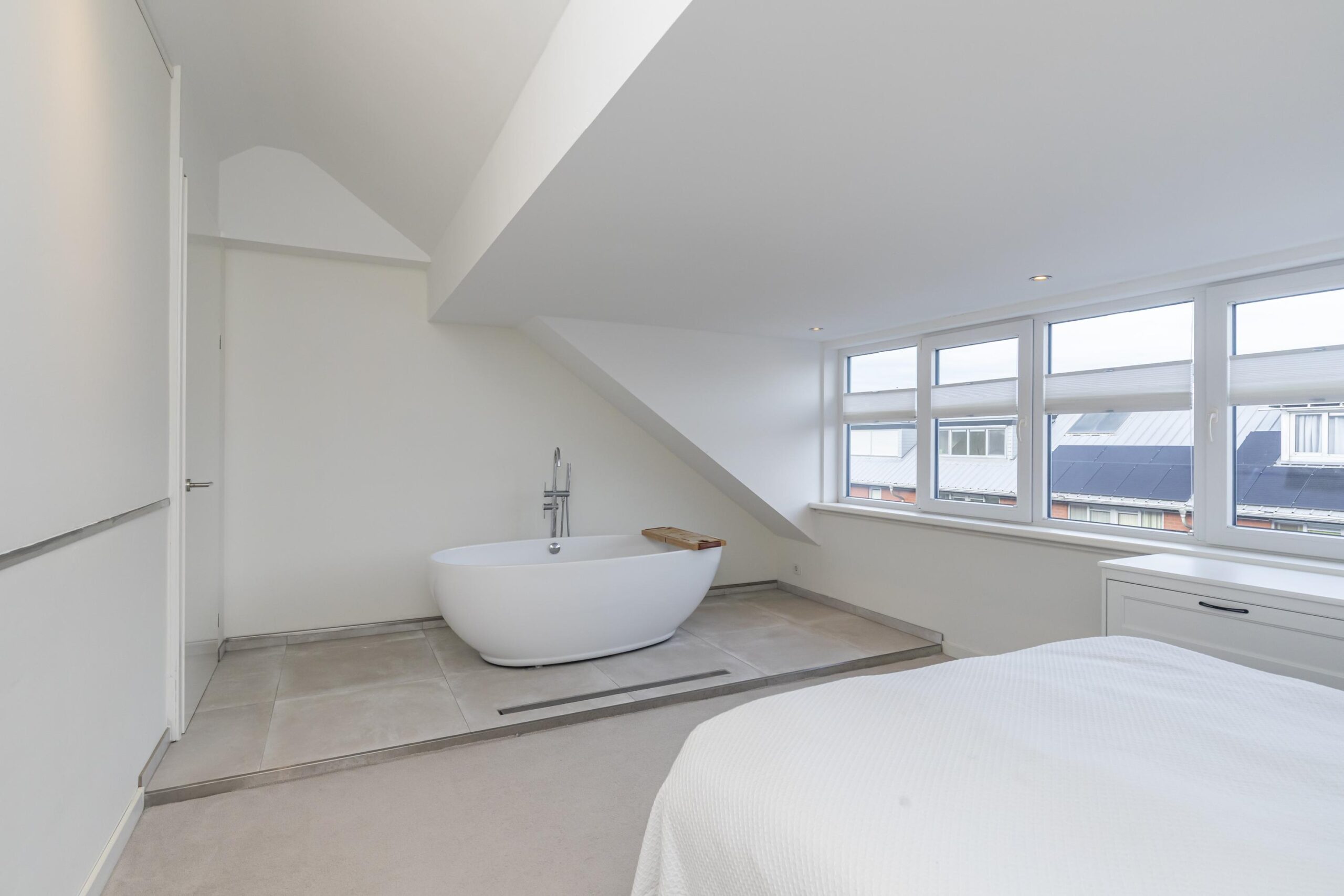 Een vaste trap brengt je naar de tweede verdieping, waar je wordt verrast door de ruimte en de mogelijkheden. Hier bevindt zich een royale slaapkamer met ligbad – ideaal als ouderslaapkamer of luxe logeerkamer – en een tweede kamer die zich uitstekend leent als werkruimte of hobbykamer.