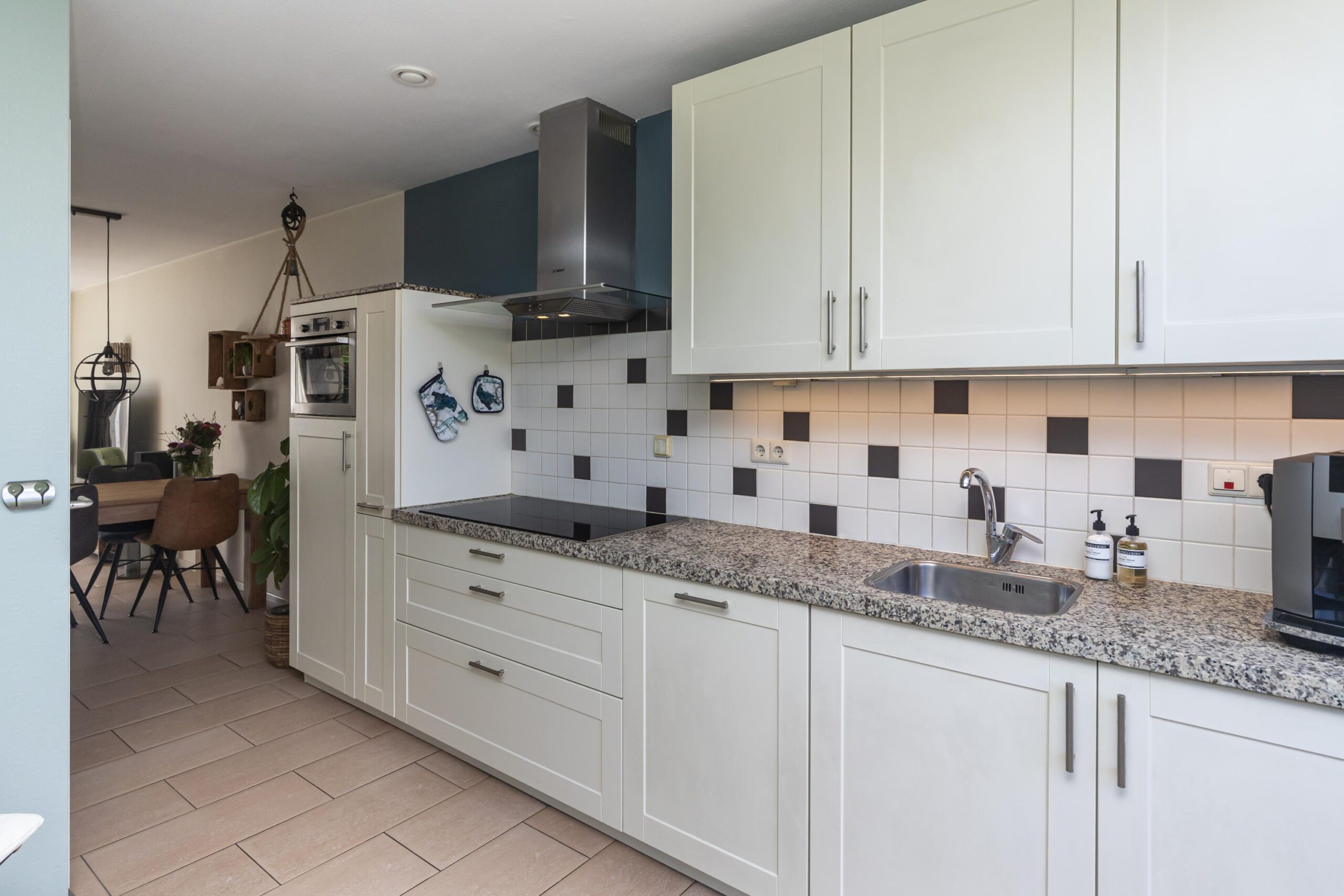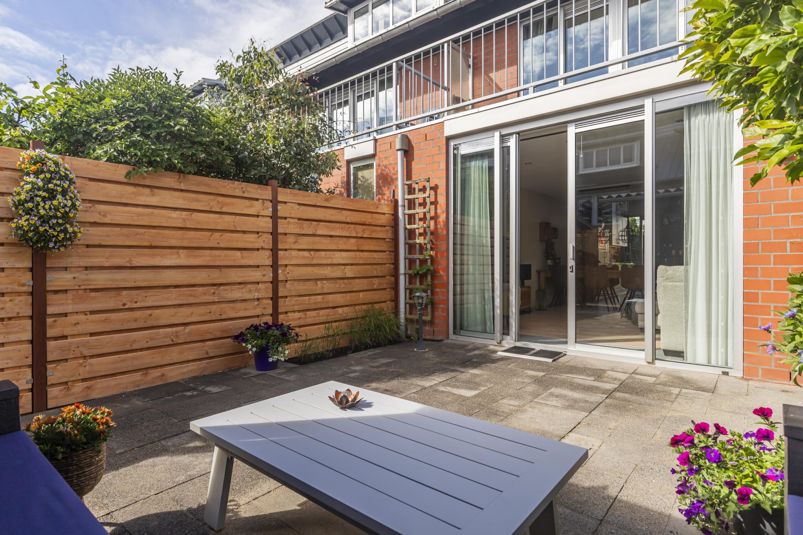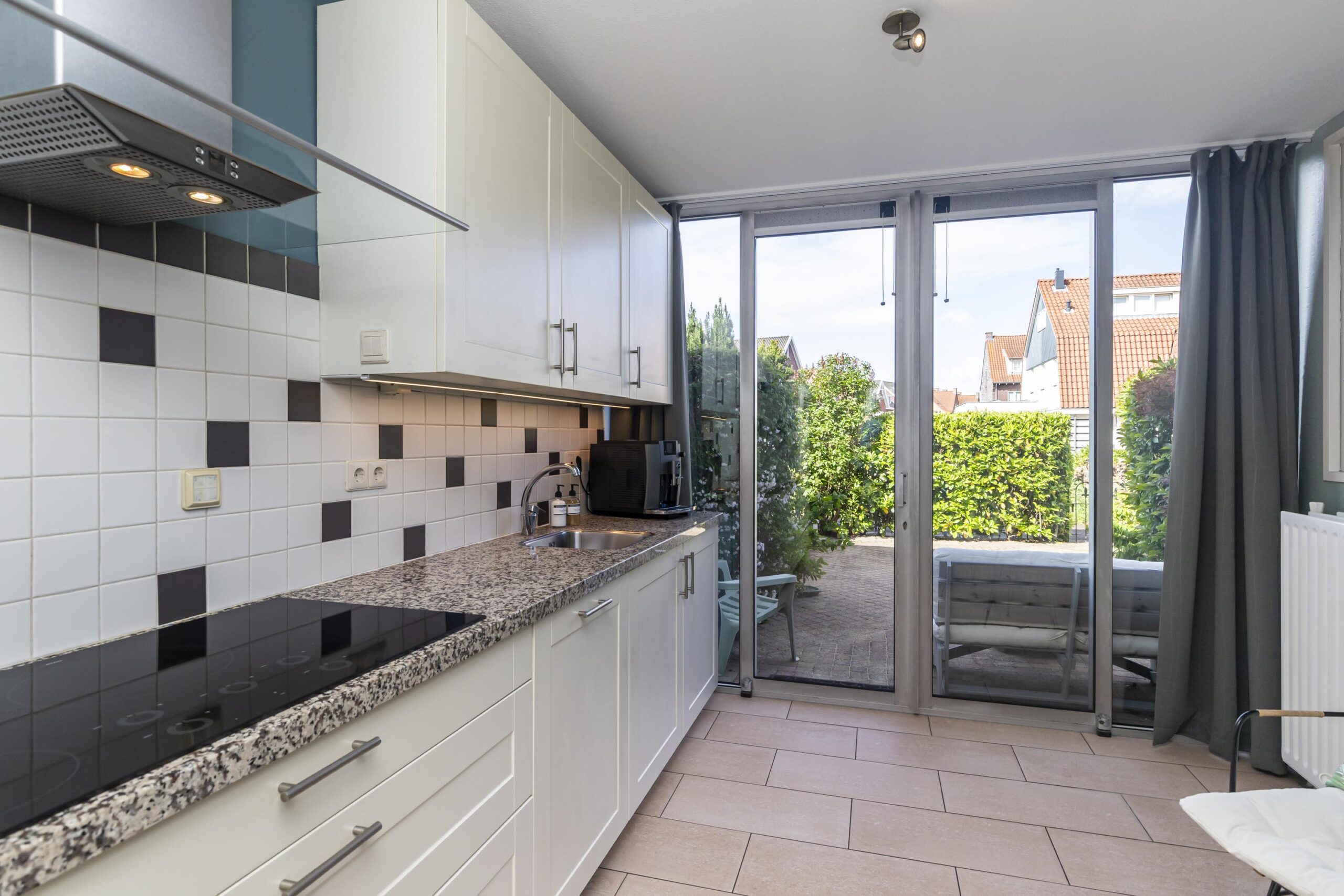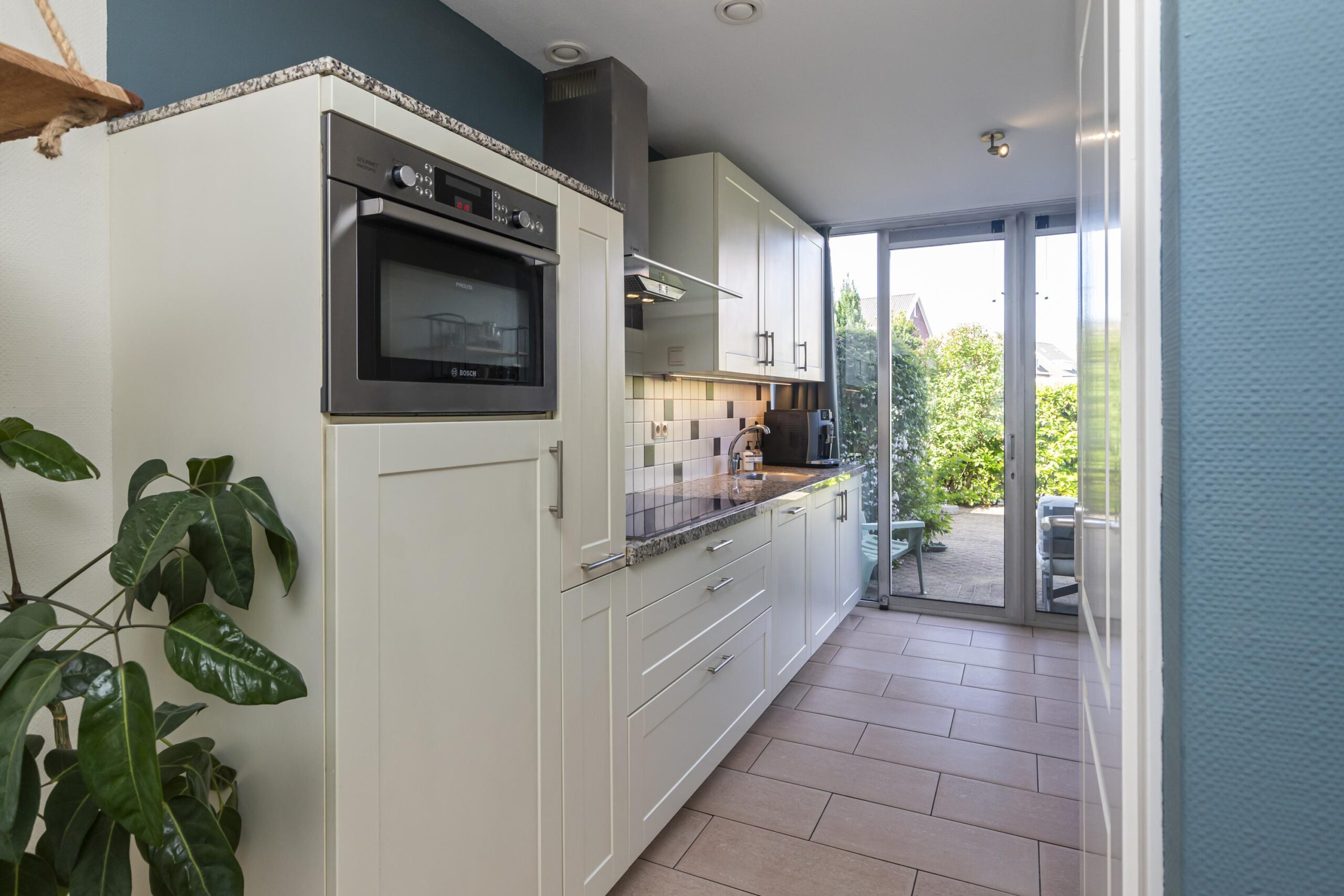 Via de ruime en zonnige voortuin bereik je de entree. In de hal bevinden zich de meterkast, het toilet met fonteintje en de trap naar boven. De uitgebouwde woonkamer is tuingericht en voorzien van vloerverwarming. Aan de voorzijde ligt de keuken met een praktische vaste kast en diverse inbouwapparatuur zoals een inductiekookplaat, afzuigkap, vaatwasser, combi-oven en koelkast. Vanuit de keuken loop je zo de zonnige verzorgde voortuin in.