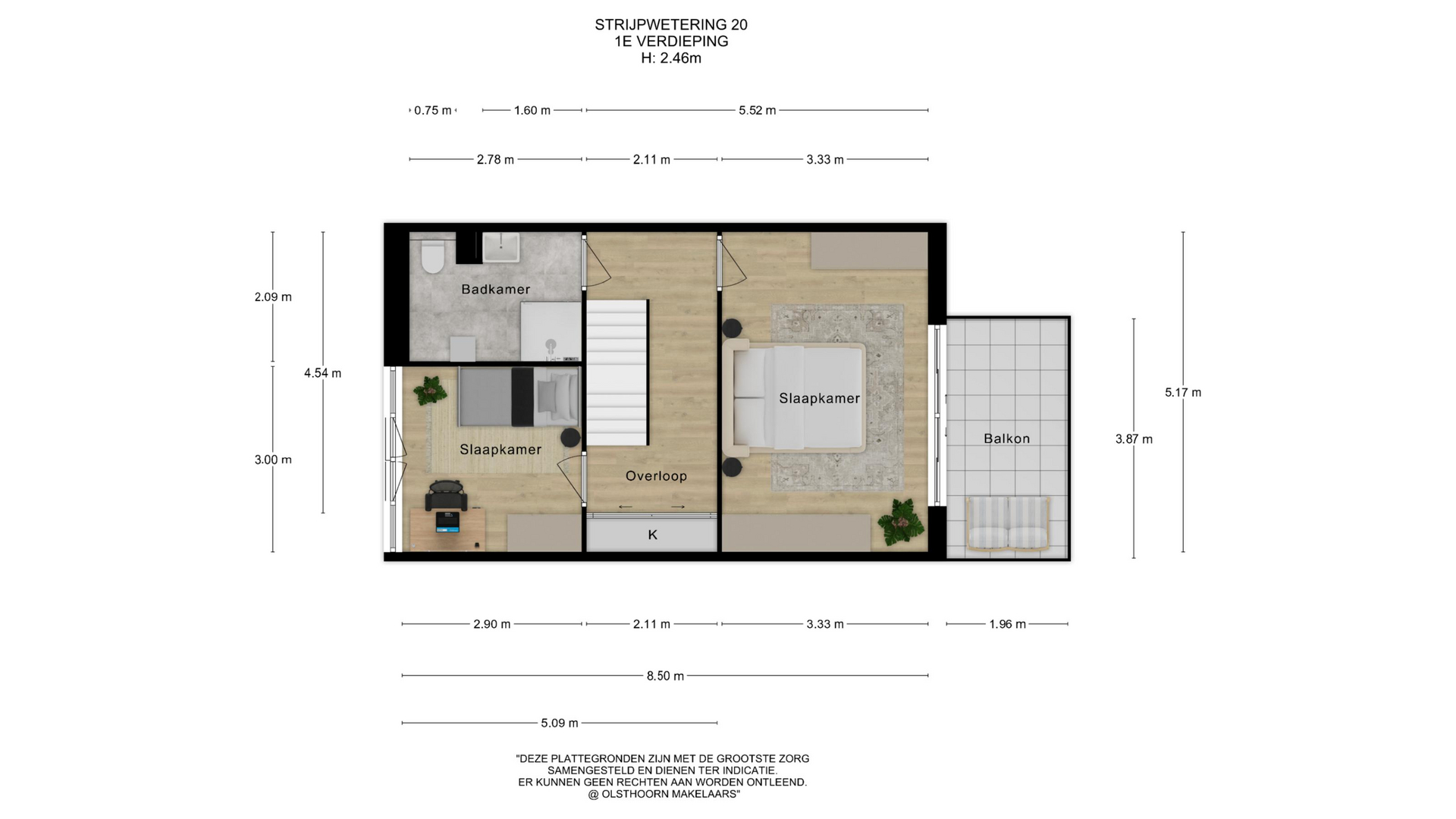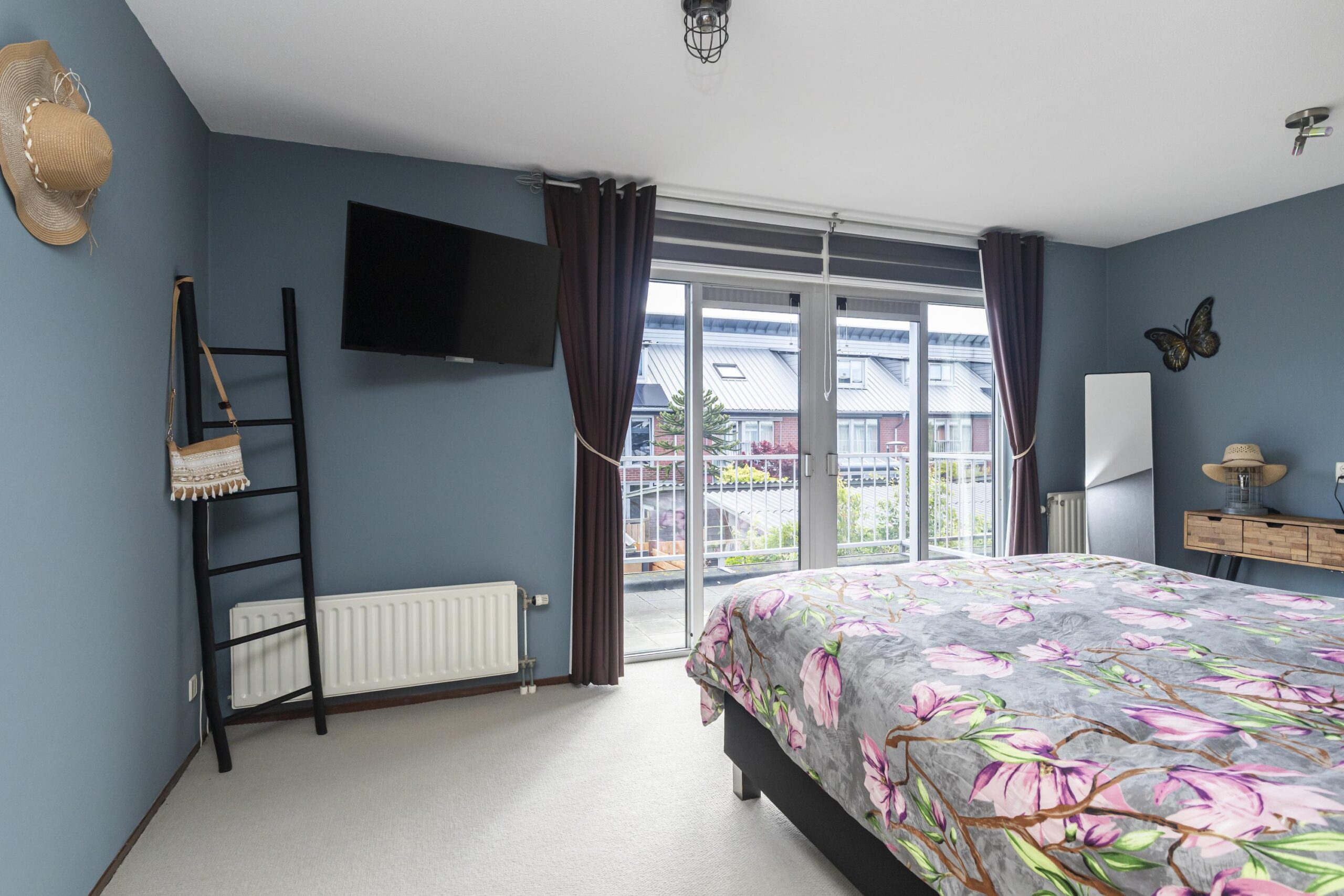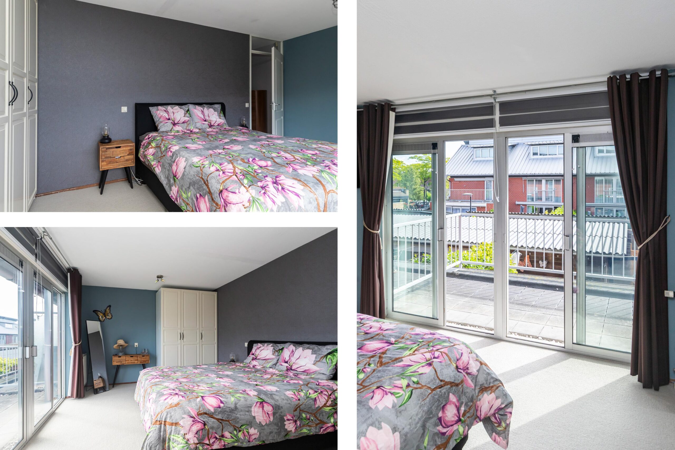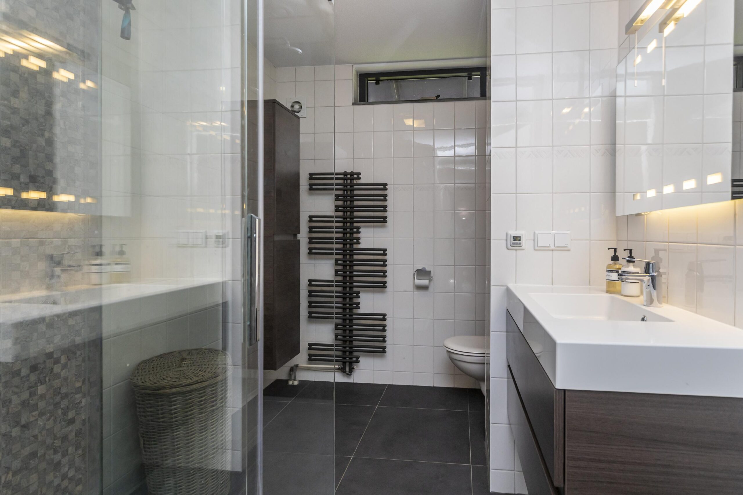De overloop geeft toegang tot twee slaapkamers en de badkamer. Aan de voorzijde ligt een lichte slaapkamer met Frans balkon en schuifdeur. De ruime hoofdslaapkamer aan de achterzijde strekt zich uit over de volle breedte van de woning en heeft toegang tot een dakterras. De moderne badkamer is volledig betegeld en uitgerust met een inloopdouche, toilet, wastafelmeubel met lades en vloerverwarming.