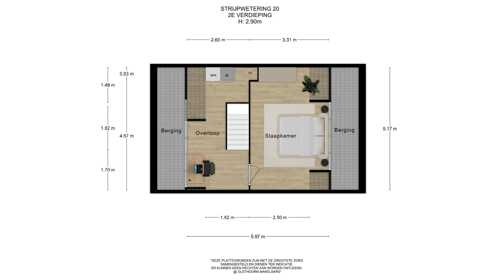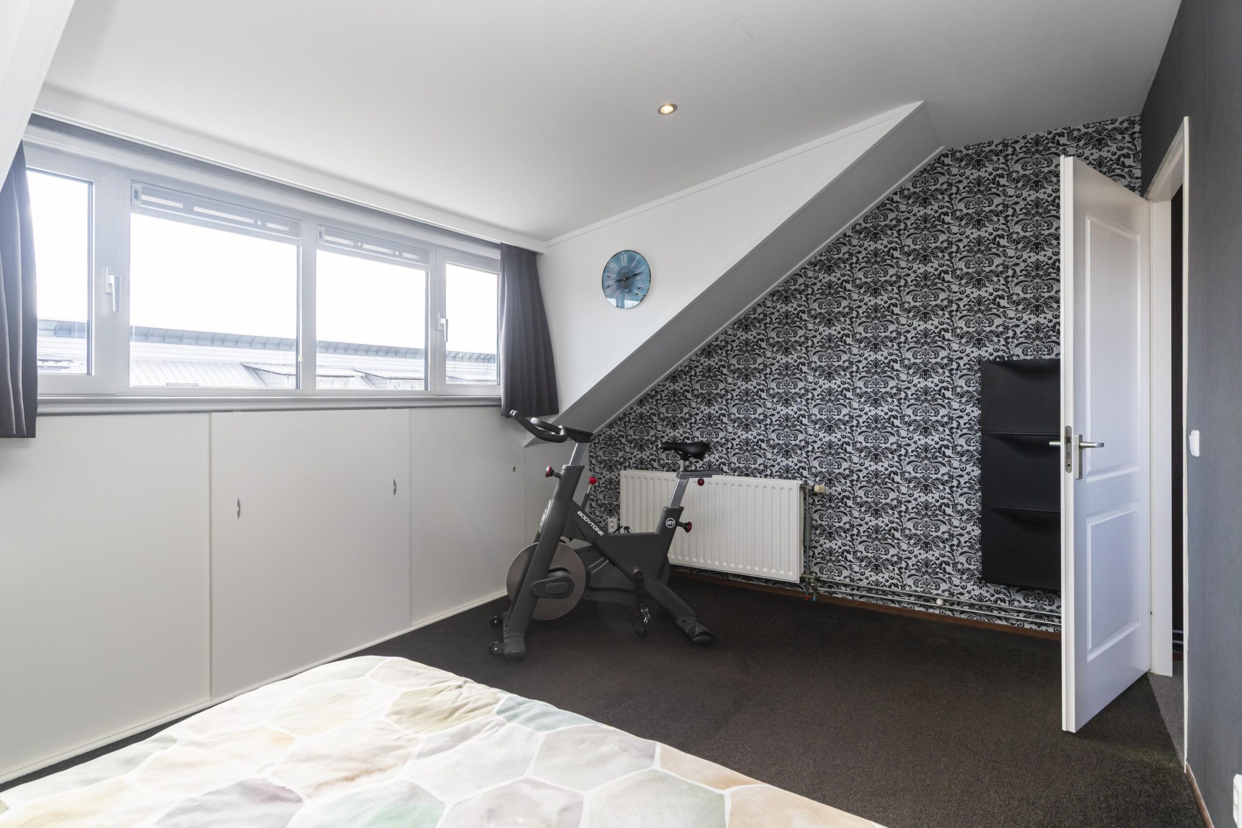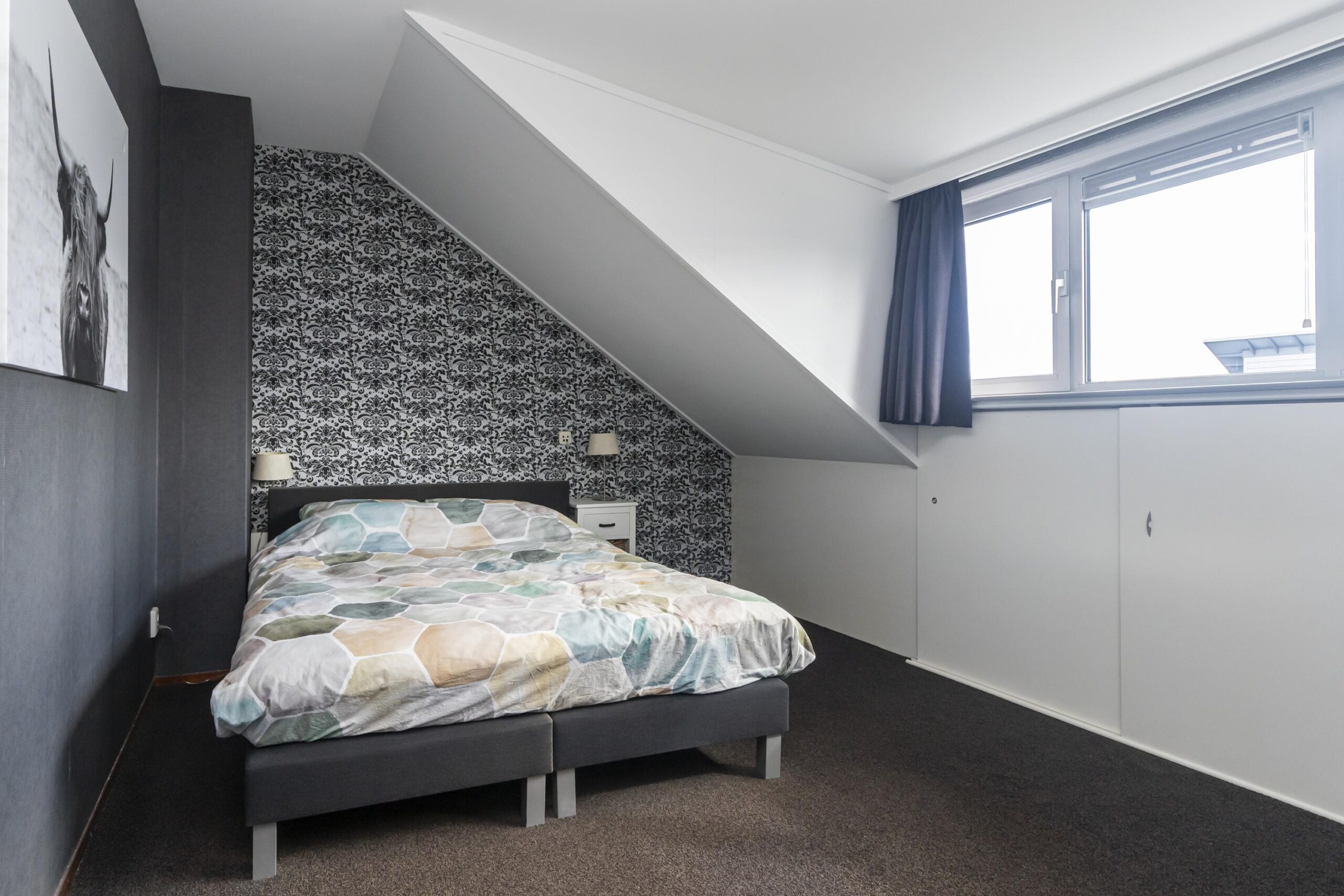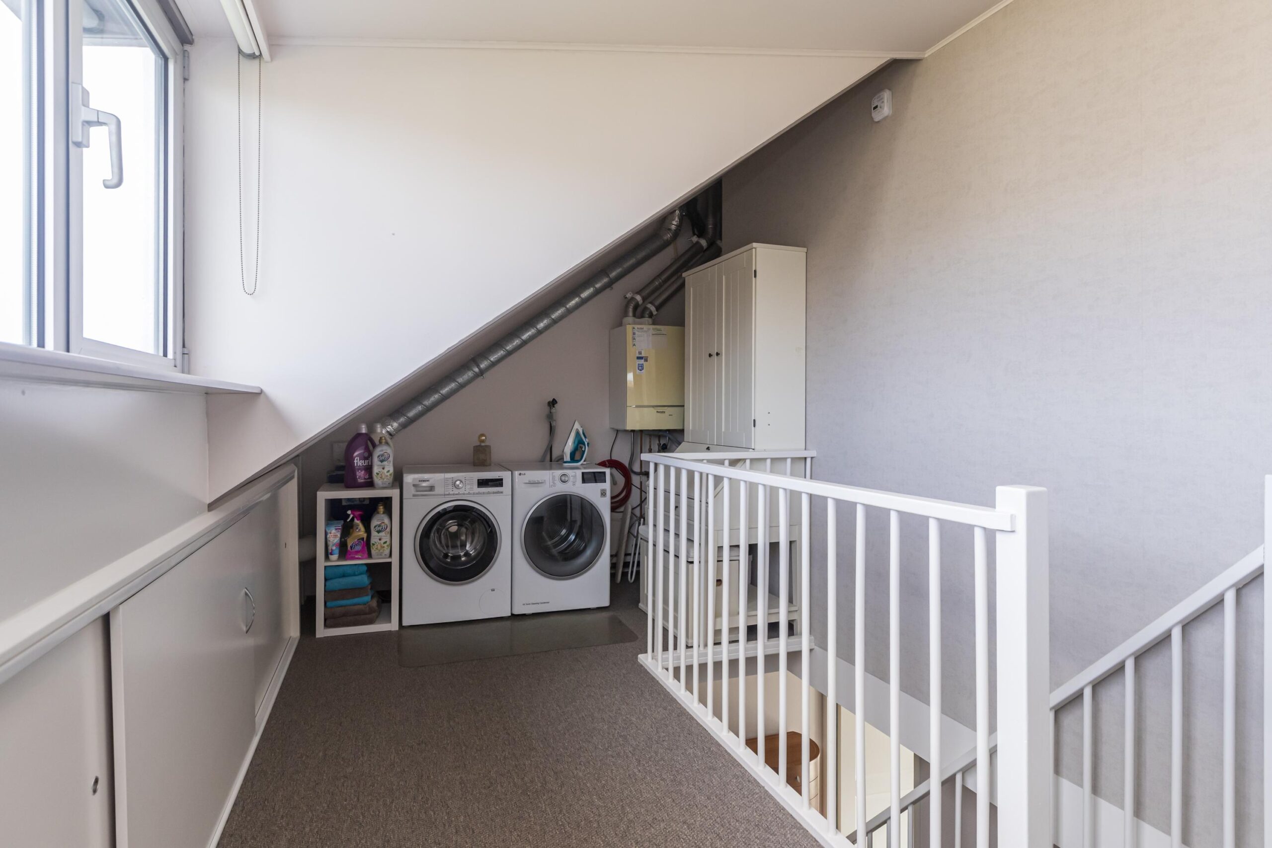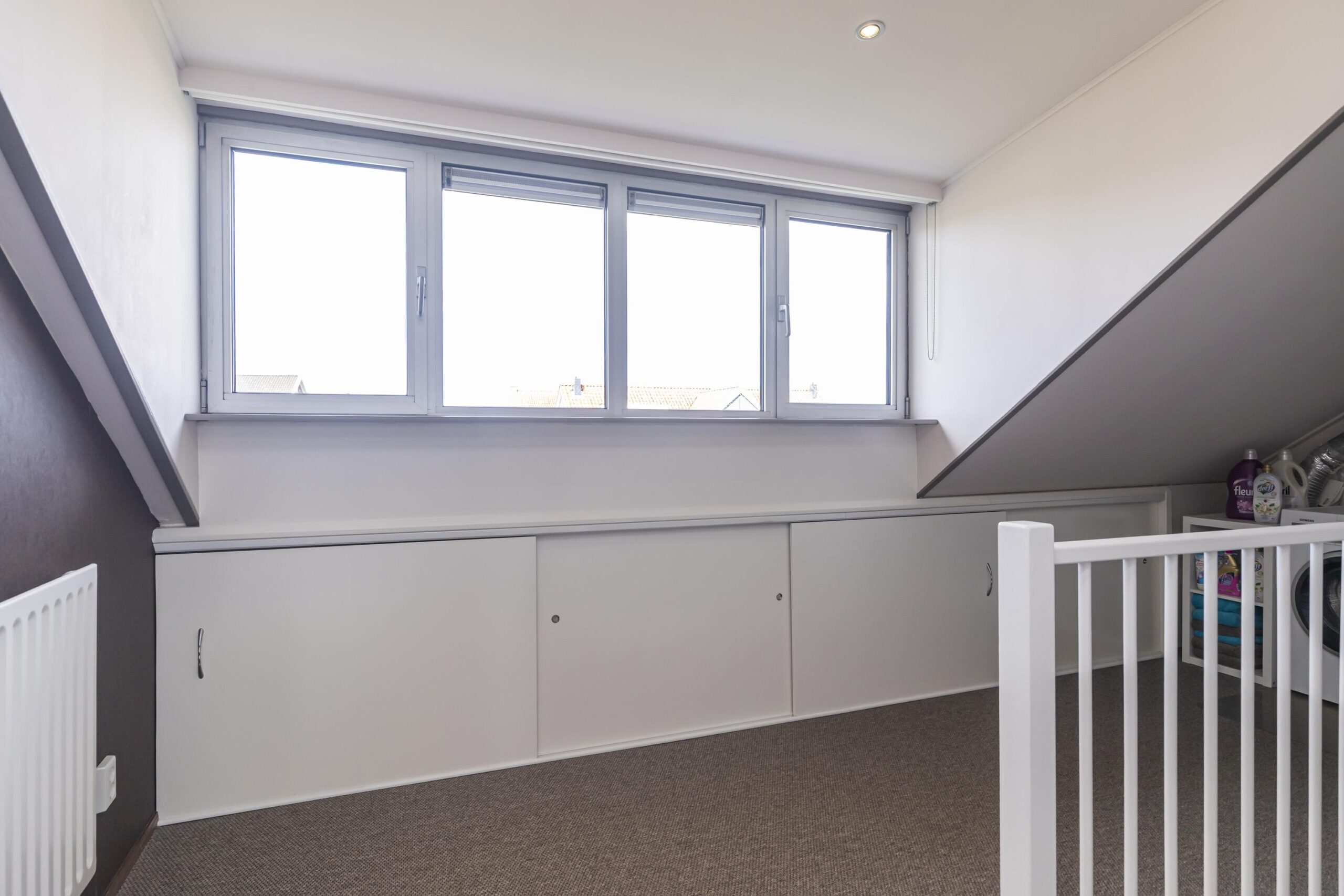 Dankzij de dakkapellen is deze verdieping verrassend ruim. Hier vind je een derde ruime slaapkamer over de volle breedte van de woning met veel bergruimte achter de knieschotten. Op de overloop zijn de aansluitingen voor wasmachine en droger, de cv-installatie en ook hier opbergruimte achter de knieschotten.
